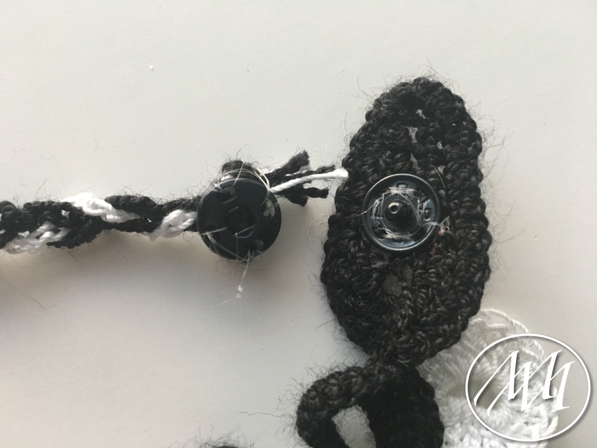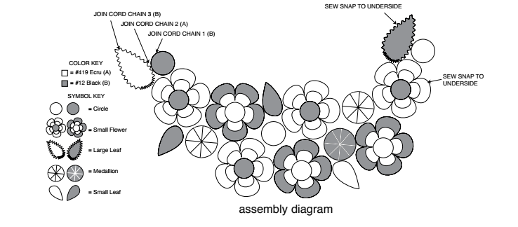 Sew snap socket onto knot and corresponding stud onto flower petal as shown in diagram. Sew second snap socket onto braided strand approximately 1” from first snap. Sew corresponding stud to tip of leaf as shown in diagram. Weave in all ends. NOTE: I chose not to add the second snap as suggested.