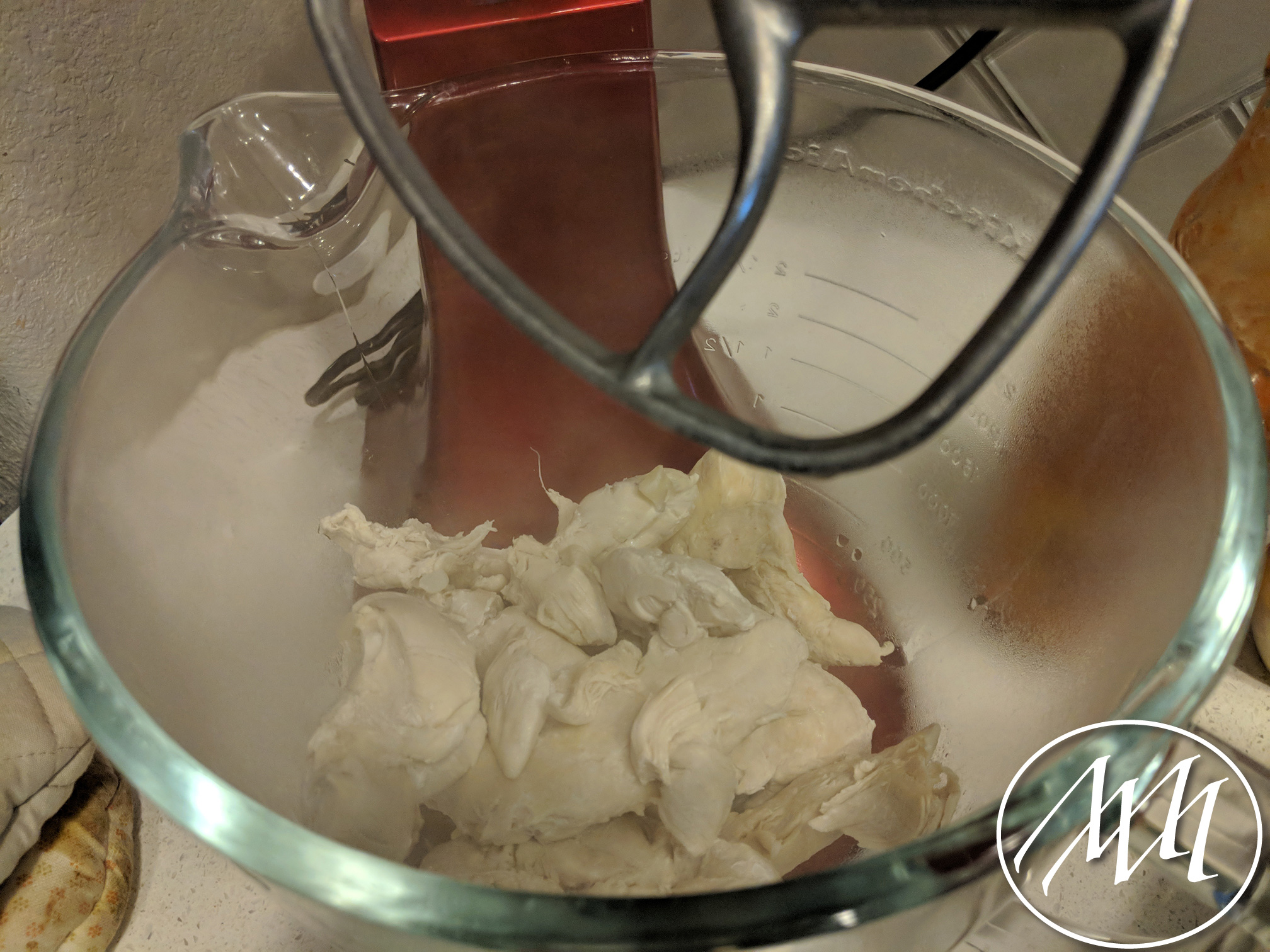After the chicken is cooked, add your chicken to your KitchenAid mixer with the Paddle attachment and shred chicken. You can also just drain your pot and use a hand mixer, or shred the chicken by hand with a knife and fork.