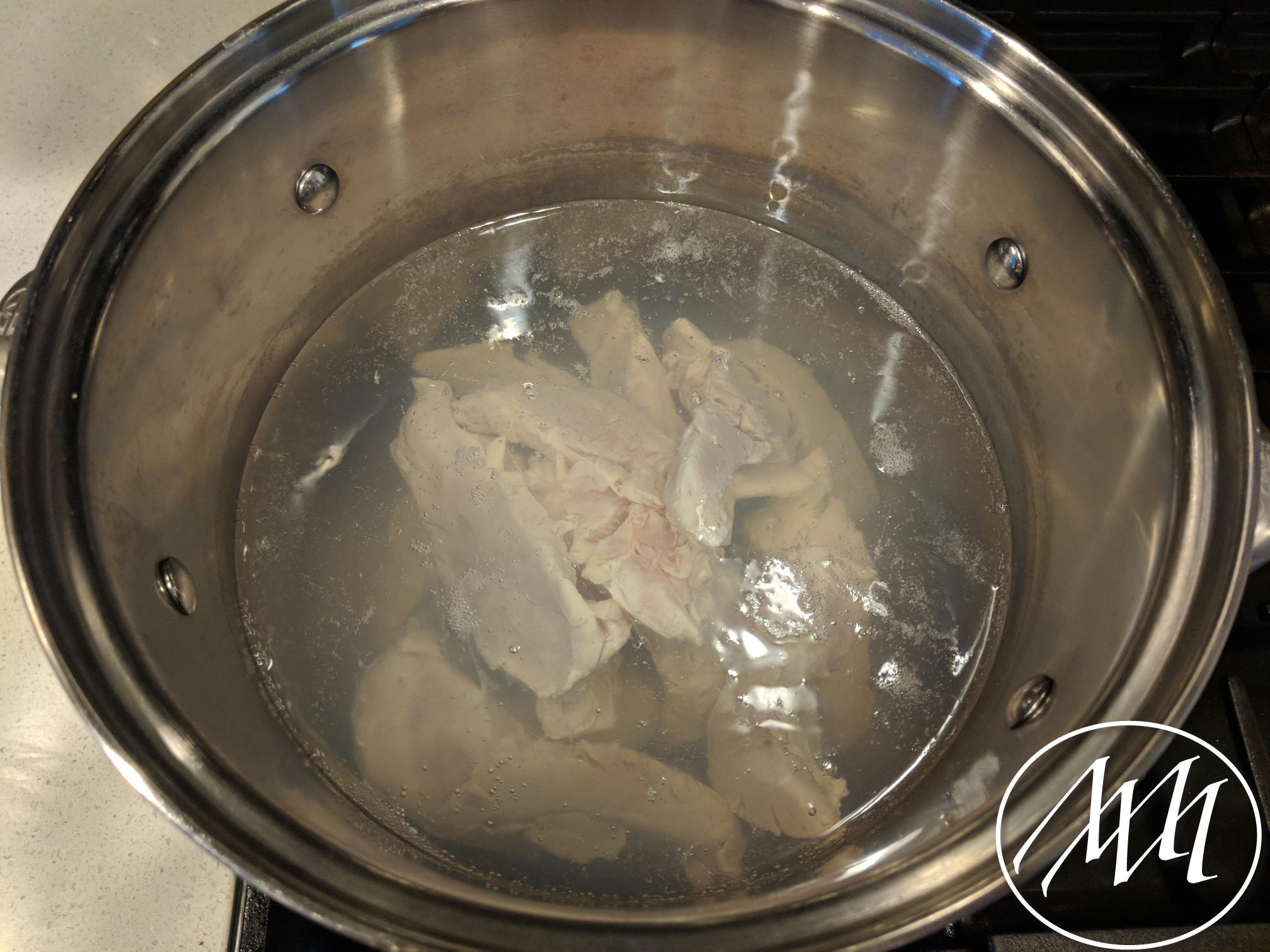 Bring a large pot of water to boil over high heat. Once it comes to a boil, add your chicken and turn down the heat to medium to low. Cook the chicken for about 25-30 minutes or until there is no pink left. (Note: you can also use frozen chicken for this process and it works just the same, however, you’ll need to cook the chicken for  ~45 minutes)