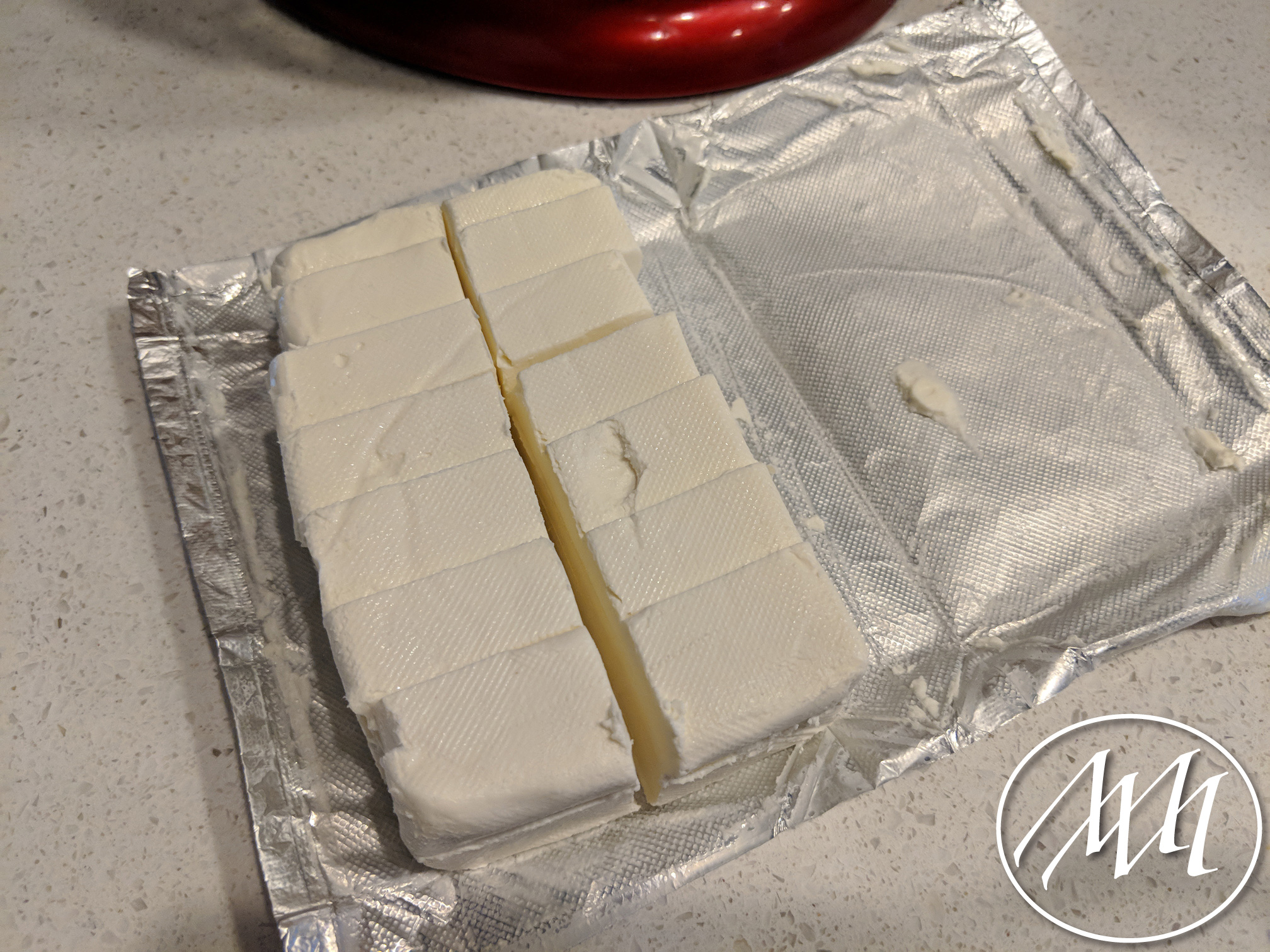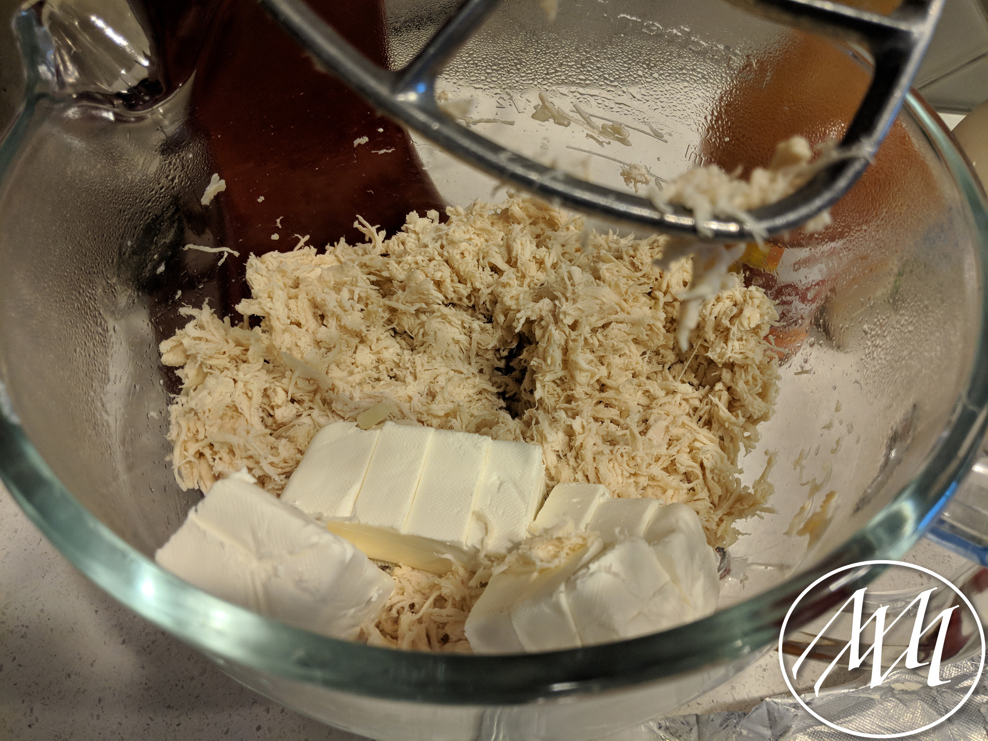 Cubed Cream Cheese  Cream cheese and chicken in kitchenaid mixer