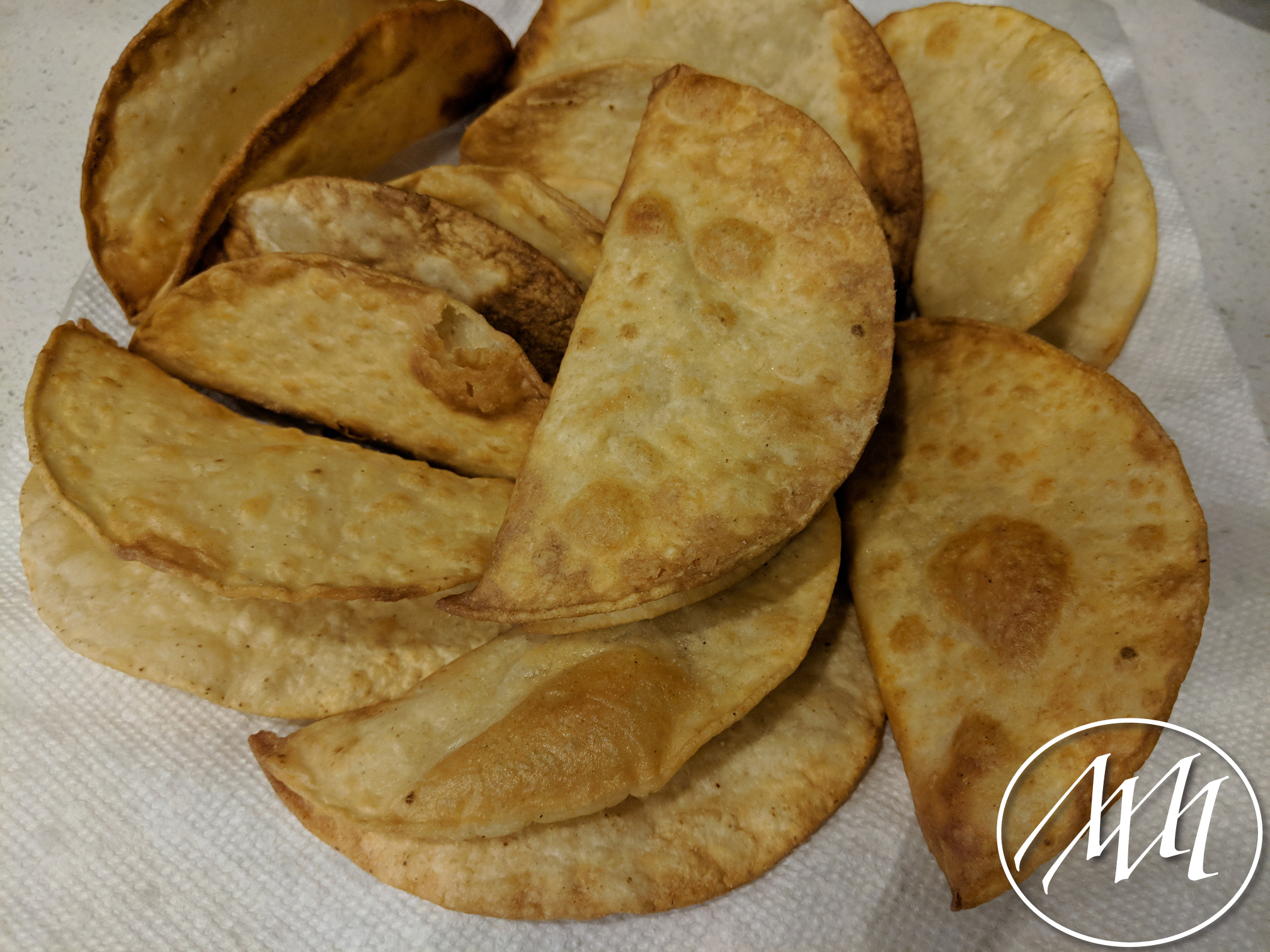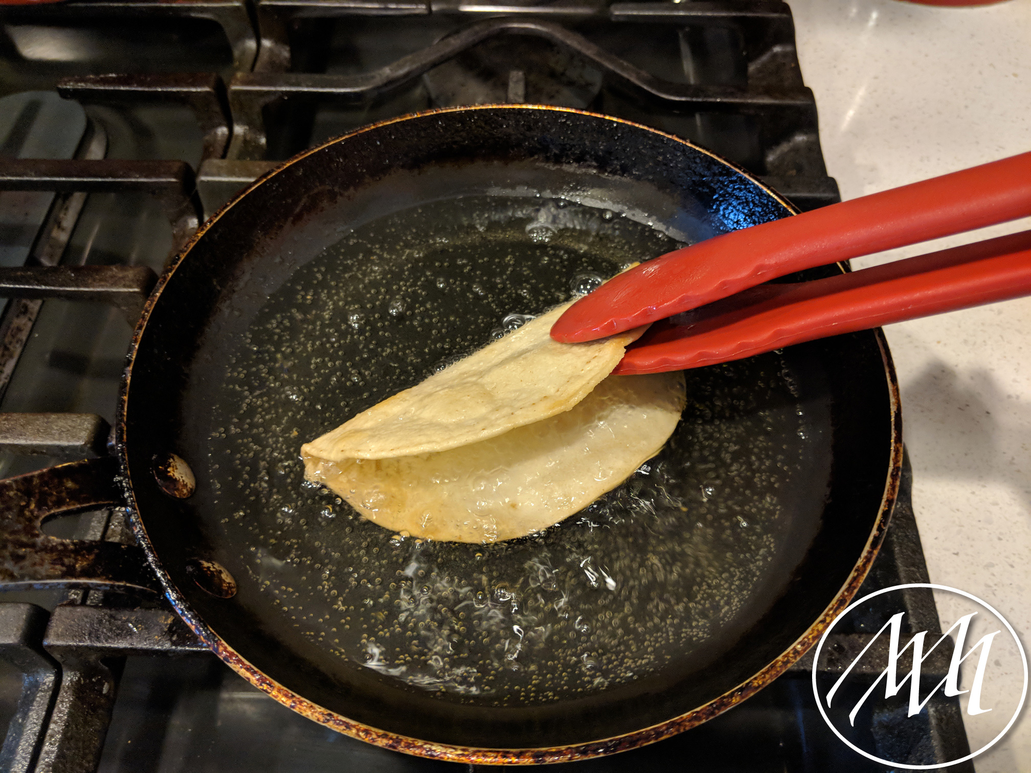 Add your tortilla and hold slightly bent in half until crispy. Flip over and repeat until it’s done.