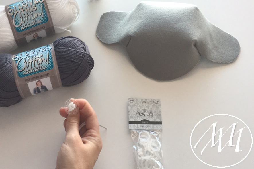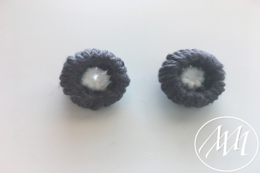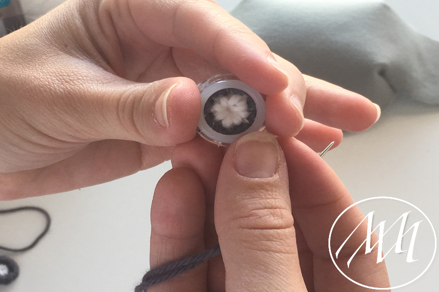 Using some grey yarn and the same needle, weave the yarn into the outer circle of the creative button. Place the plastic ring on top of the button to add some dimension and weave the grey yarn around the farthest circle of the button. Tie off yarn and cut excess. Repeat for second button.