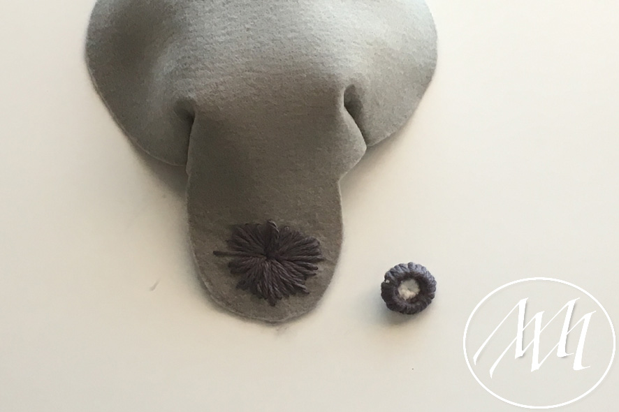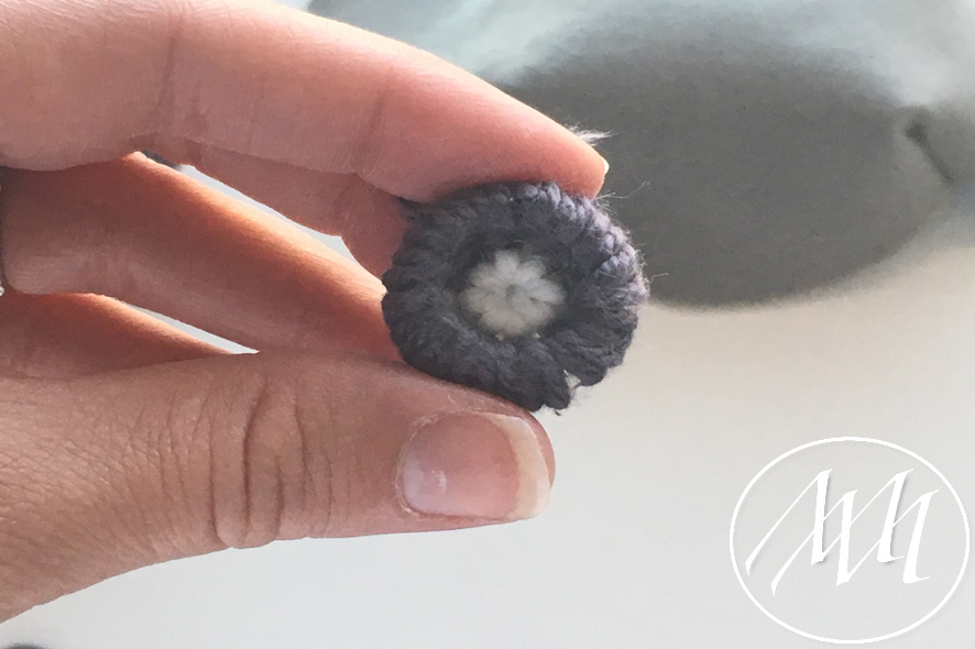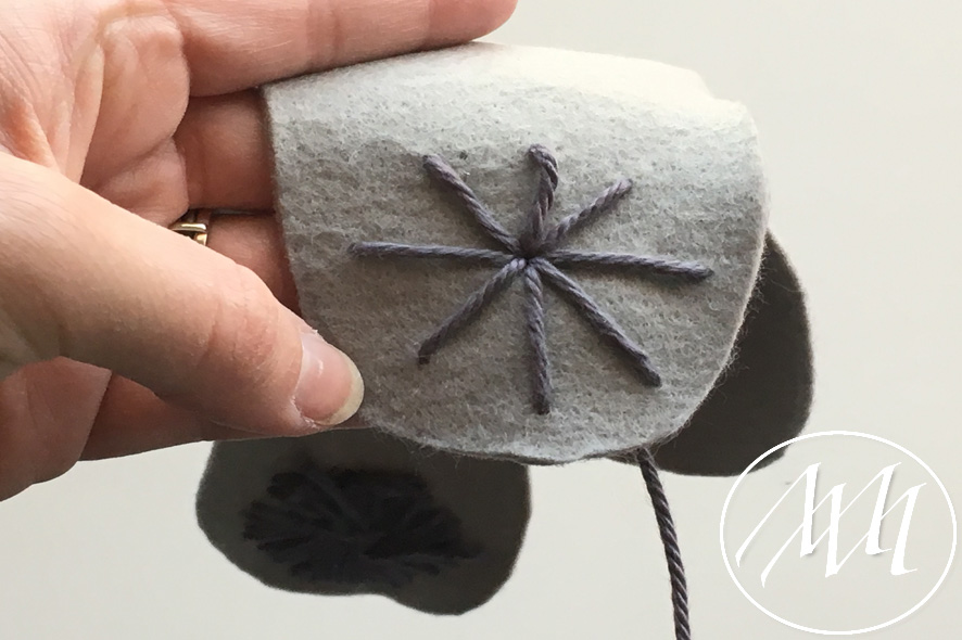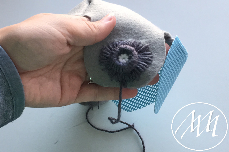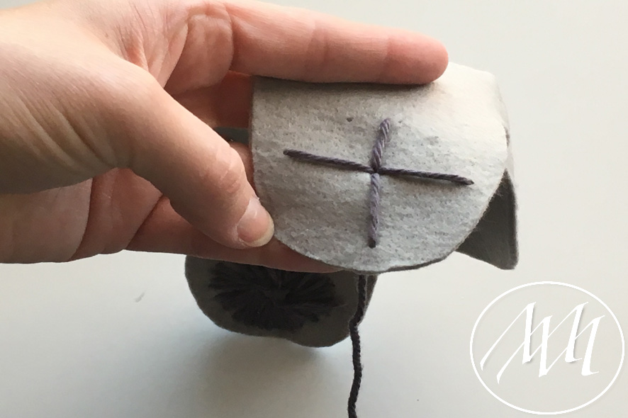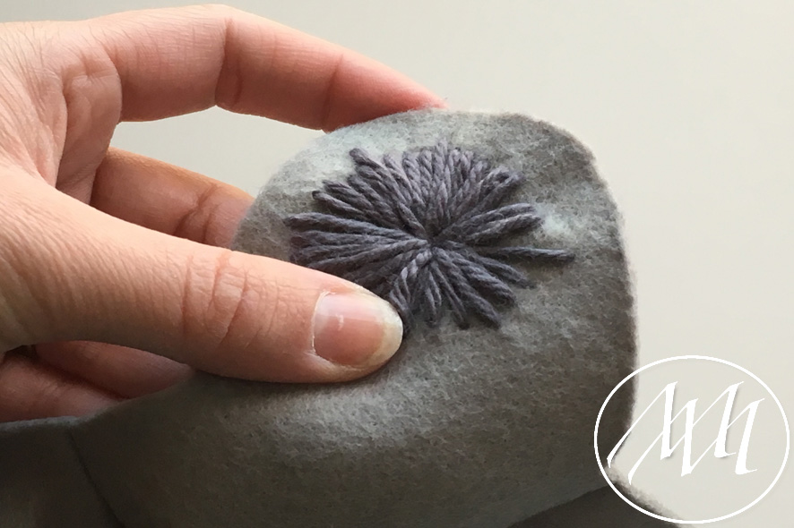 Mark on the hat flap where you want to add your button. With your knitters needle and some grey yarn, embroider a full circle on the flap. You can start by making the four corners and then filling in the gaps until you have gone all the way around. Tie it off in the back. NOTE: You may have to massage the felt a little bit to get the needle through the felt. This is because the felt is 2 mm.
