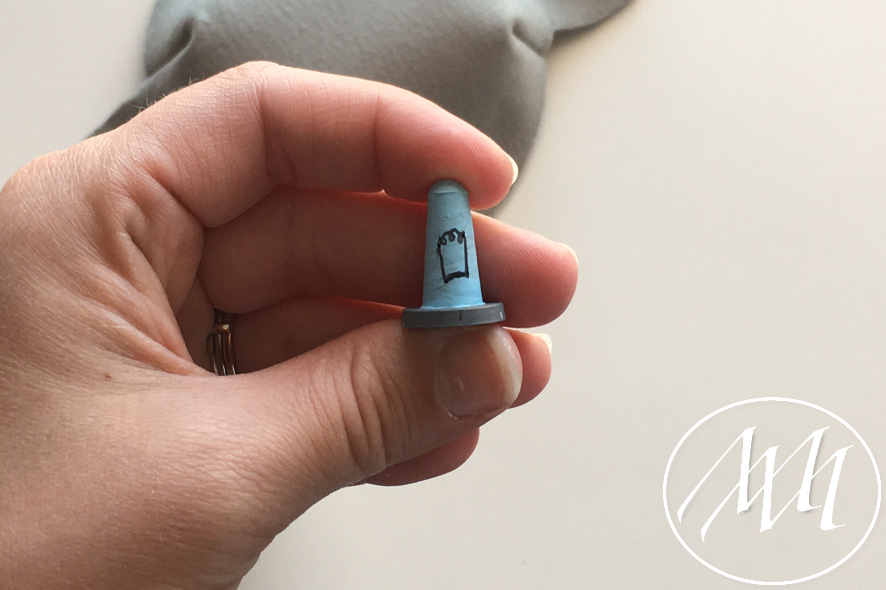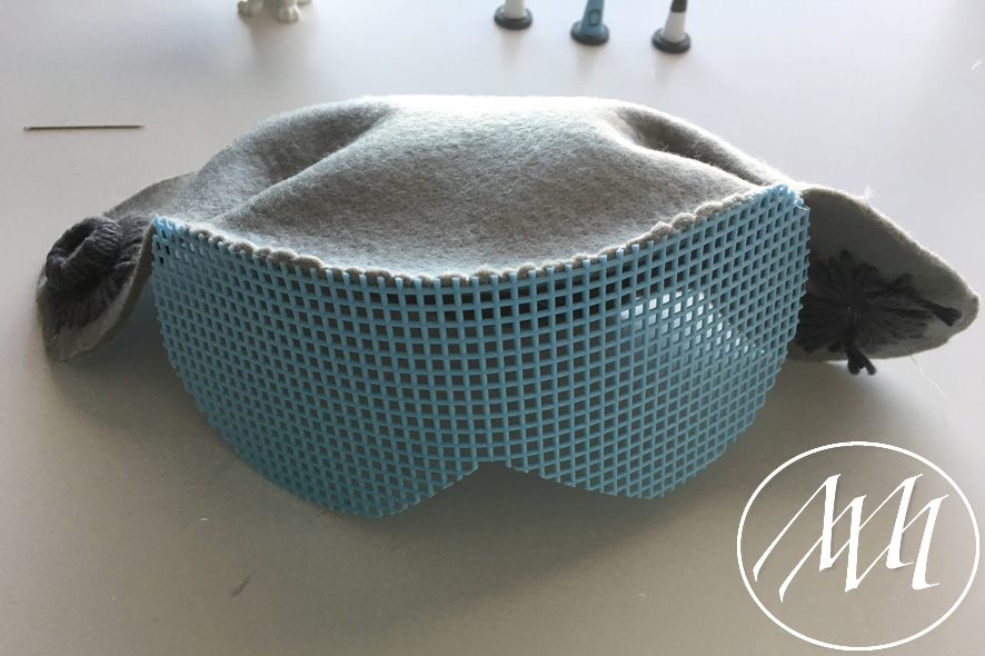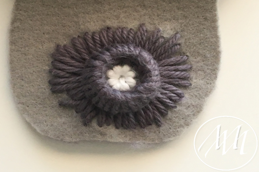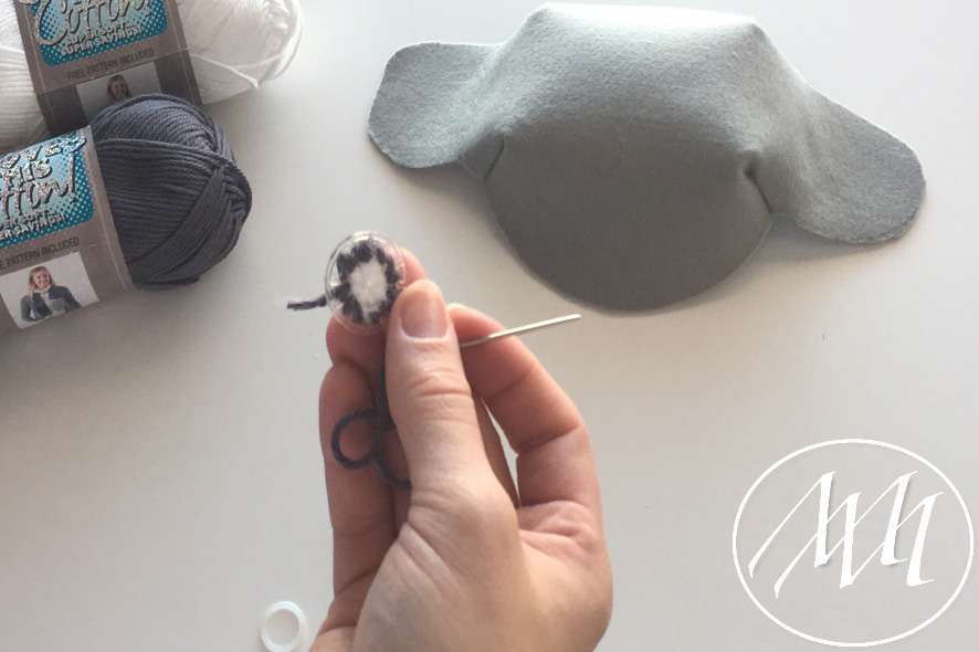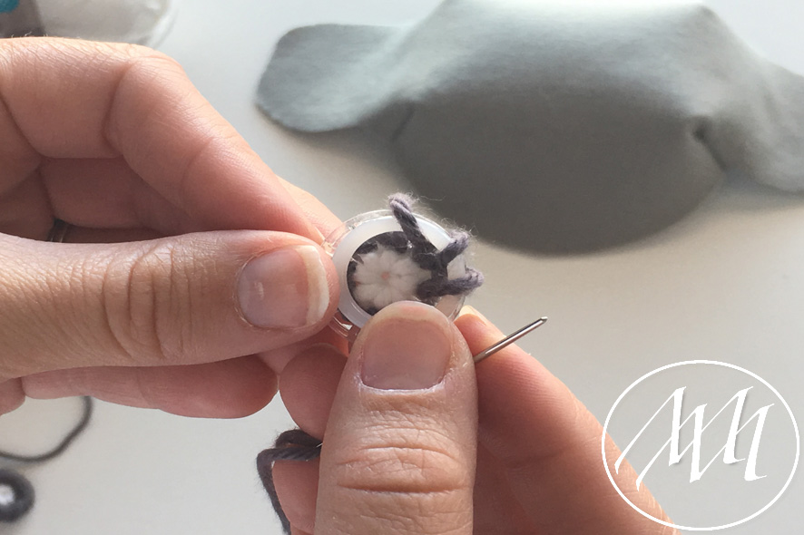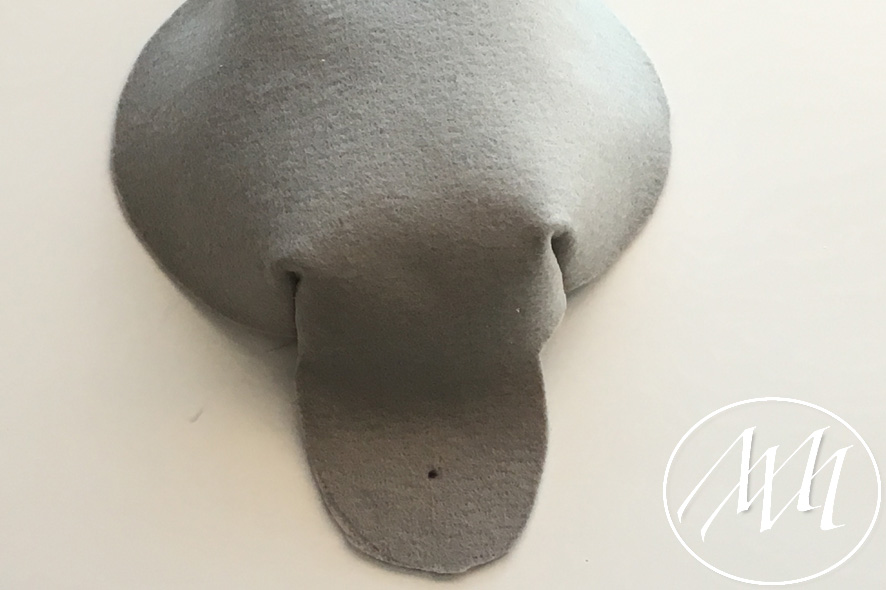 Mark on the hat flap where you want to add your button. With your knitters needle and some grey yarn, embroider a full circle on the flap. You can start by making the four corners and then filling in the gaps until you have gone all the way around. Tie it off in the back. NOTE: You may have to massage the felt a little bit to get the needle through the felt. This is because the felt is 2 mm.