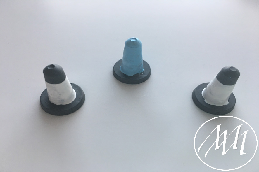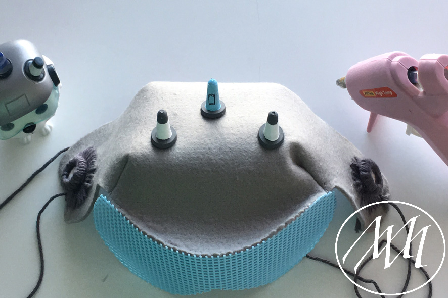 Apply a little bit of hot glue to the bottom to each cone and apply them to the top of the hat. The two white cones on the front corners and the blue one in the middle.