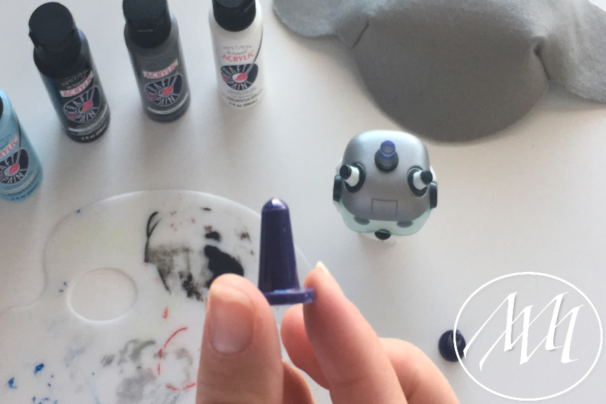 Once they are dried, peel off the tape. Paint the two cones white in the middle and the third one blue, all the way to the top. You may have to do several coats to get full coverage. Allow time to dry.