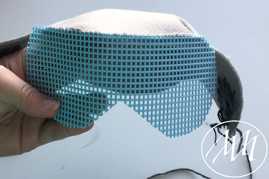 Using your transparent thread and a sewing needle, sew the glasses to the hat starting in the center of the hat. Loop the thread around and through the canvas holes to the felt. If you feel it needs extra securing, you can do two loops per canvas hole.
