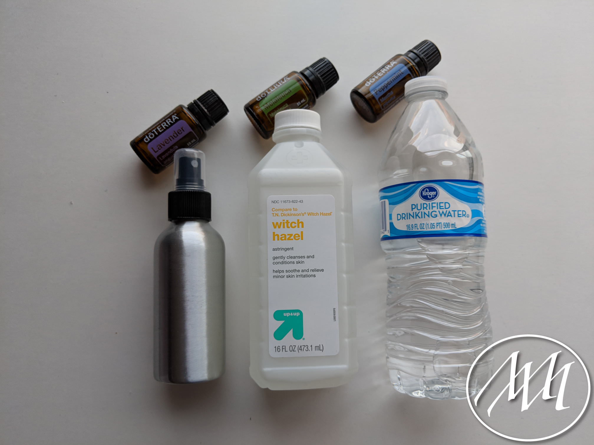 Mix the water and witch hazel together in the spray bottle. Add in the 10-15 drops of essential oil and mix well. I used the Melaleuca in my mixture!