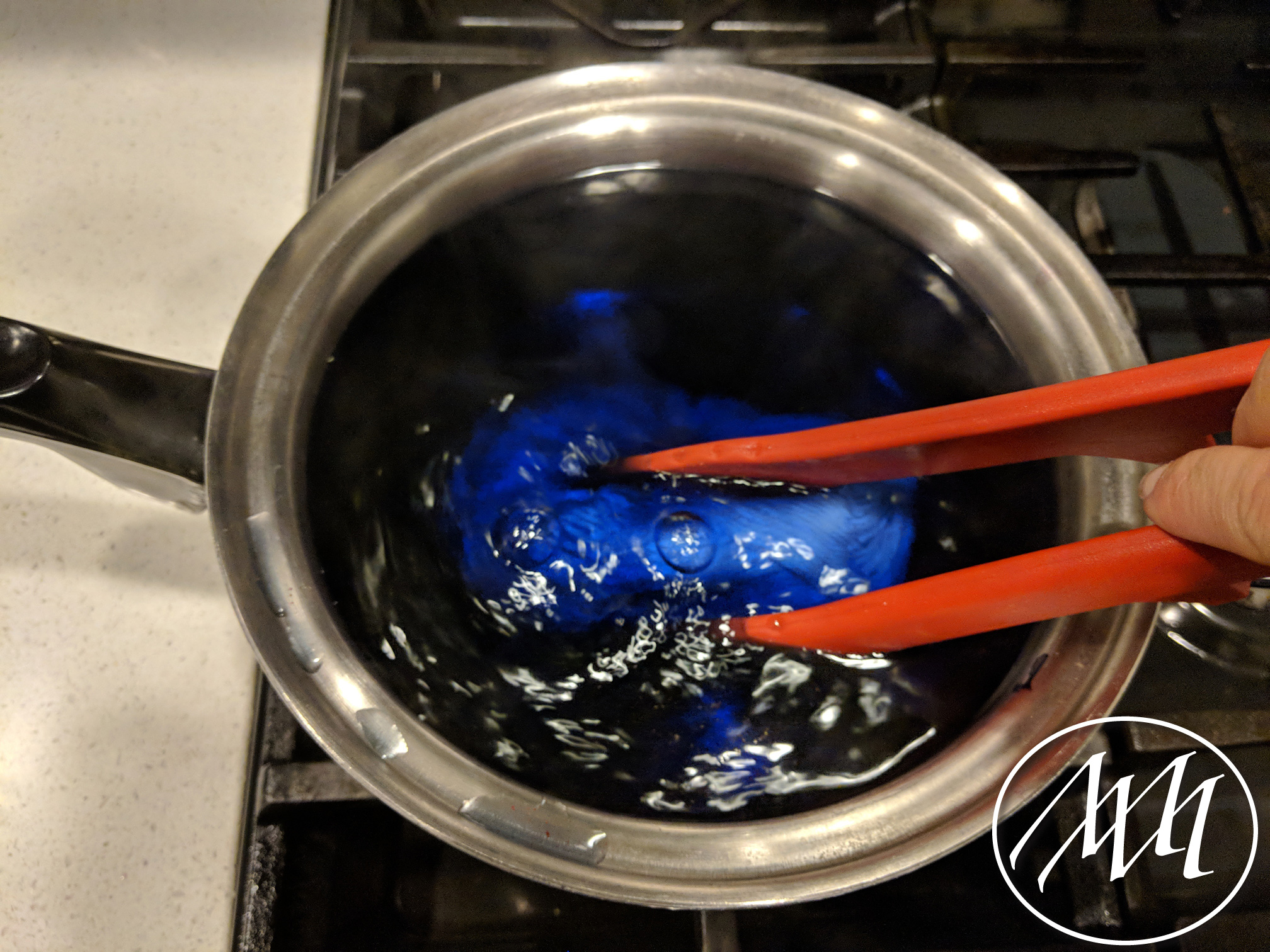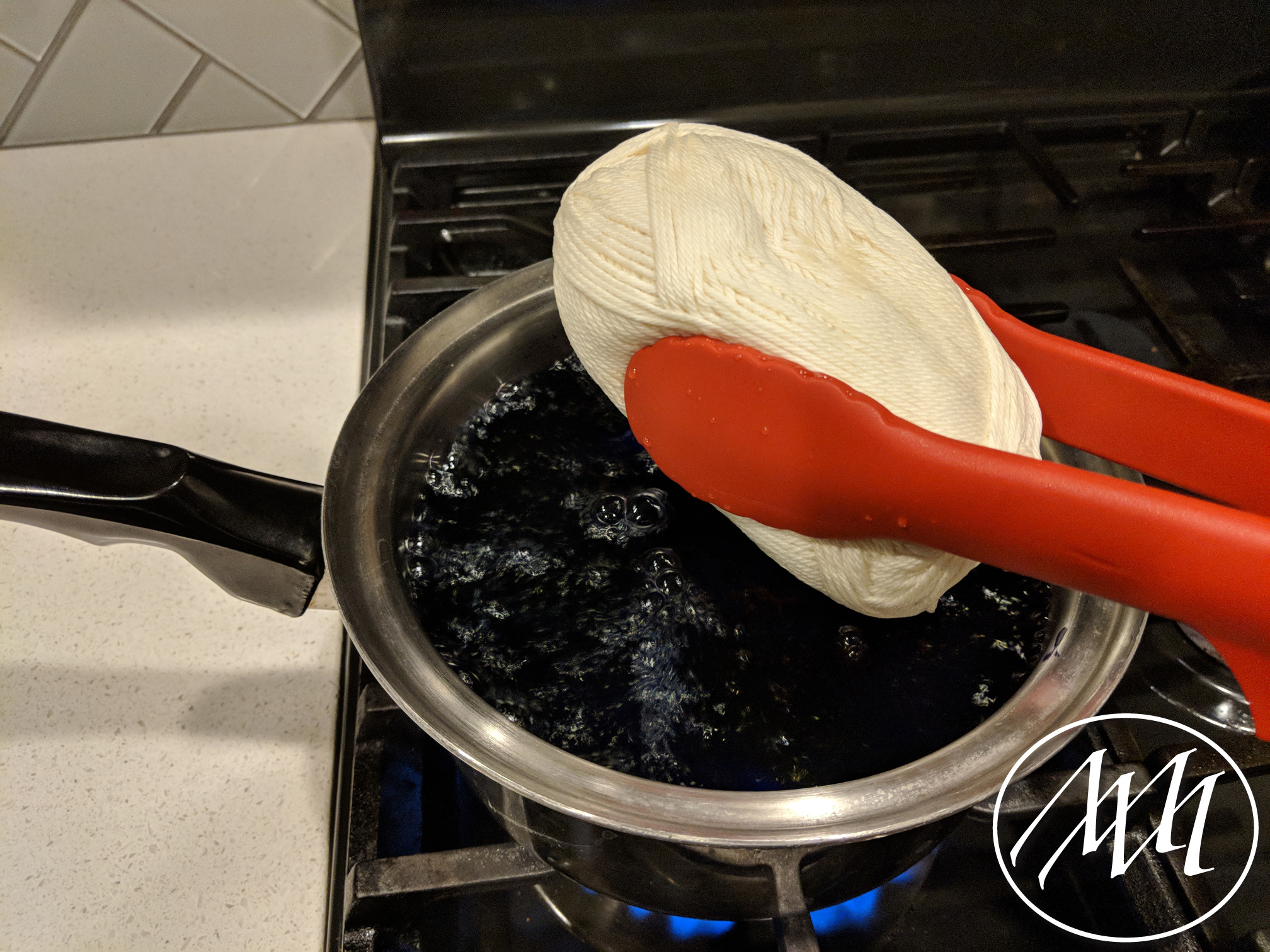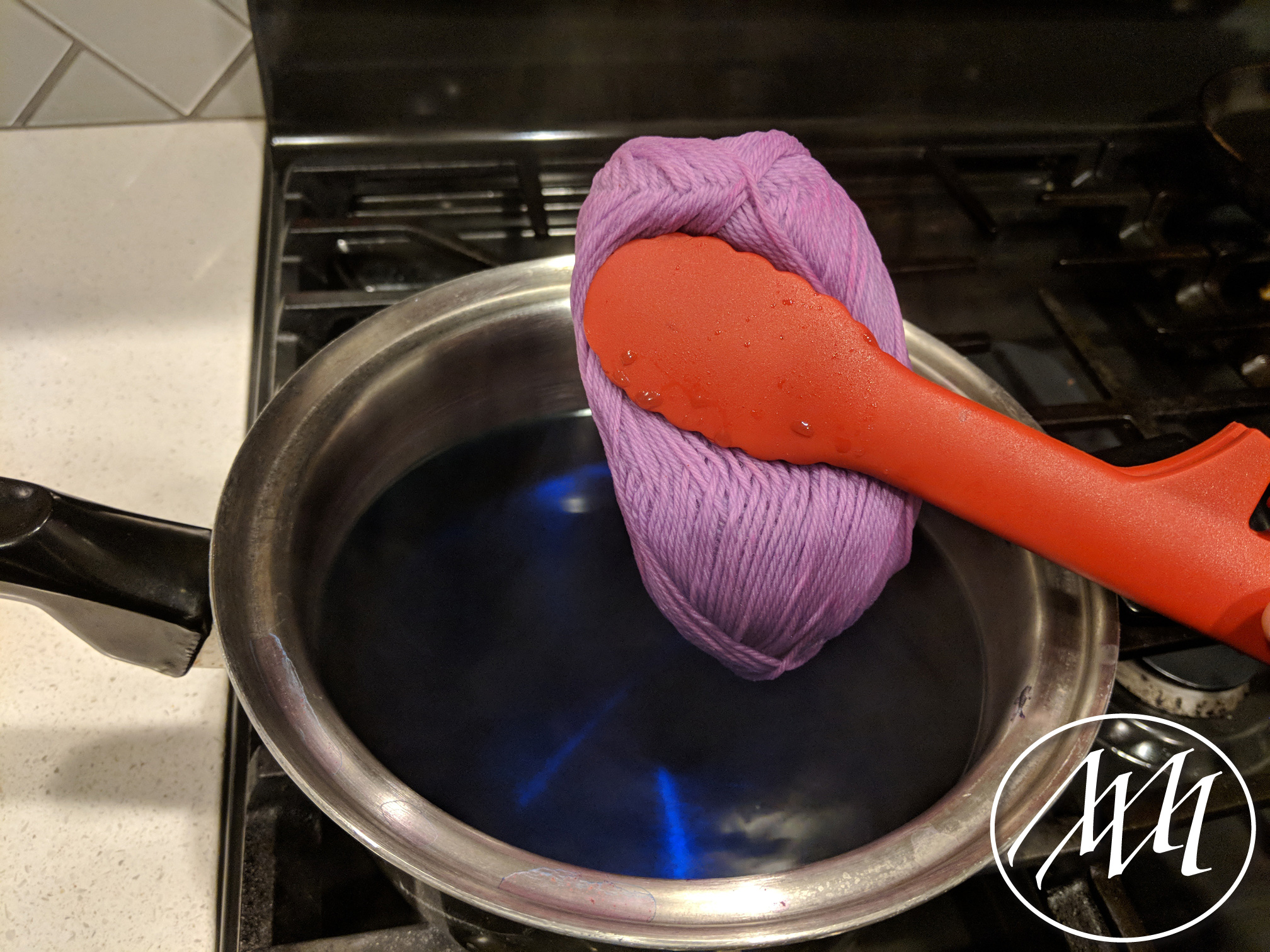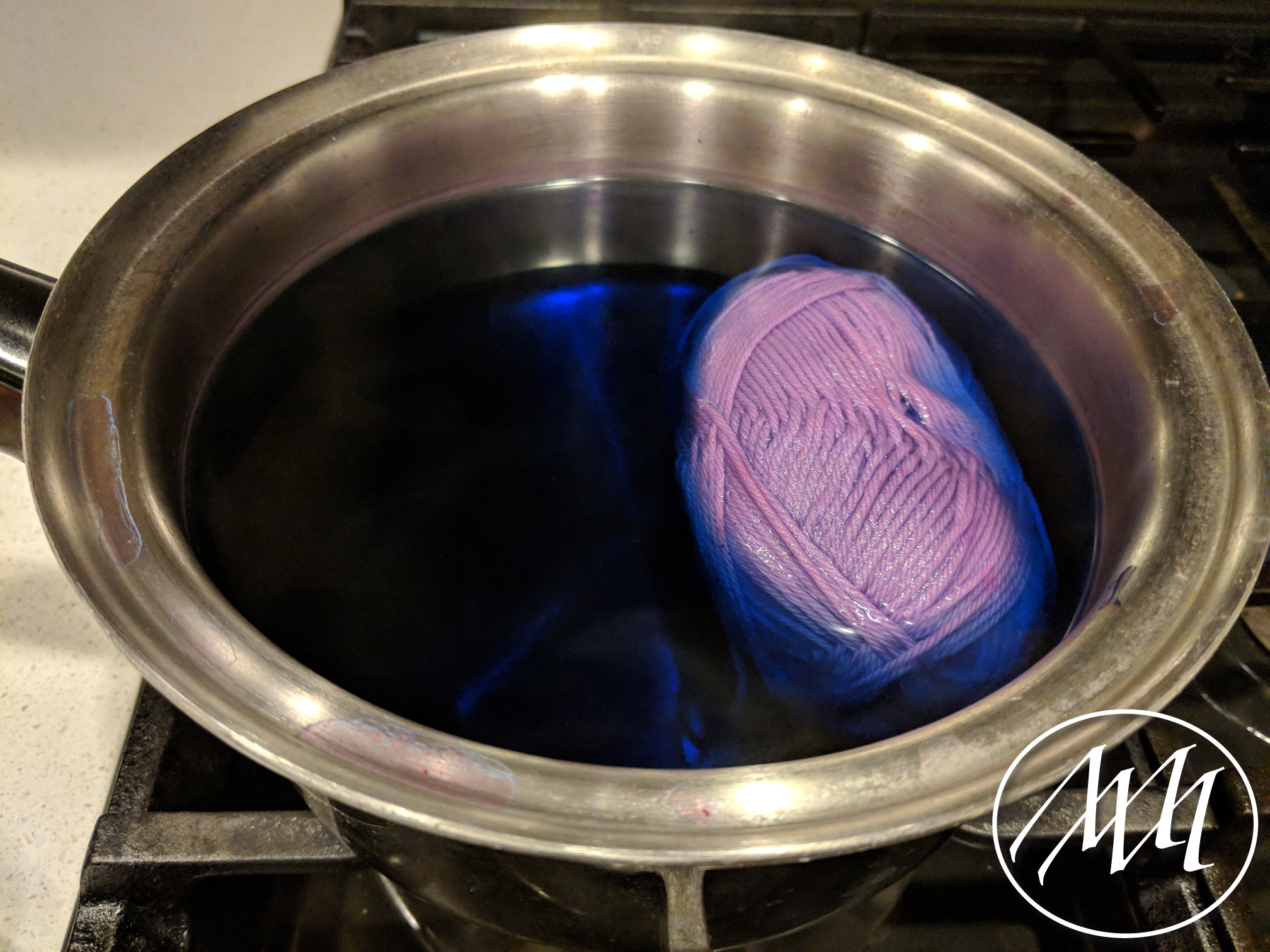 Turn the burner down to medium-low and add your yarn. Submerge the yarn in the hot water and allow to stay in the pot for about 30 minutes. I kept flipping mine every 10 minutes so all the yarn had a chance to get the coloring.