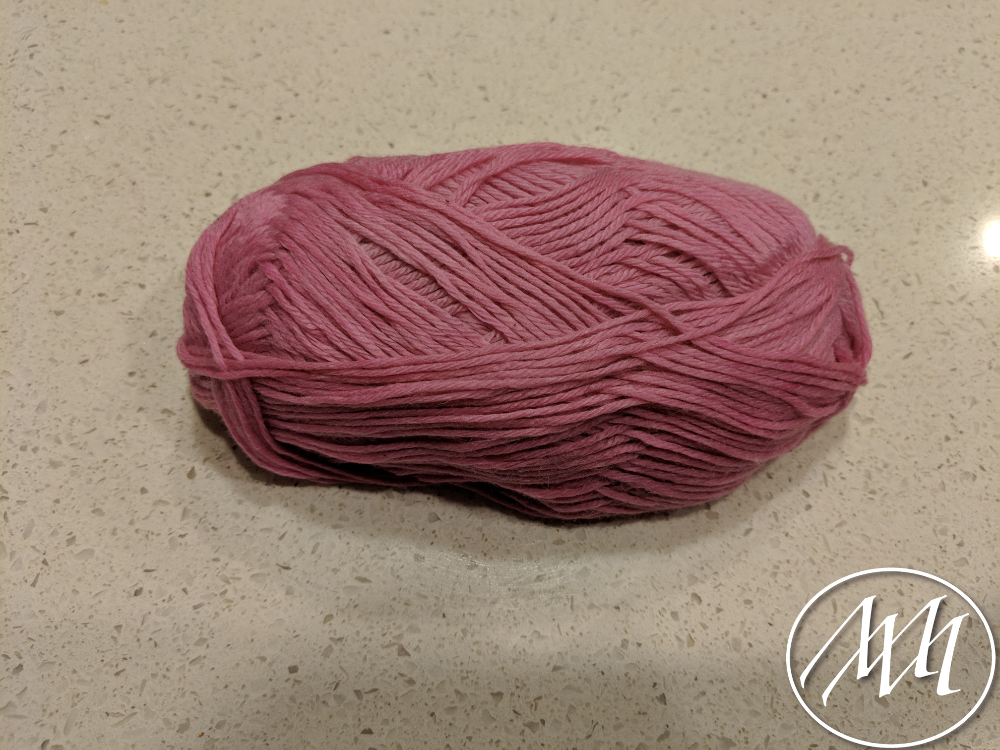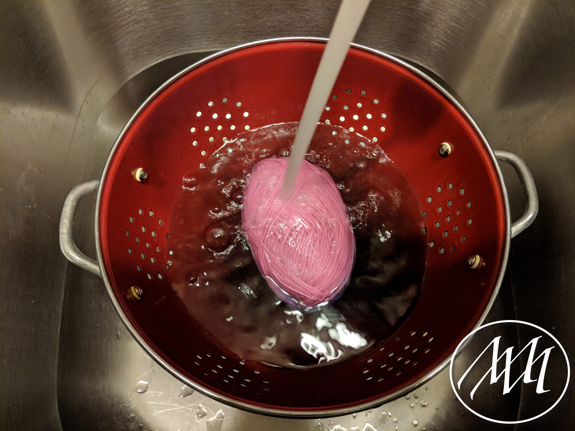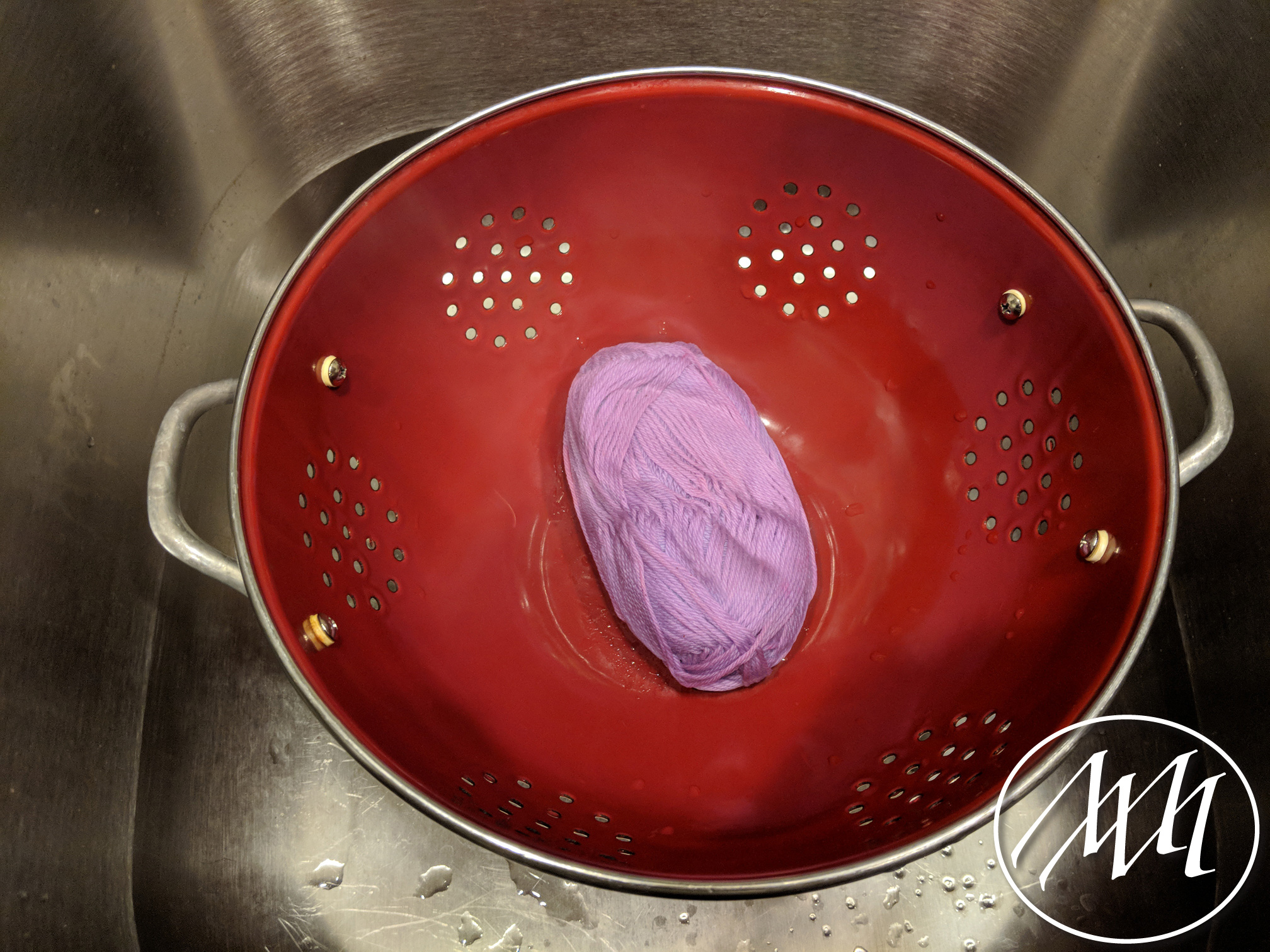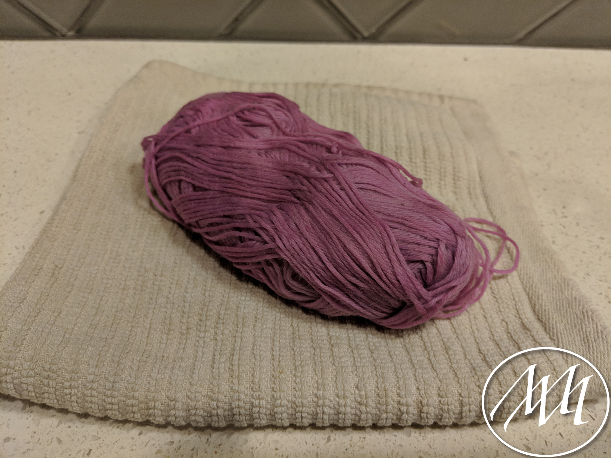 Rinse your yarn in cold water to get any excess dye out of the yarn. I was a little surprised to see that the purple hue of my yarn went away when I rinsed mine and it was more of a pink color! This could also be because it’s a cotton yarn and didn’t take the color as well as wool blends do.