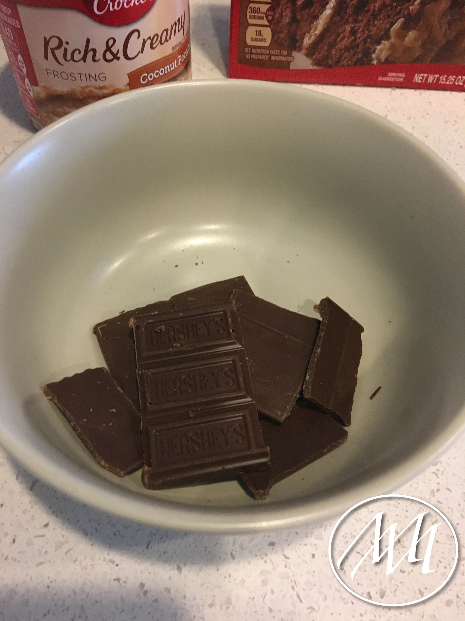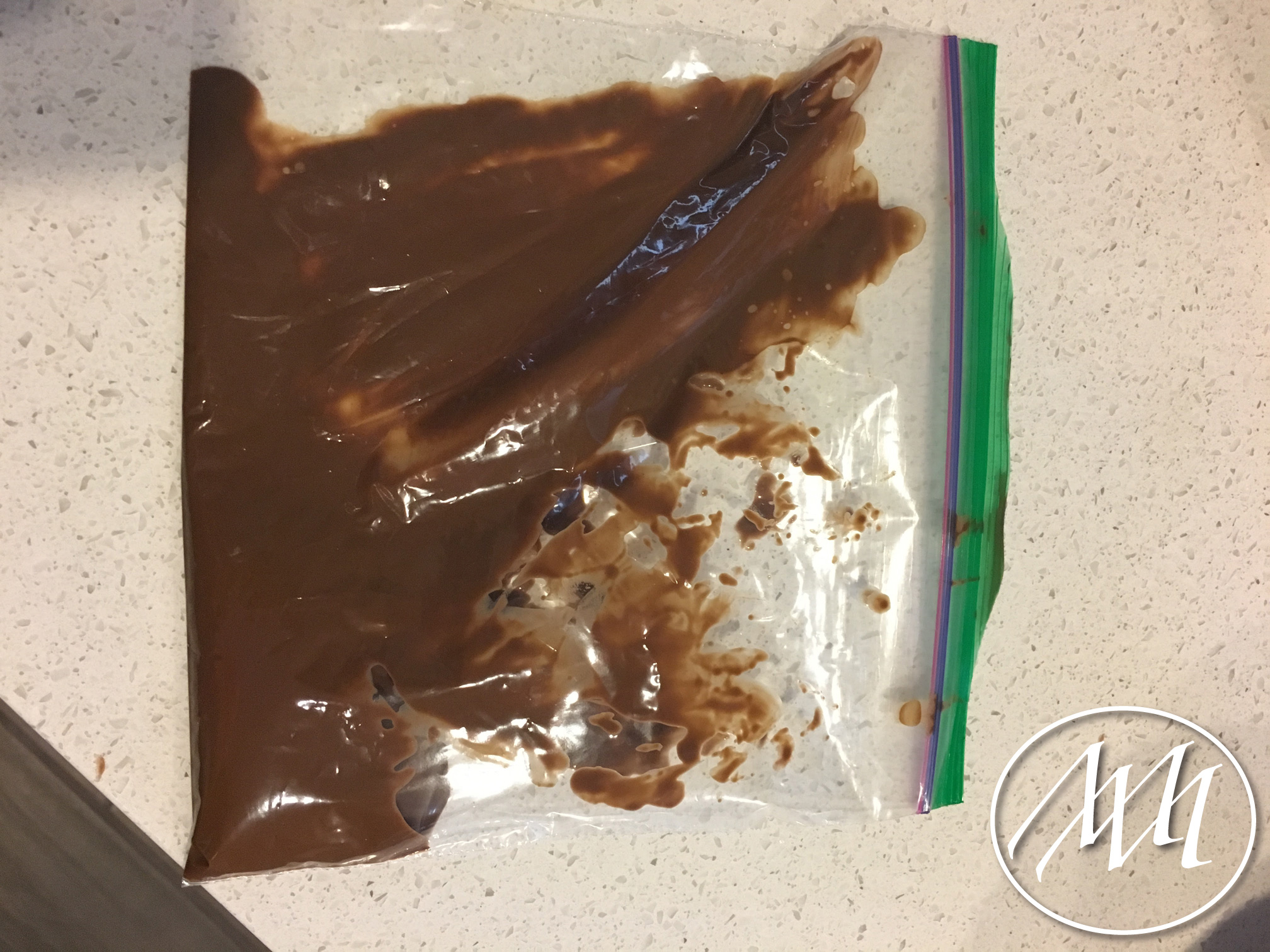 Break up the Hershey’s chocolate bar and place in a microwavable safe container. Microwave for 30-40 seconds; stir and repeat if necessary until it’s completely melted.