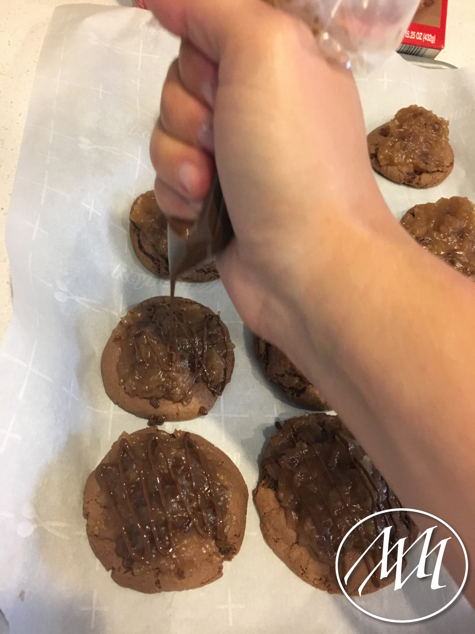 Put the melted chocolate into a small baggie and snip a small piece of the corner off so you can drizzle the chocolate on the cookies.