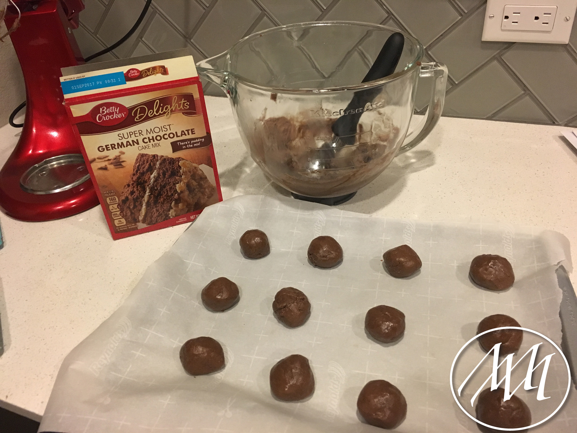Scoop out cookie dough and roll into golfball sized balls. Line a cookie sheet with parchment paper to avoid sticking and place cookies 1-2 inches apart.