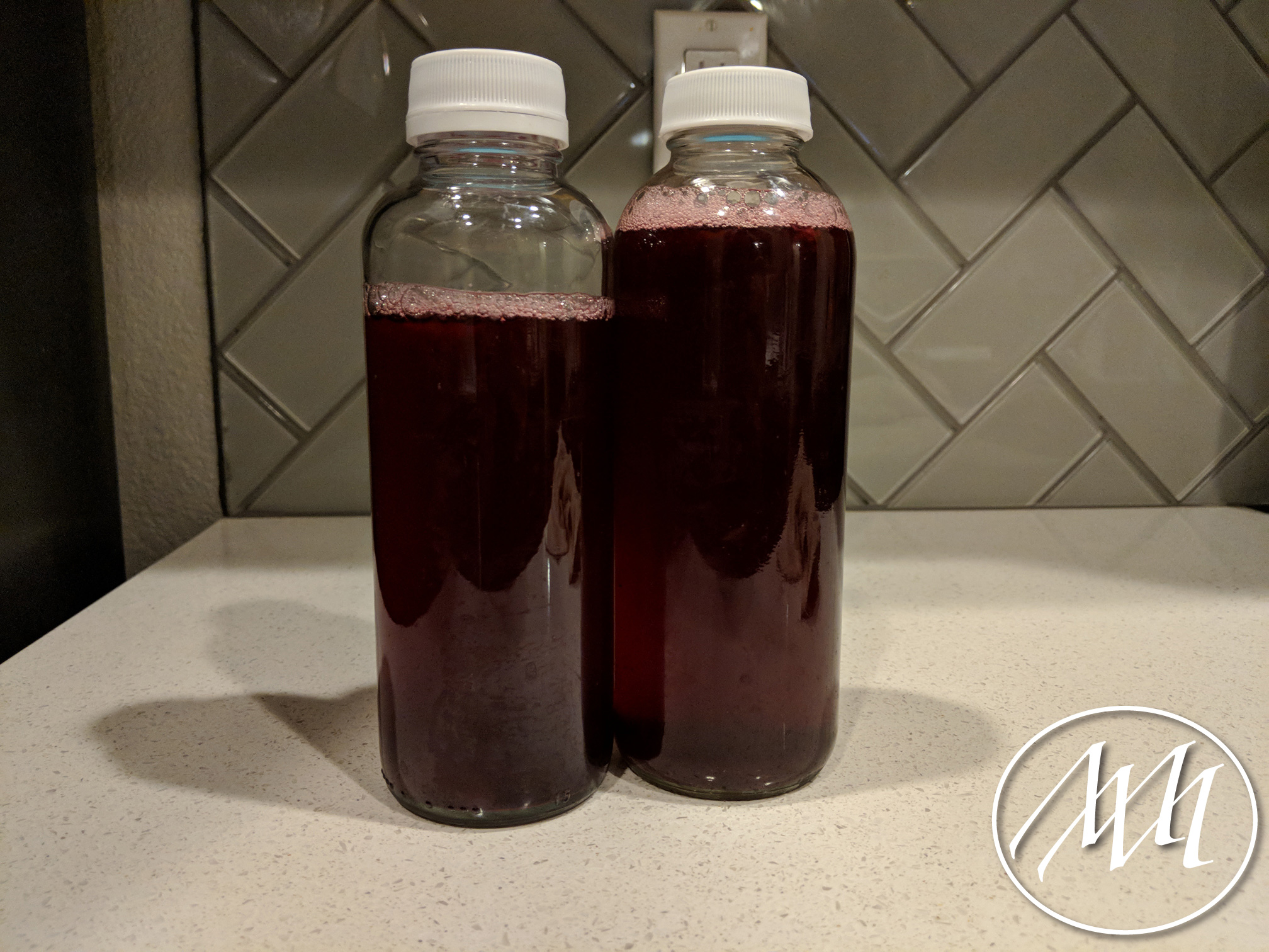 OR To make the kombucha fizzy: strain and pour into airtight containers leaving enough space to add in 1/2 Cup 100% organic fruit juice or fresh/frozen fruit to the mixture and set out for another 3-5 days. This process is called second fermentation and it makes the kombucha fizzy. After it’s done, strain once more and refrigerate. NOTE: you may need to “burp” your bottles to let the compressed air out so your bottles don’t explode.