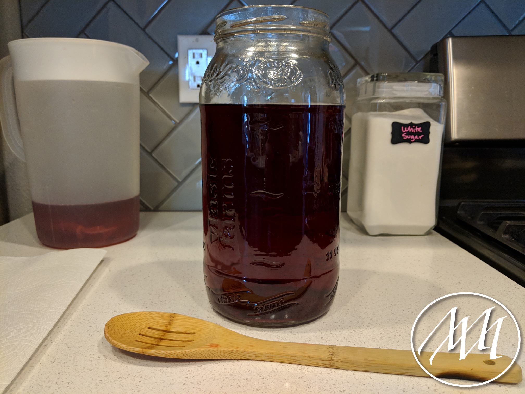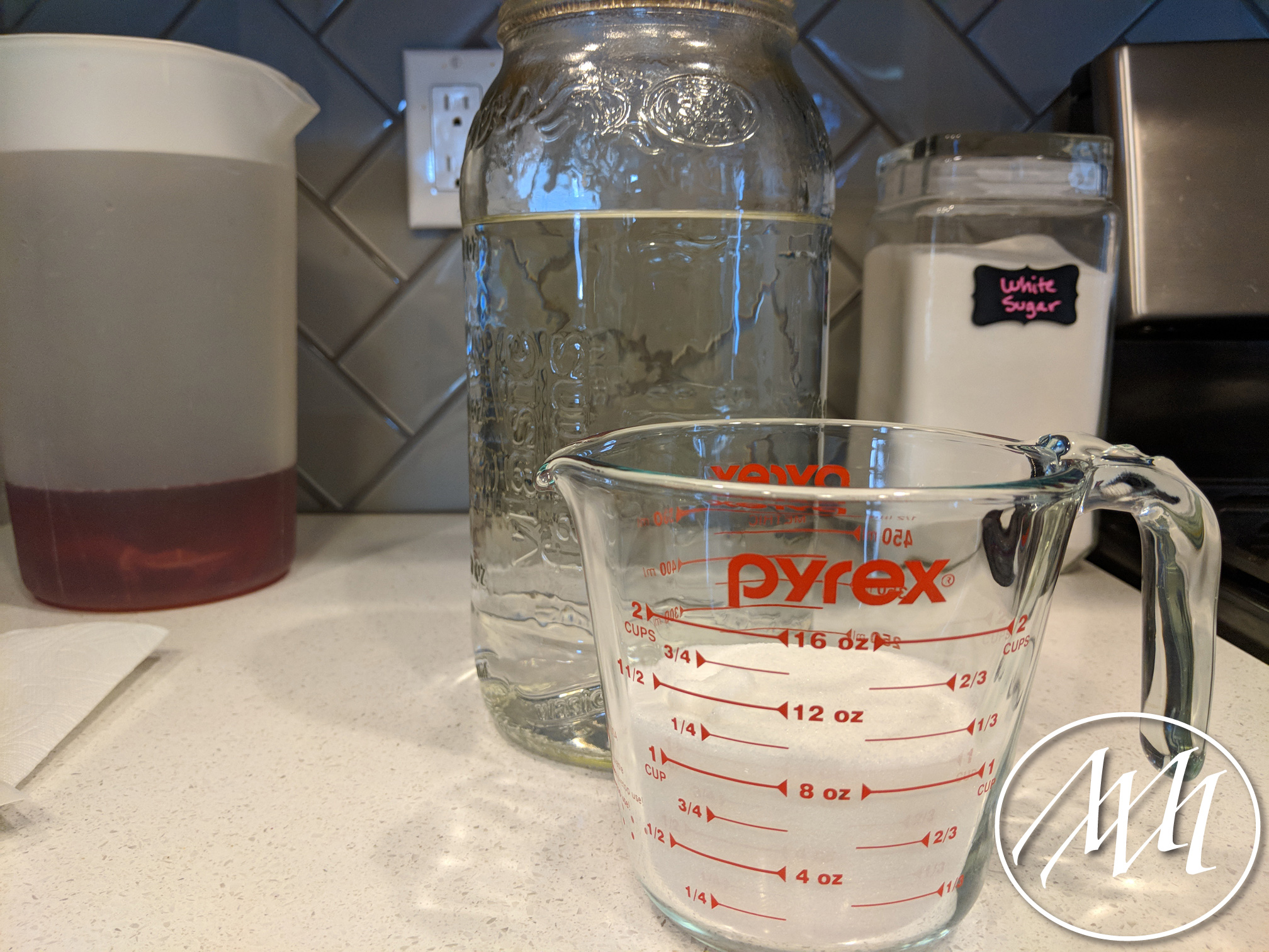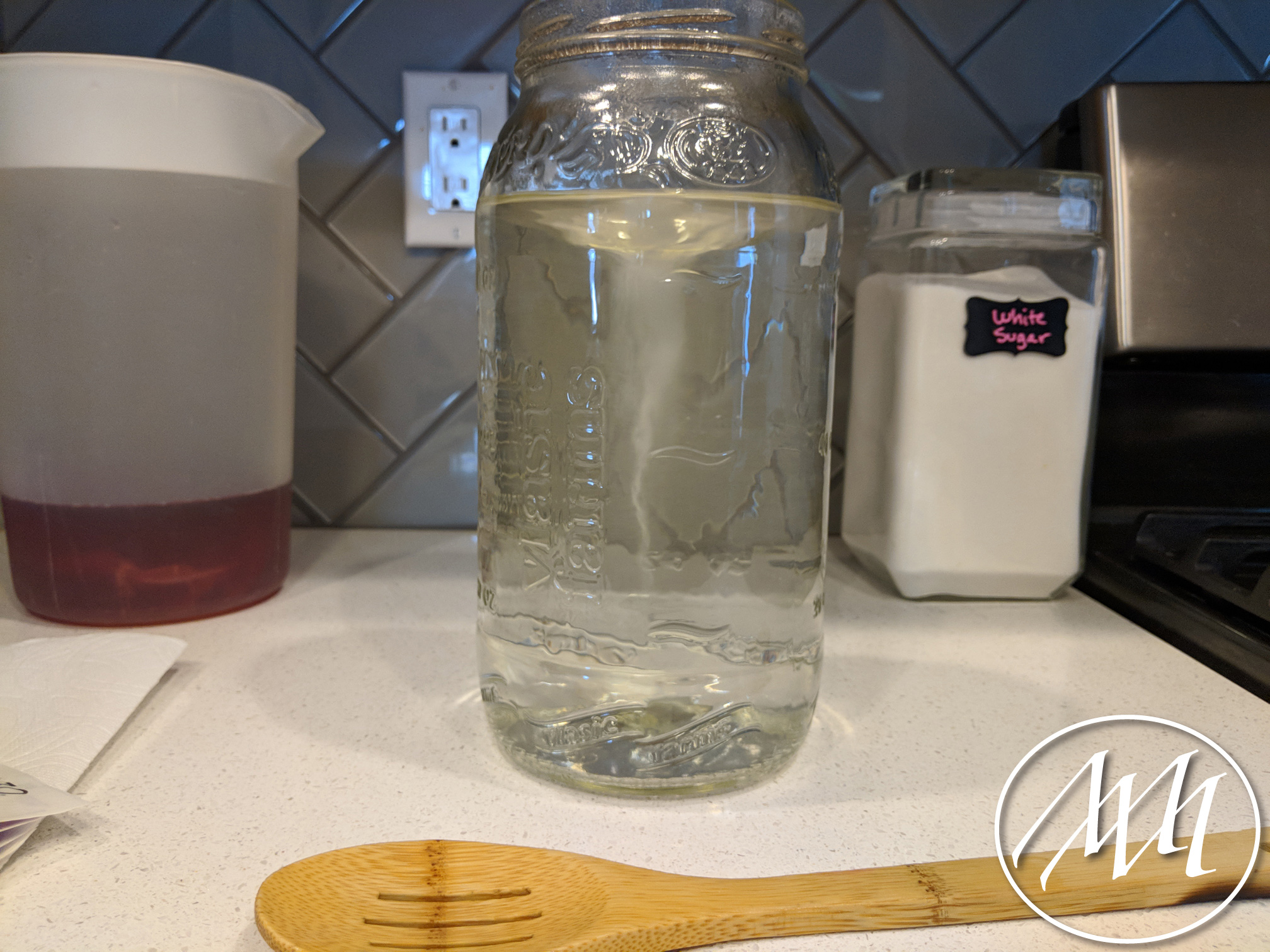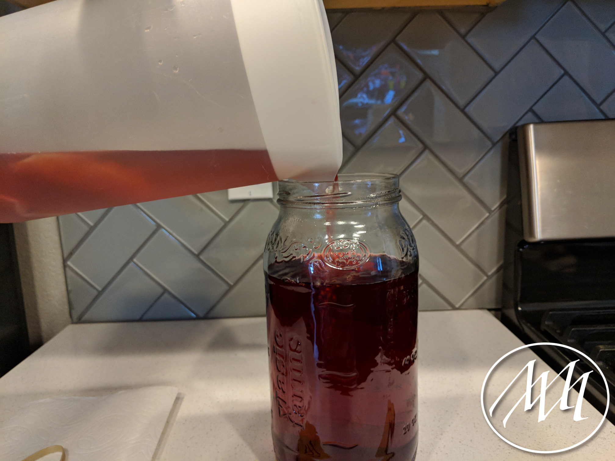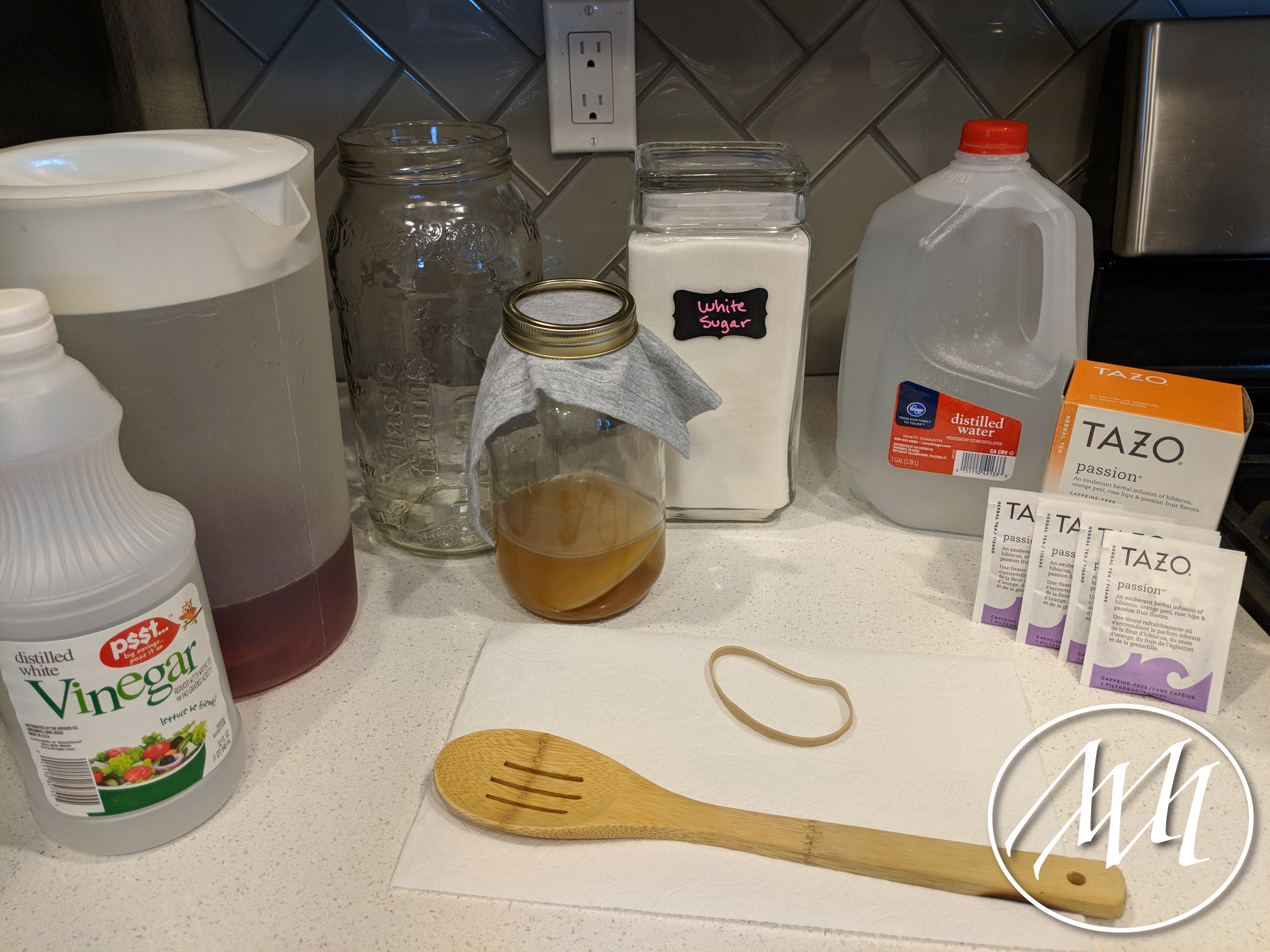 Once the mixture is mostly cooled, add the starter tea or distilled white vinegar and the SCOBY.