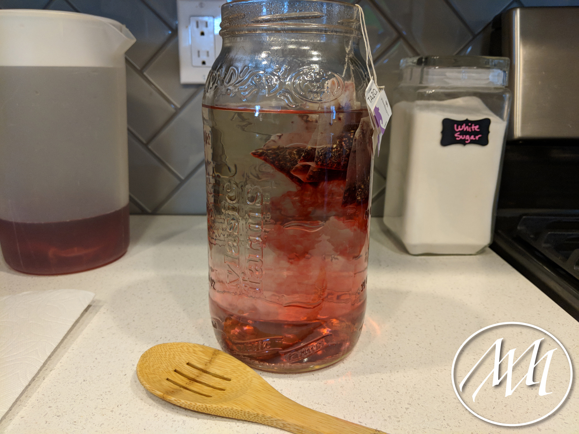 Add tea bags to the water and sugar mixture and steep the tea for 15 minutes. Remove the tea bags and wait until the mixture is mostly cooled.
