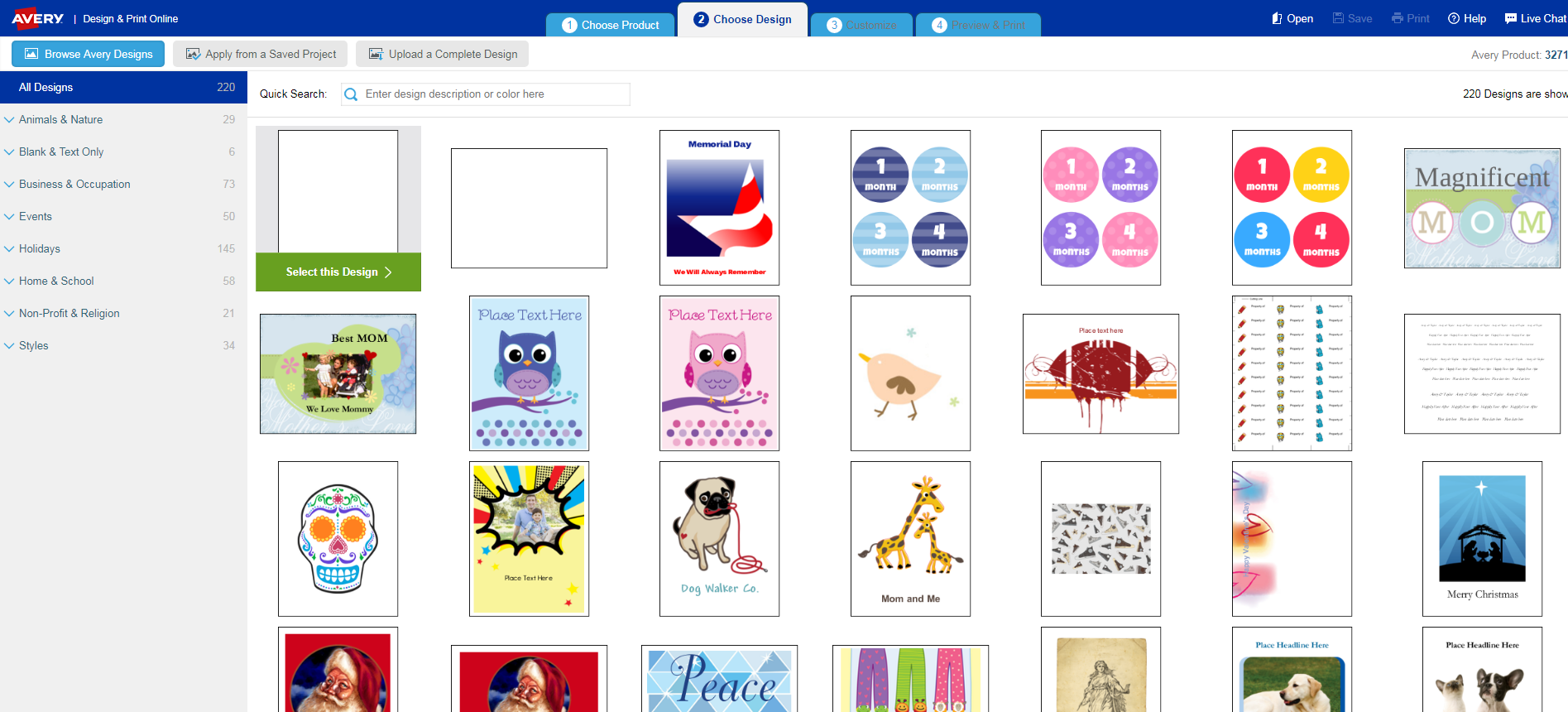 Go to https://www.avery.com/ and search for your product: 3271. Once you find your product, click on Start Designing.