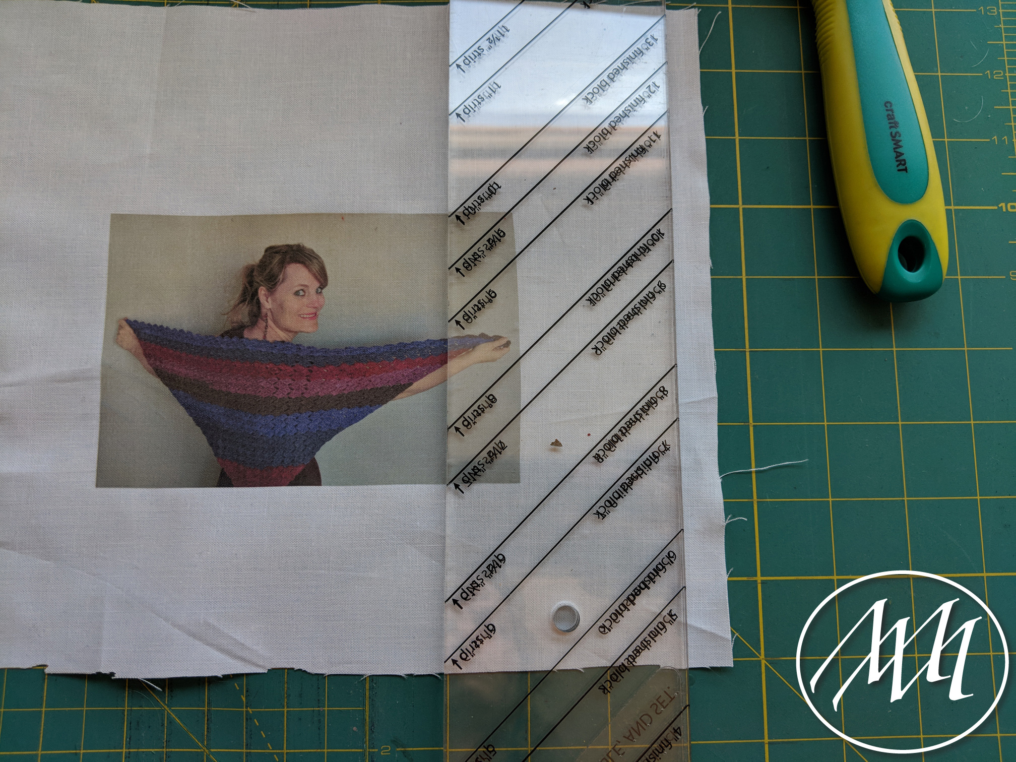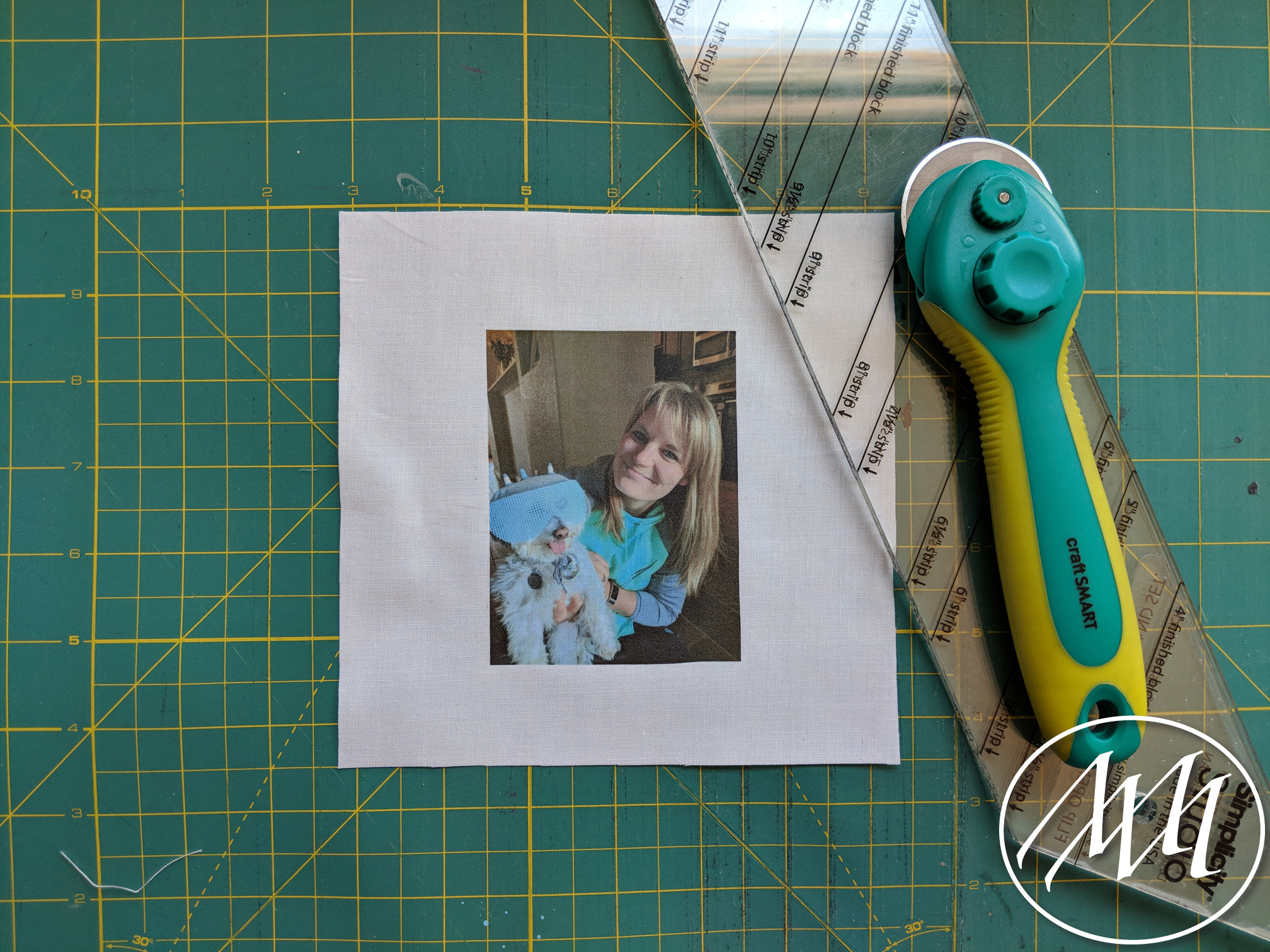 Once all the photos are transferred to the fabric, you can cut out your pieces. I like to use my quilting edge and rotary cutter with rotary mat to make the cuts clean and straight the first time.