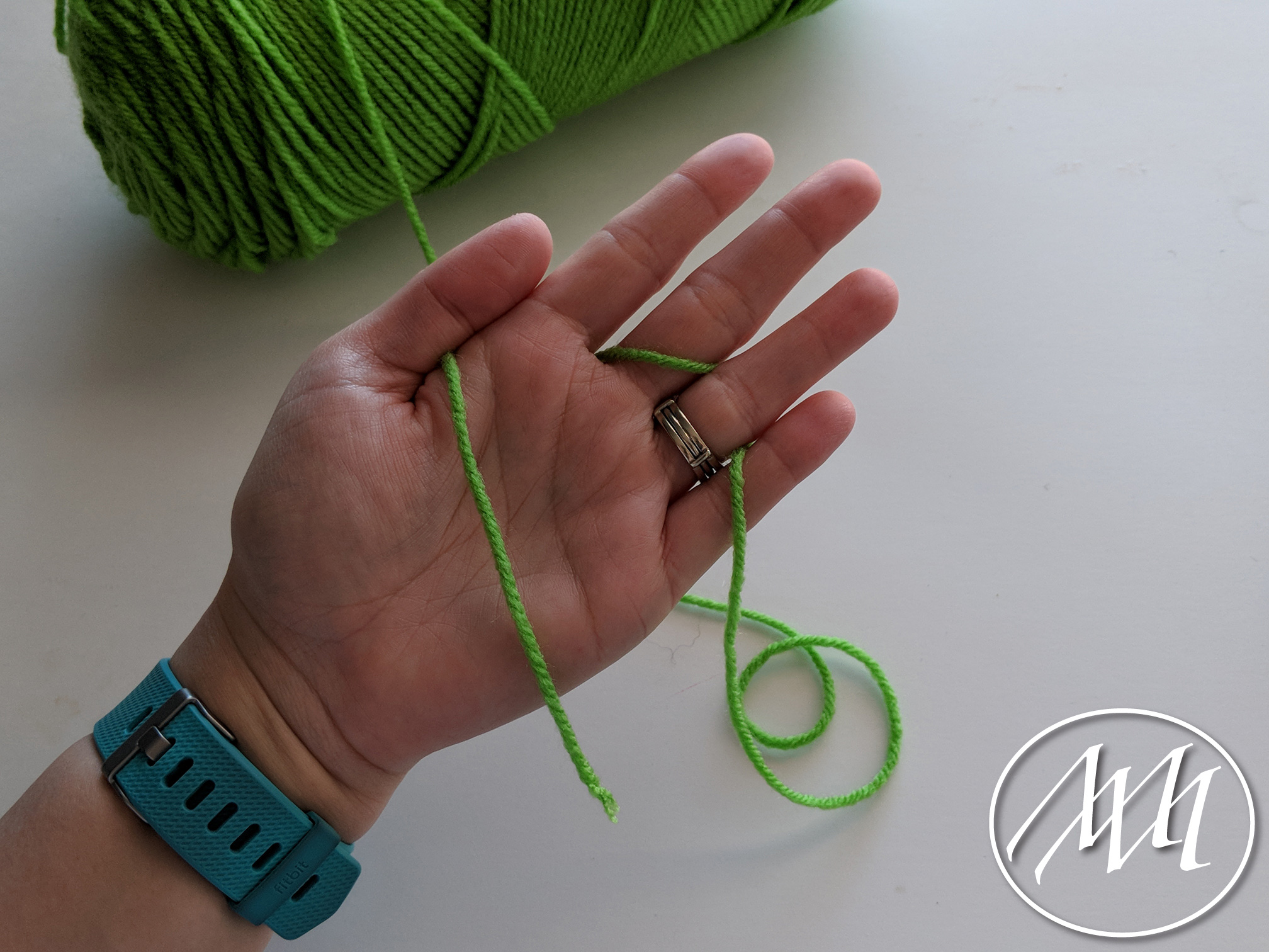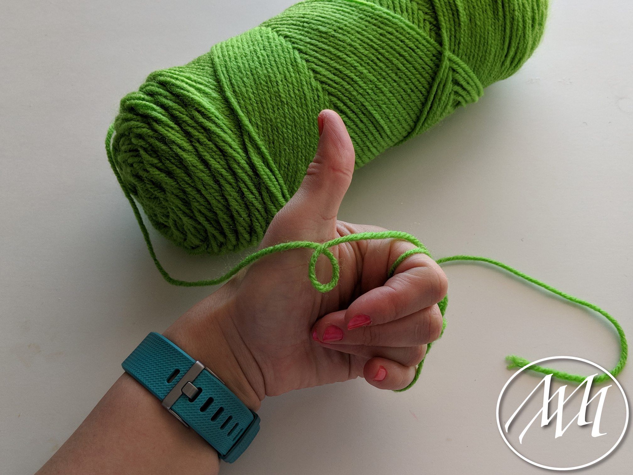 Gently pull the four yarn loops wrapped around your fingers off, but hold them together. Cut about 2 inches of the working yarn off. Insert the working yarn into the hole of the four loops and tie a knot.