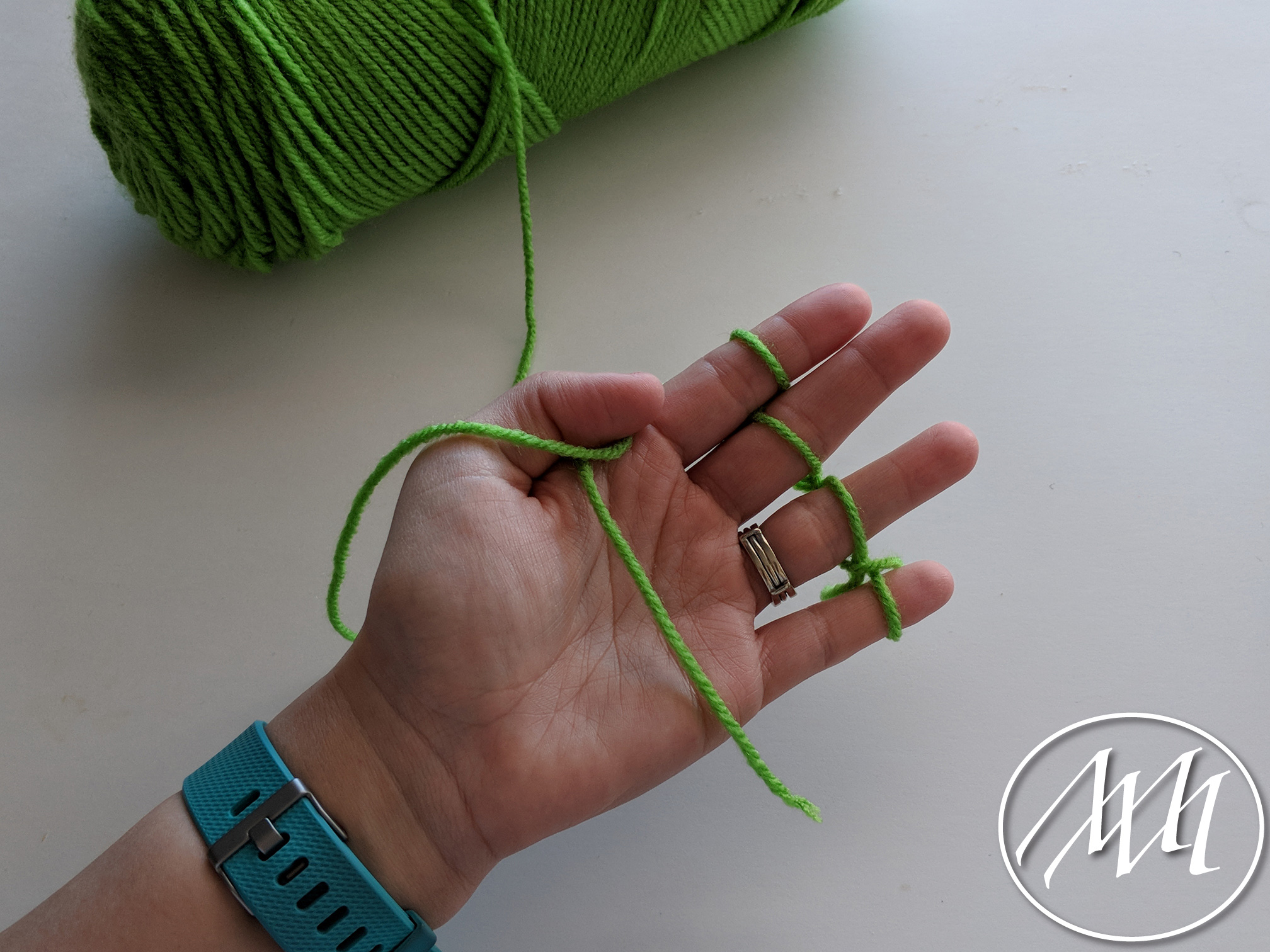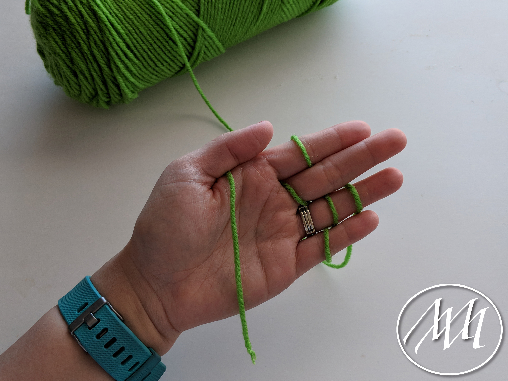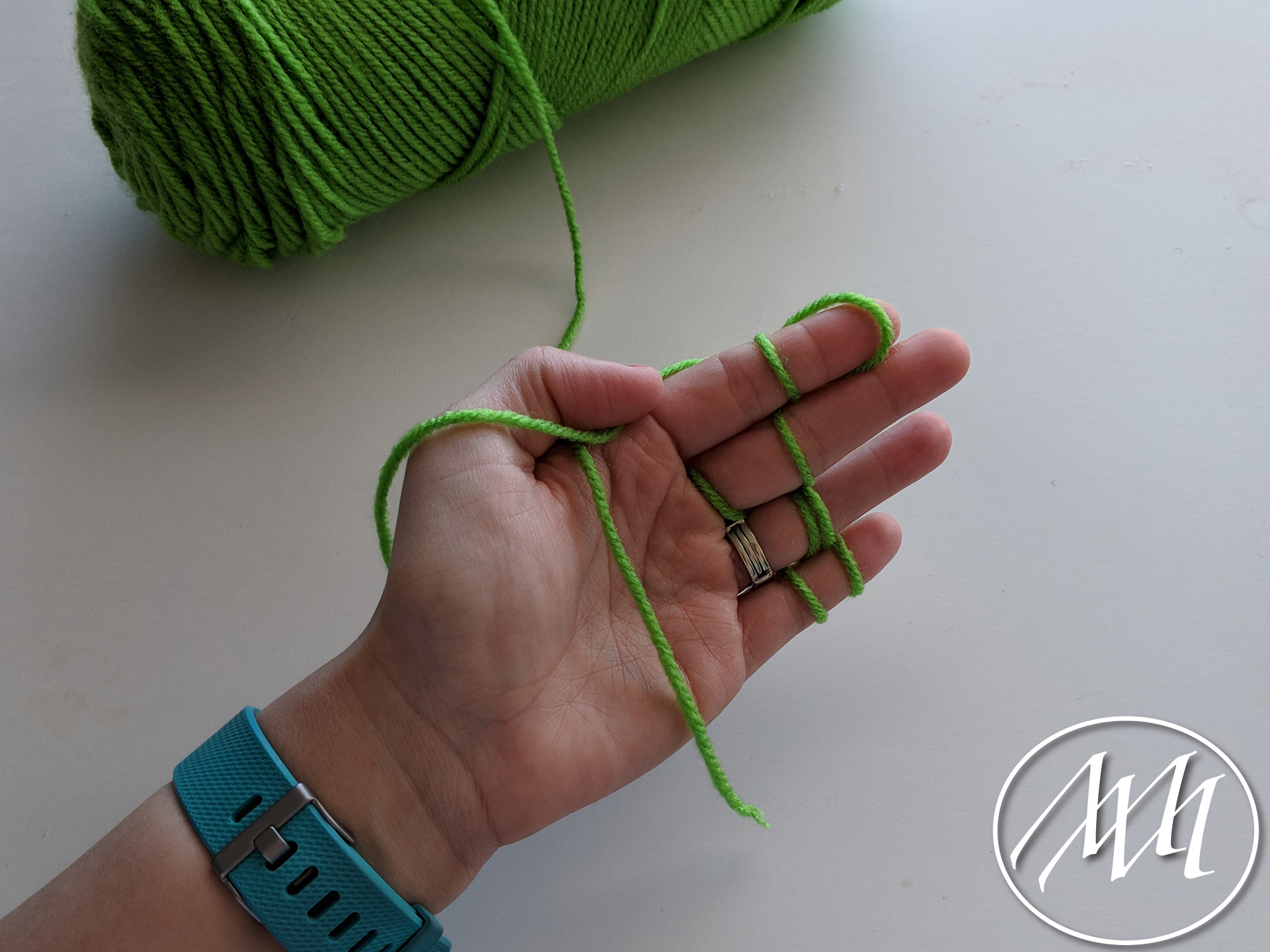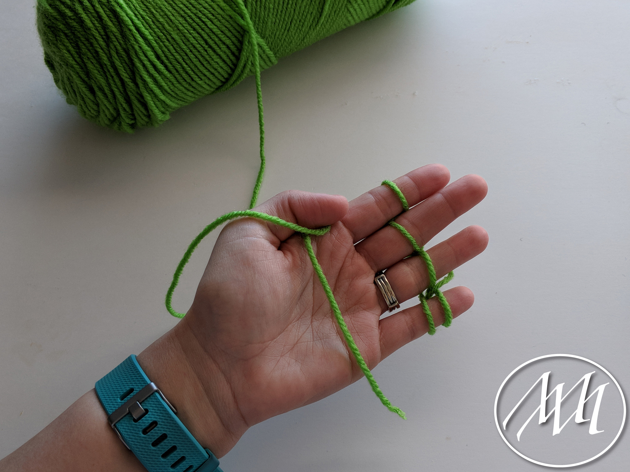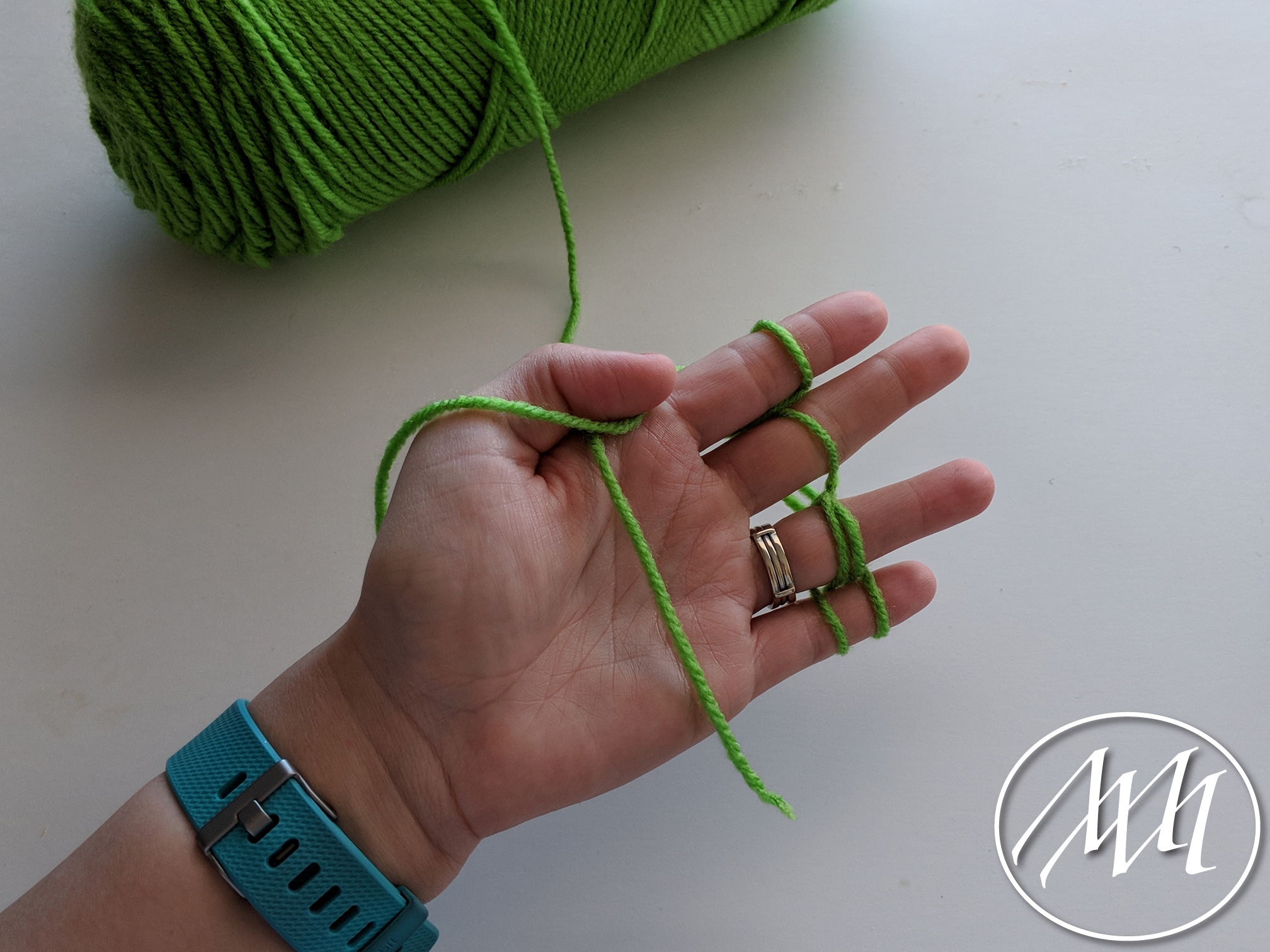 Weave the yarn behind your index finger, in front of your middle finger, behind your ring finger and in front of your pinkie.