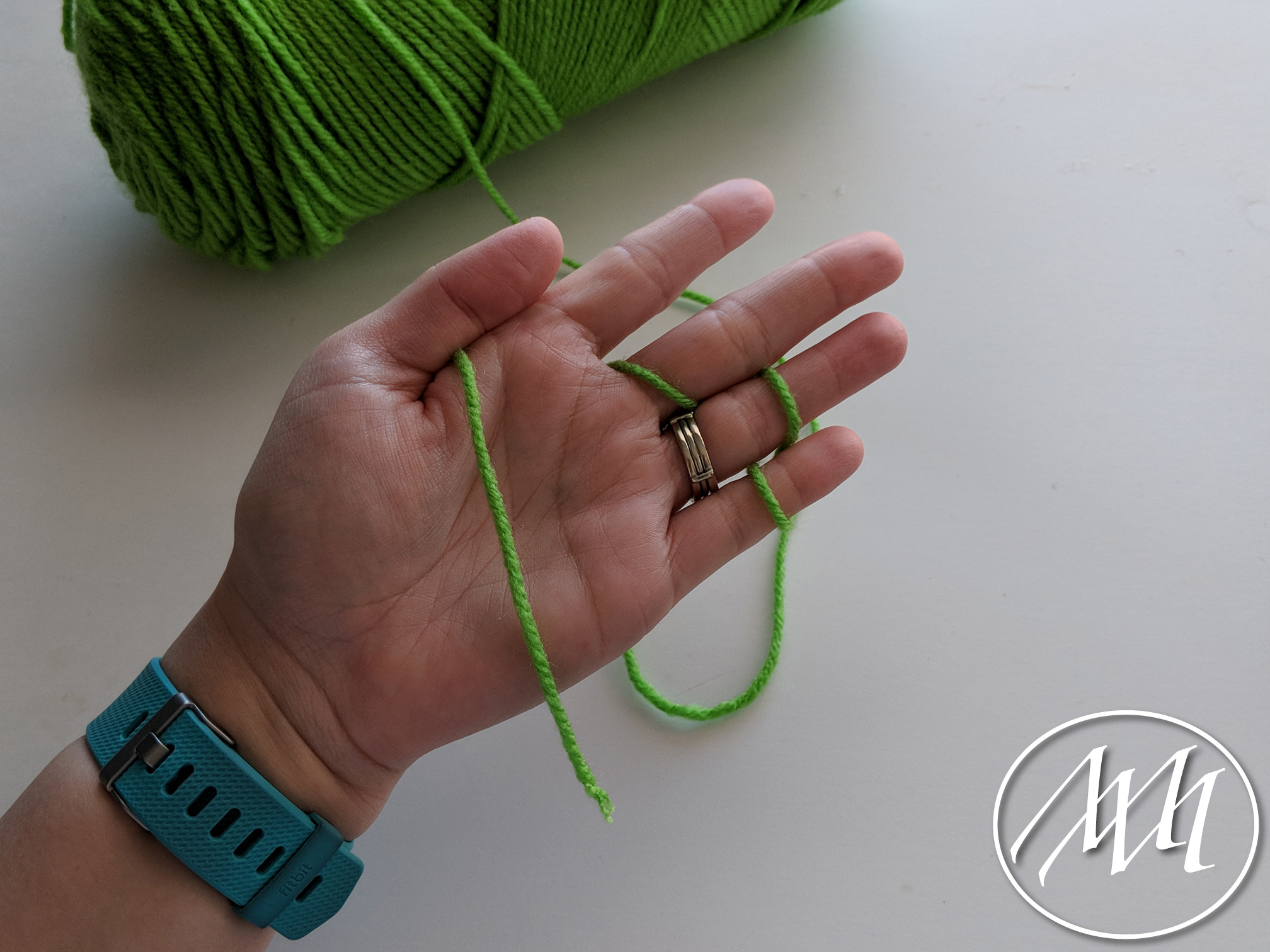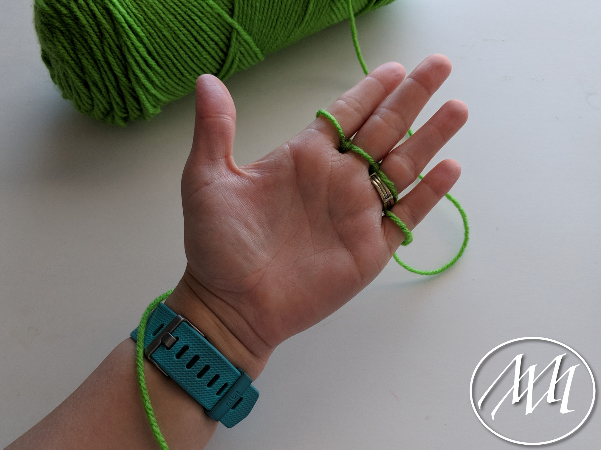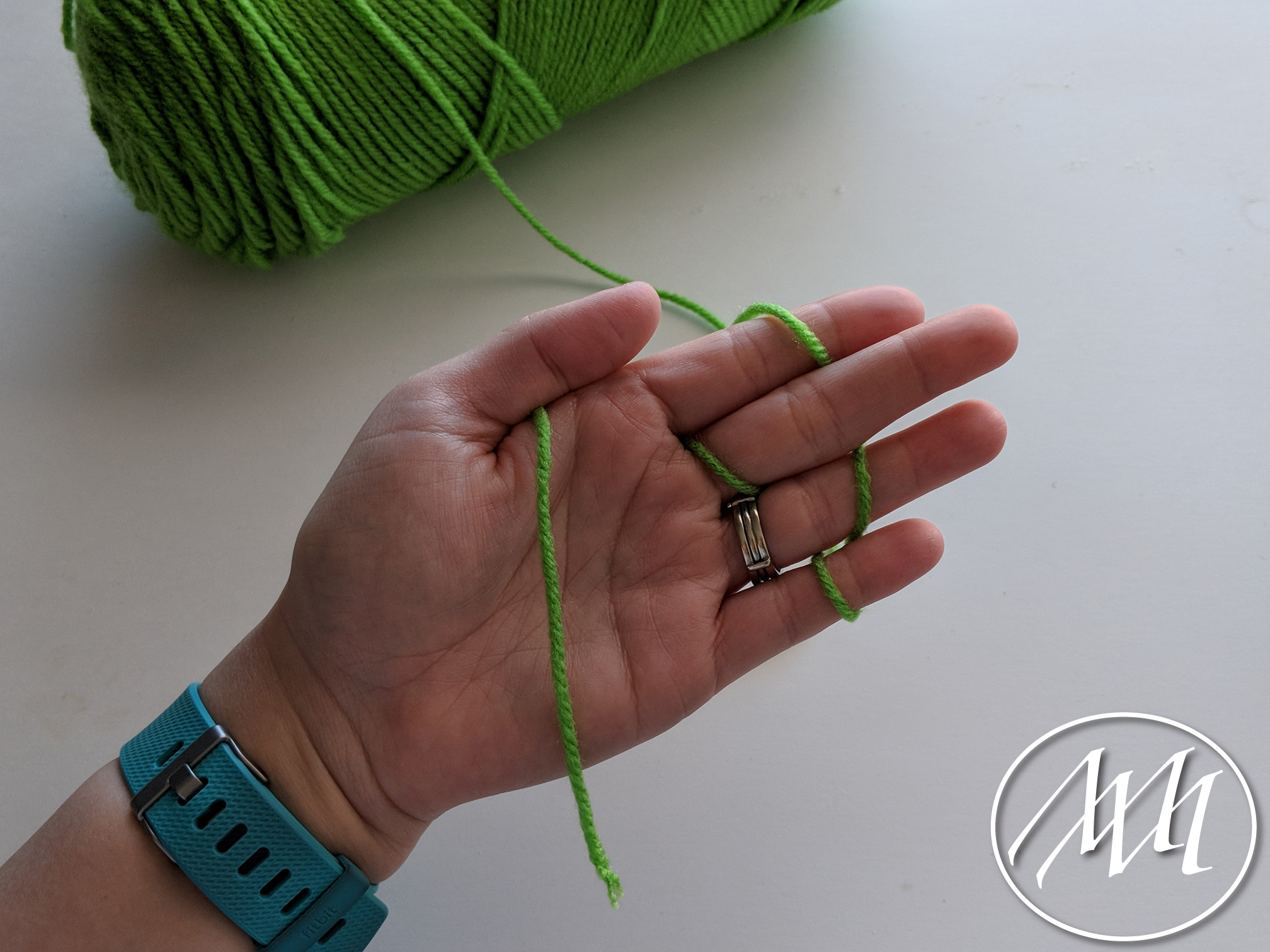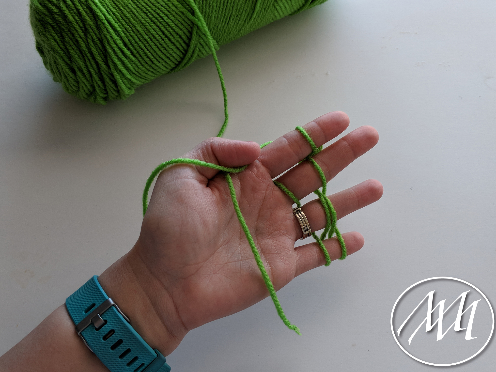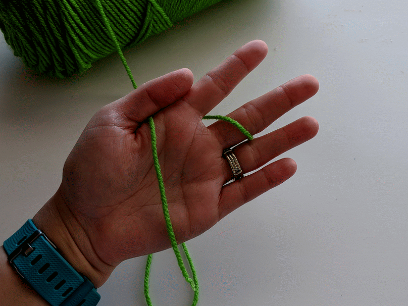 Weave the yarn behind your index finger, in front of your middle finger, behind your ring finger and in front of your pinkie.