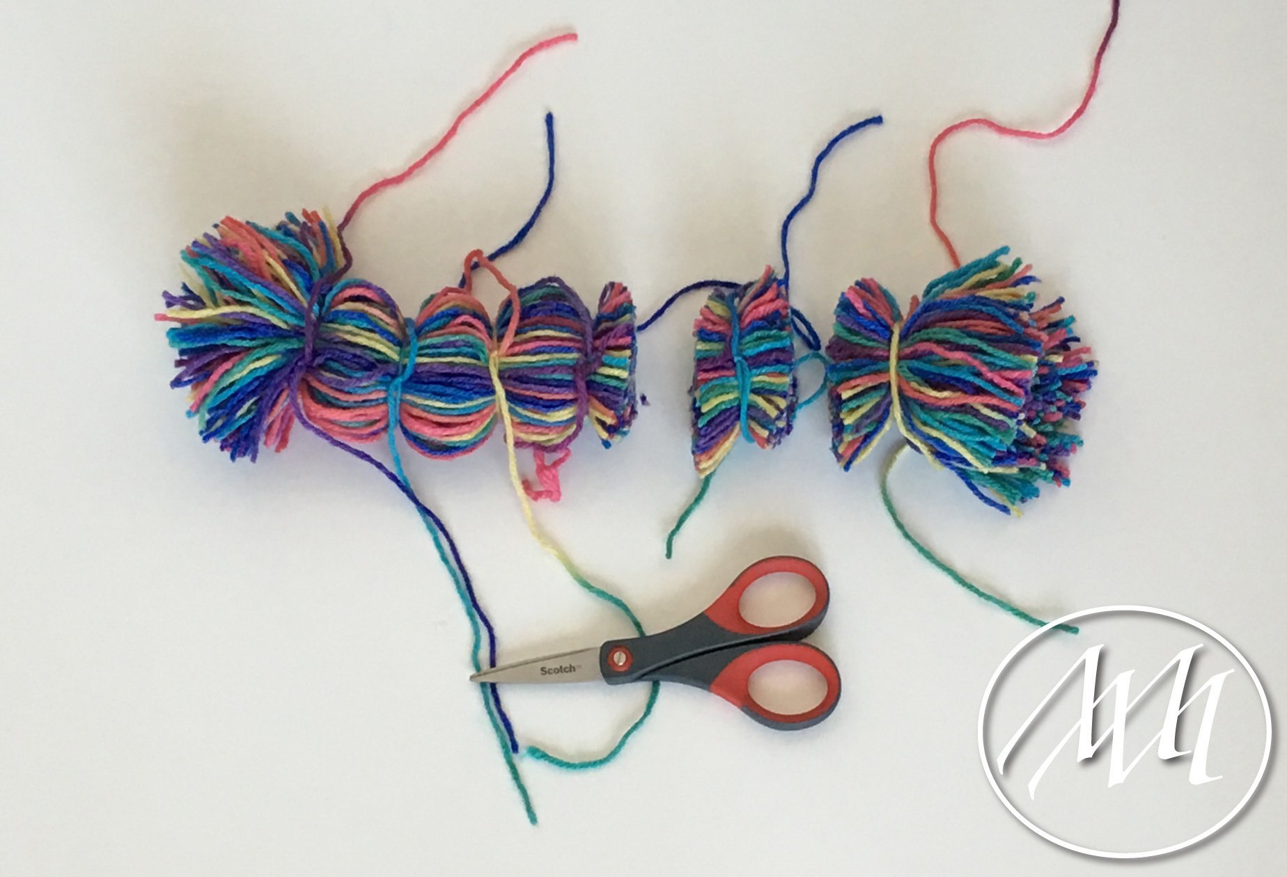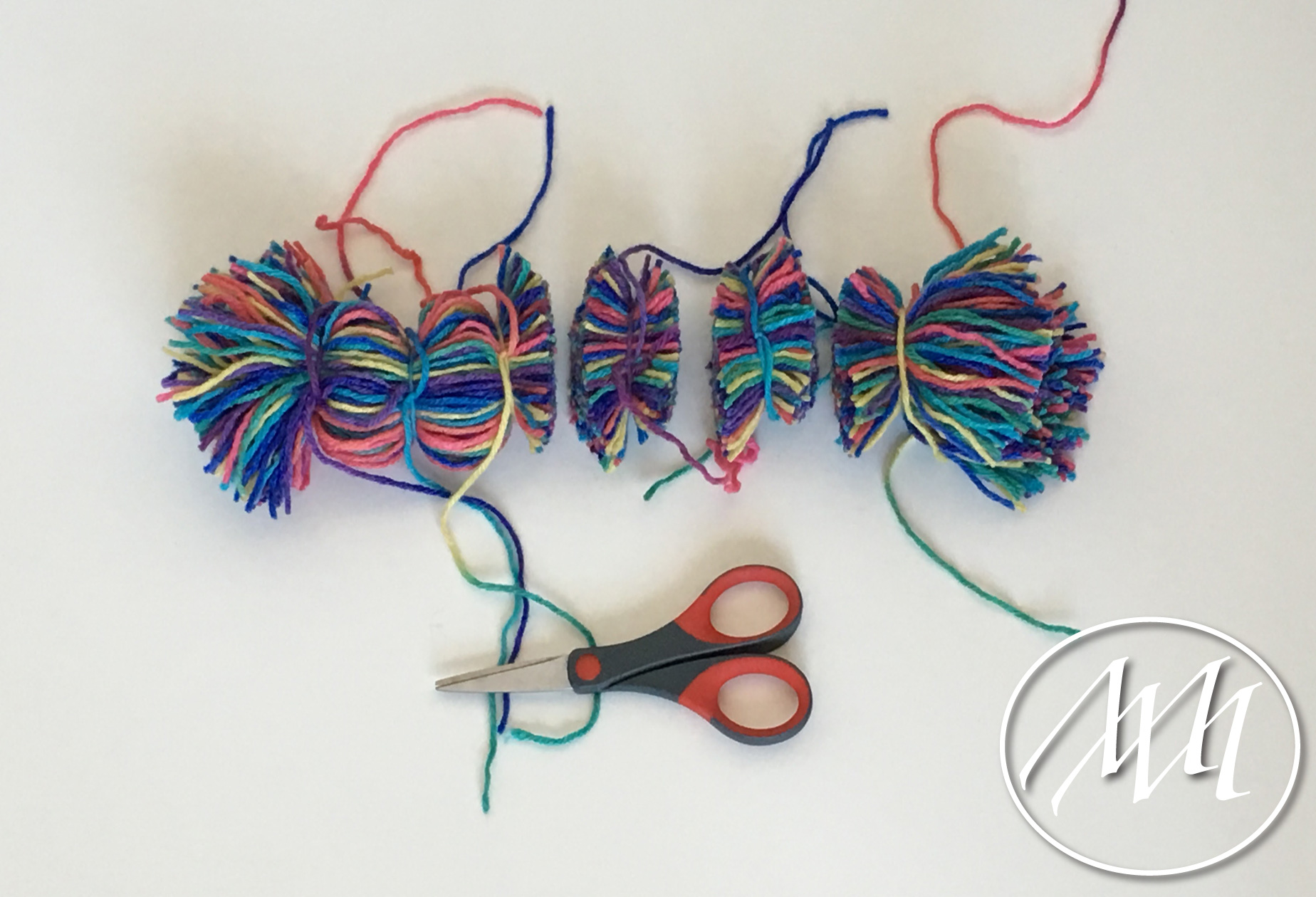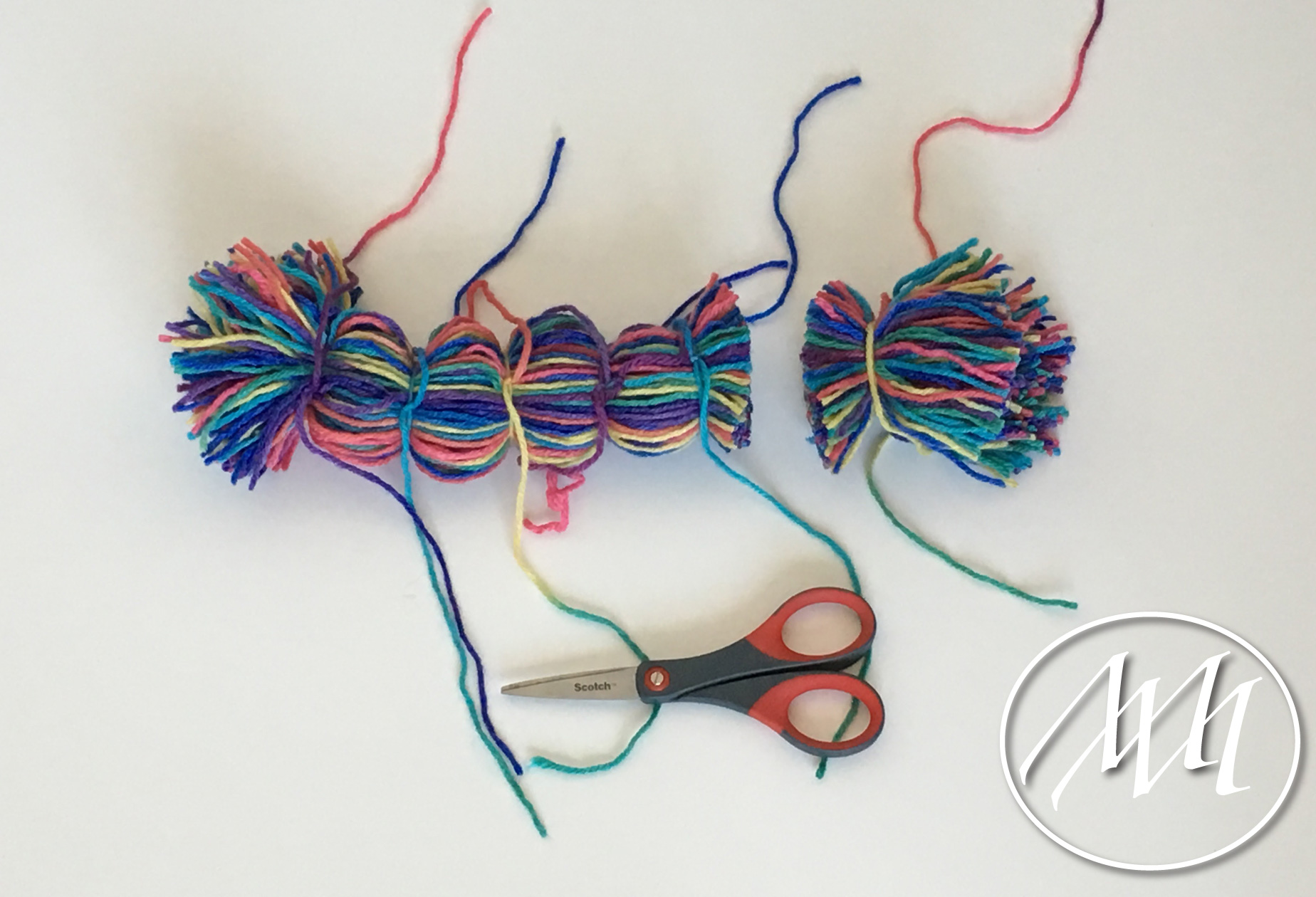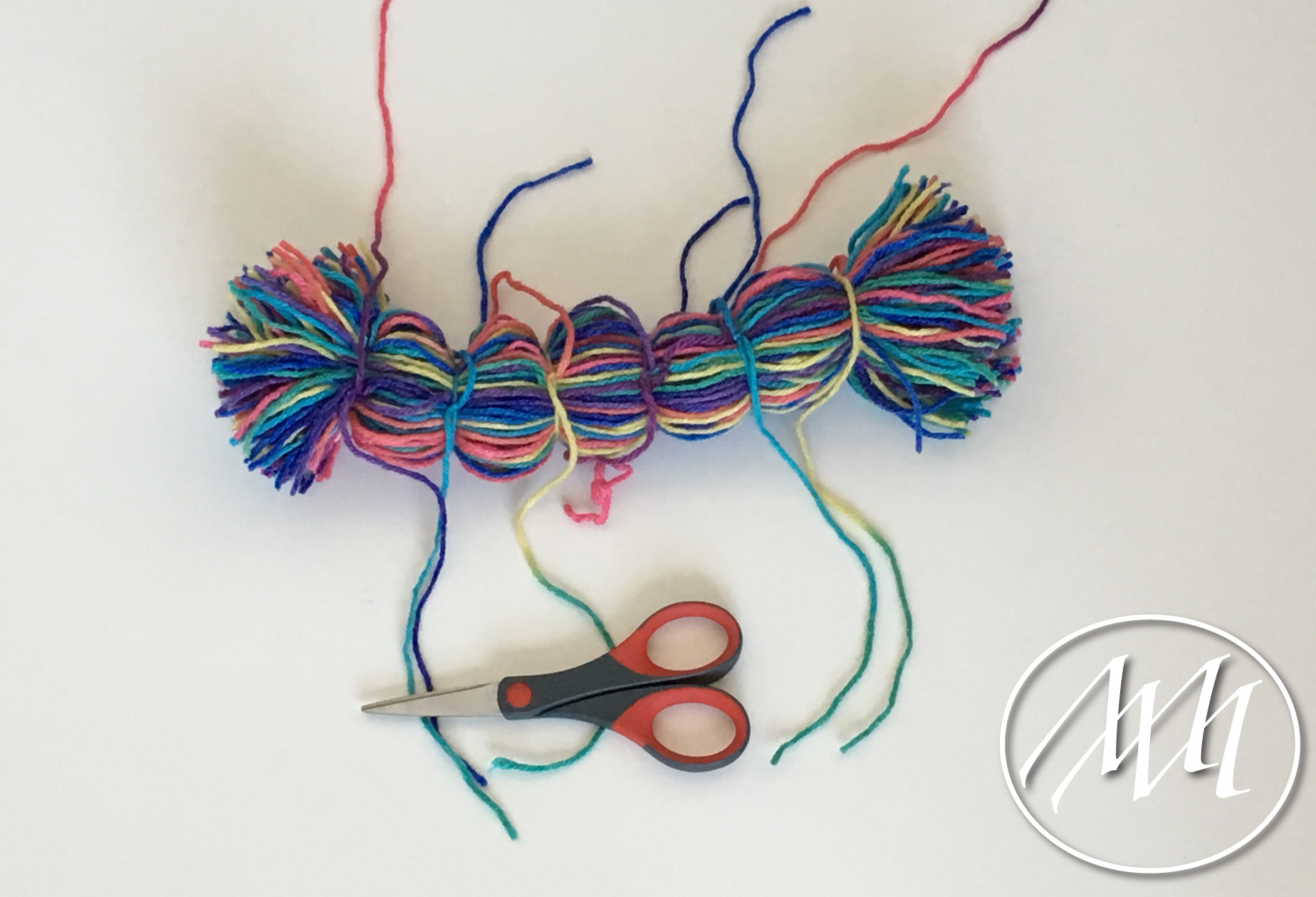 Cut the ends and in between each yarn strand to create 5-6 separate pom poms. Be careful not to cut the strands you tied in between each pom pom. We’ll need those to attach to various projects.