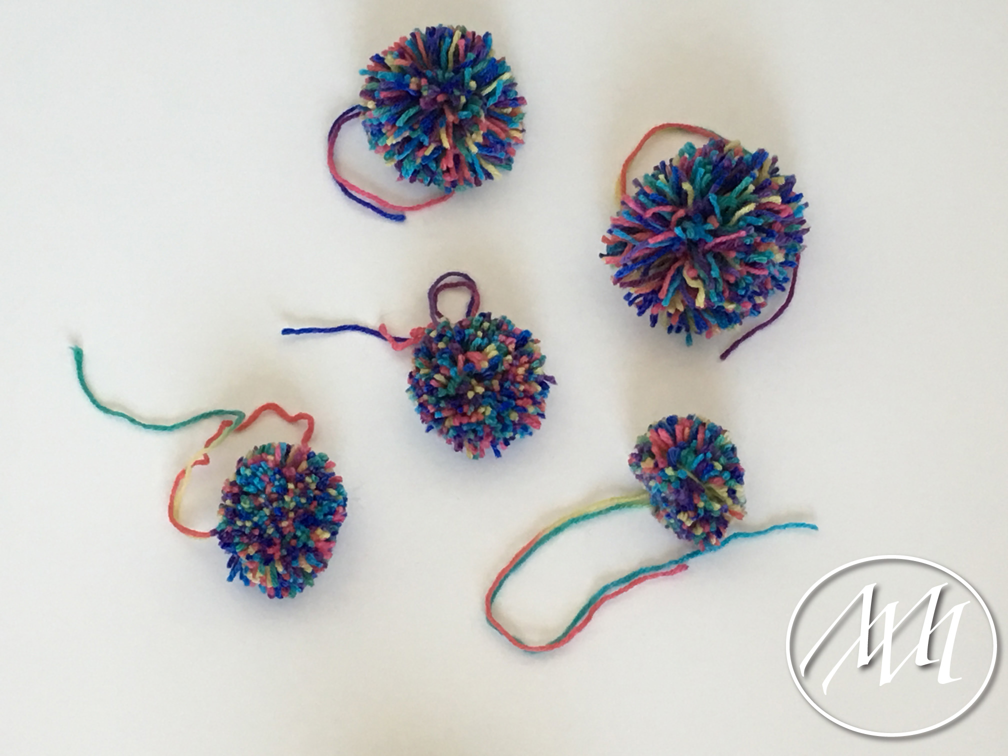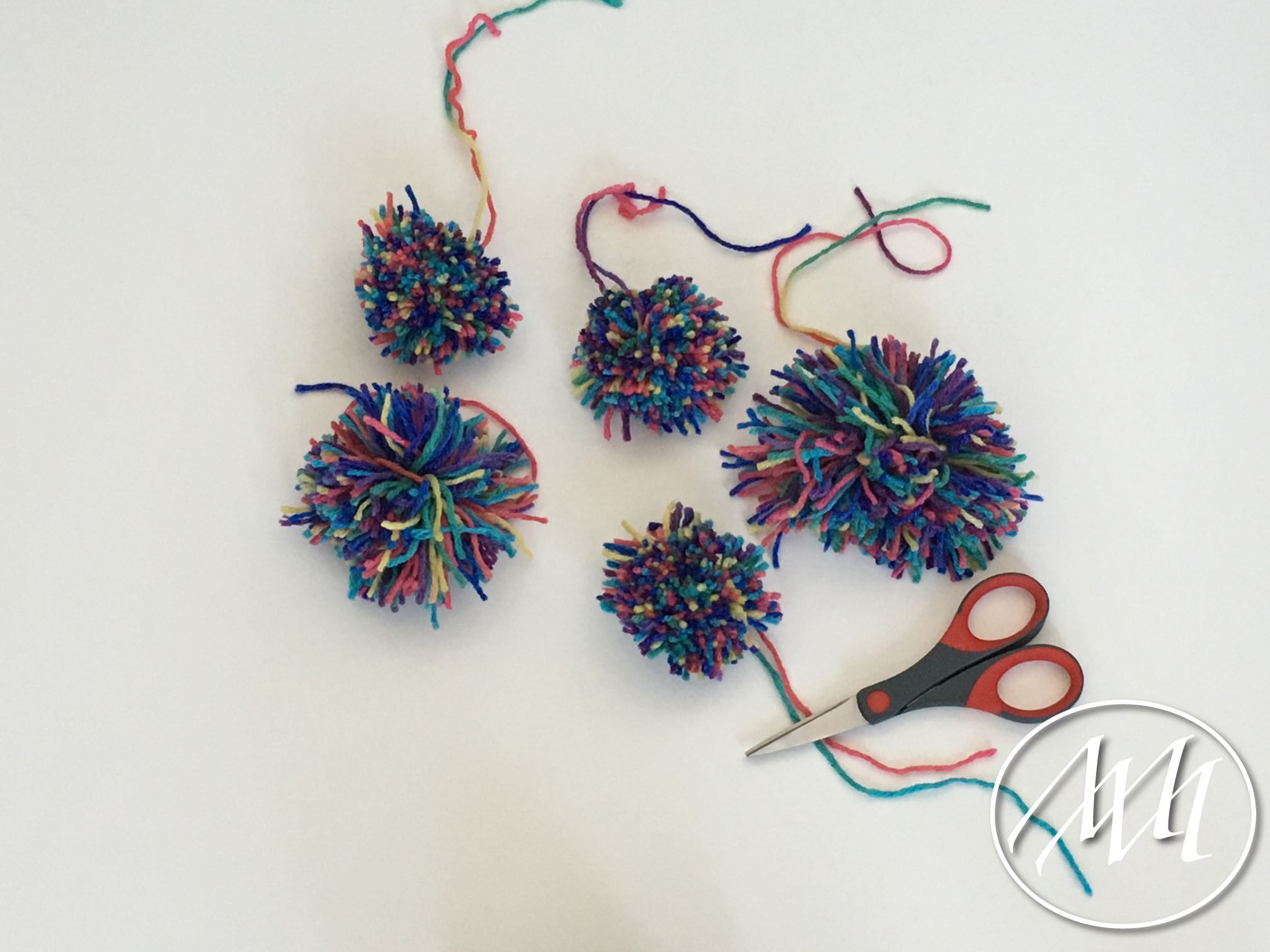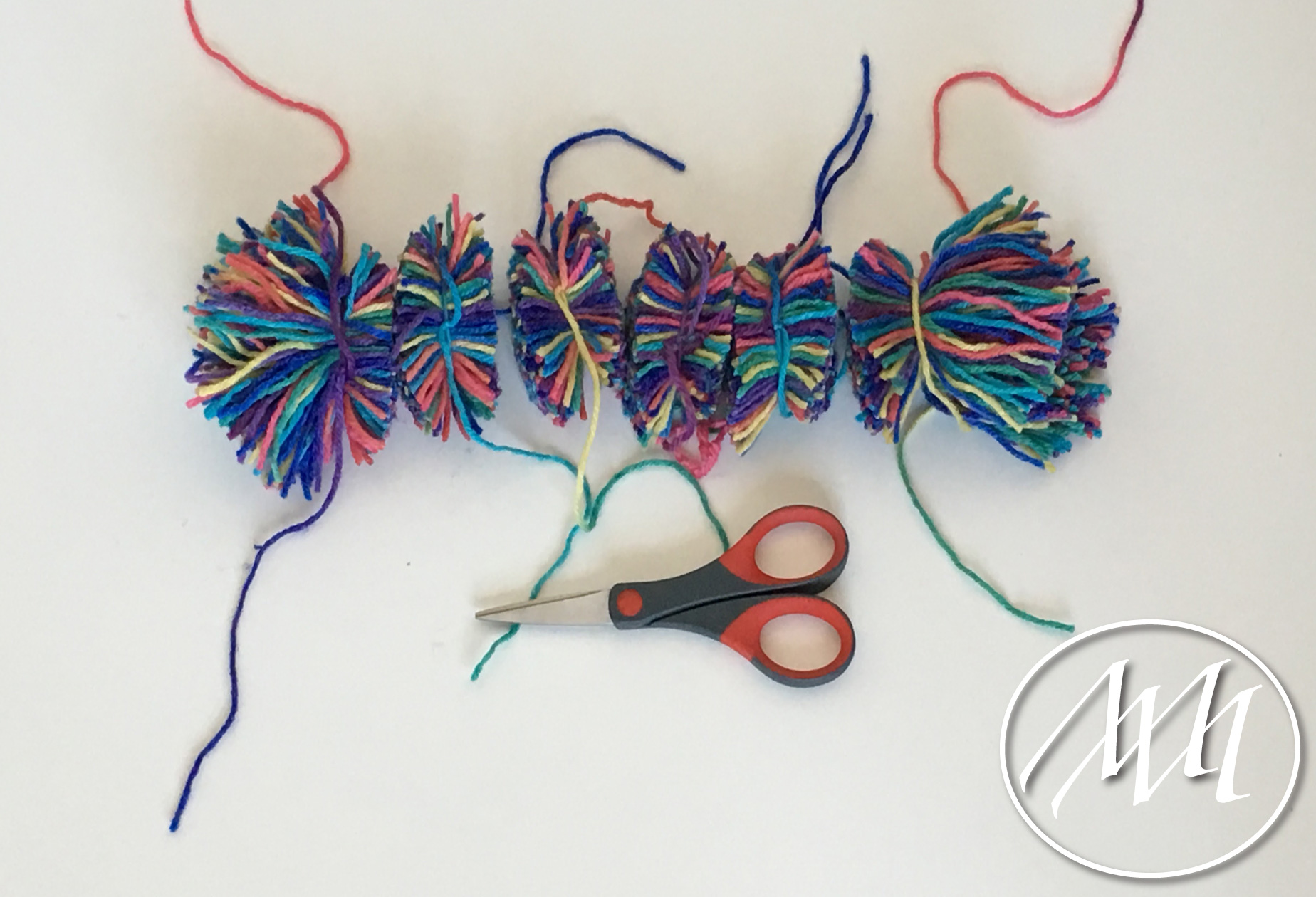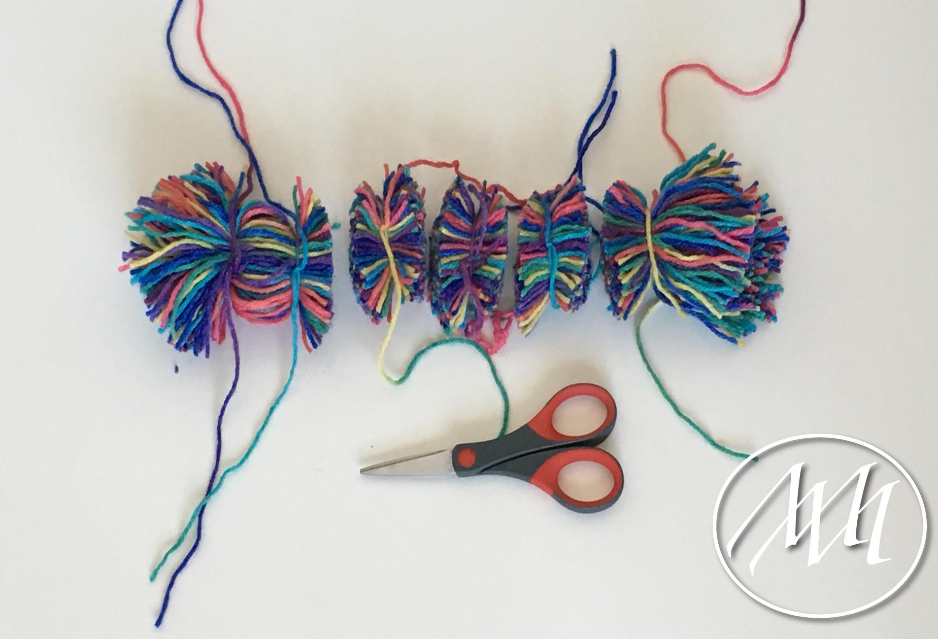 Cut the ends and in between each yarn strand to create 5-6 separate pom poms. Be careful not to cut the strands you tied in between each pom pom. We’ll need those to attach to various projects.