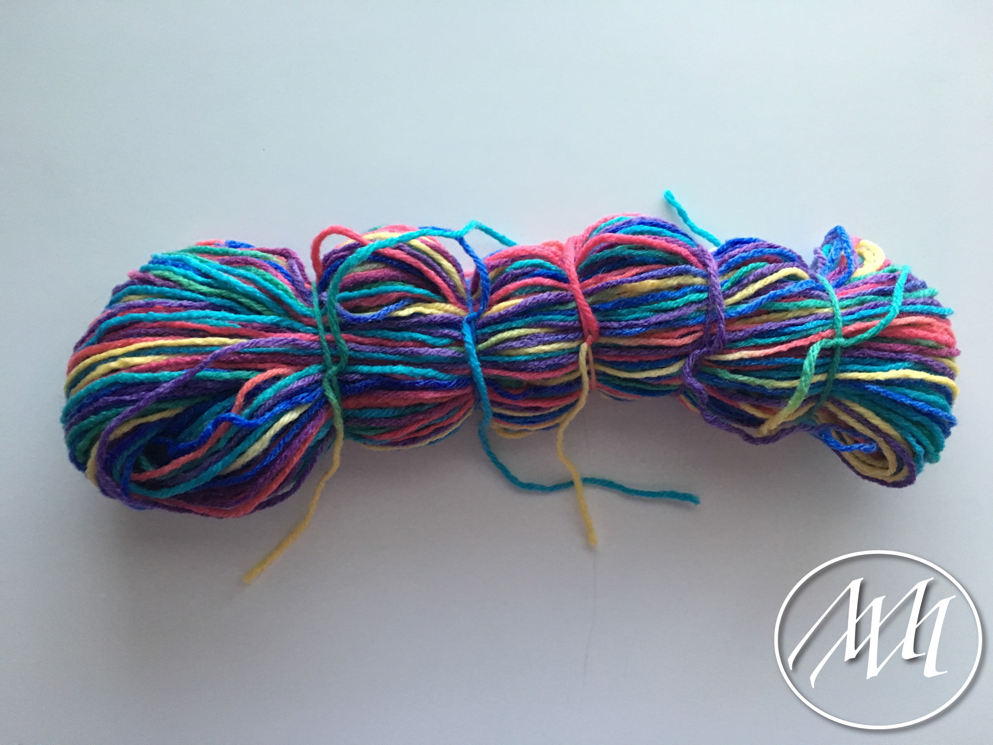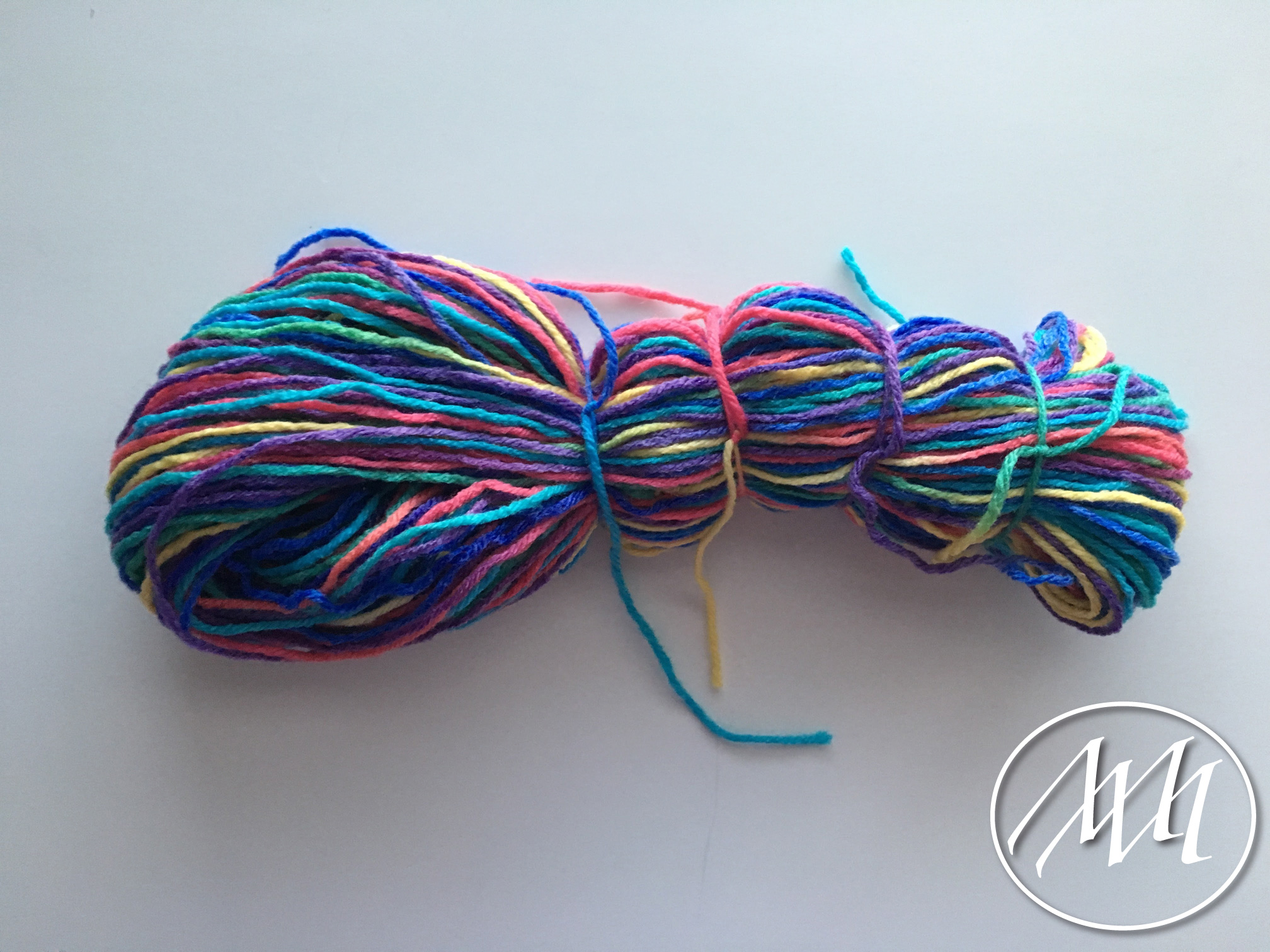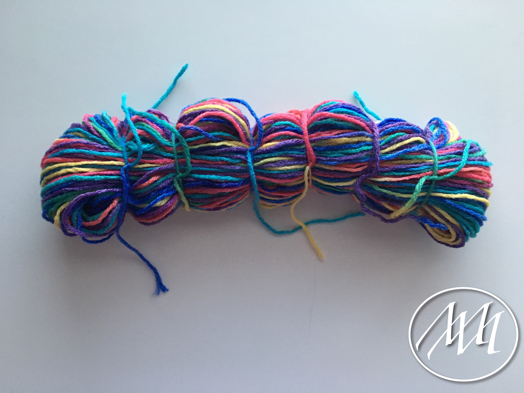 Carefully pull the yarn off the posts and lay on a solid surface. Cut 5-6 strands of yarn approximately 10-12”.