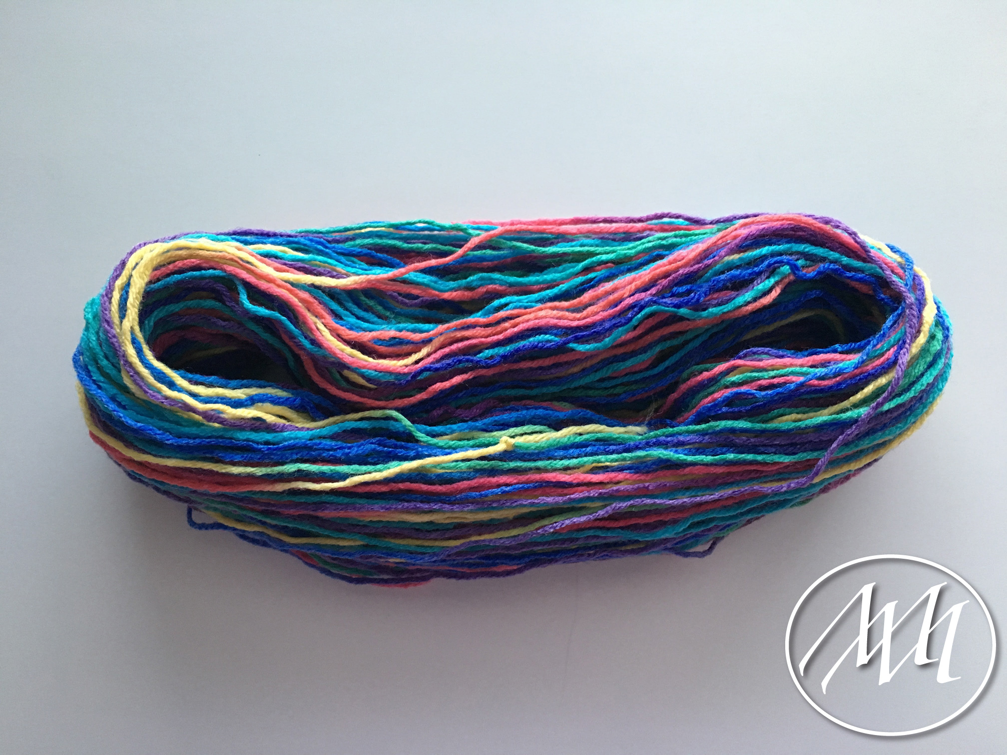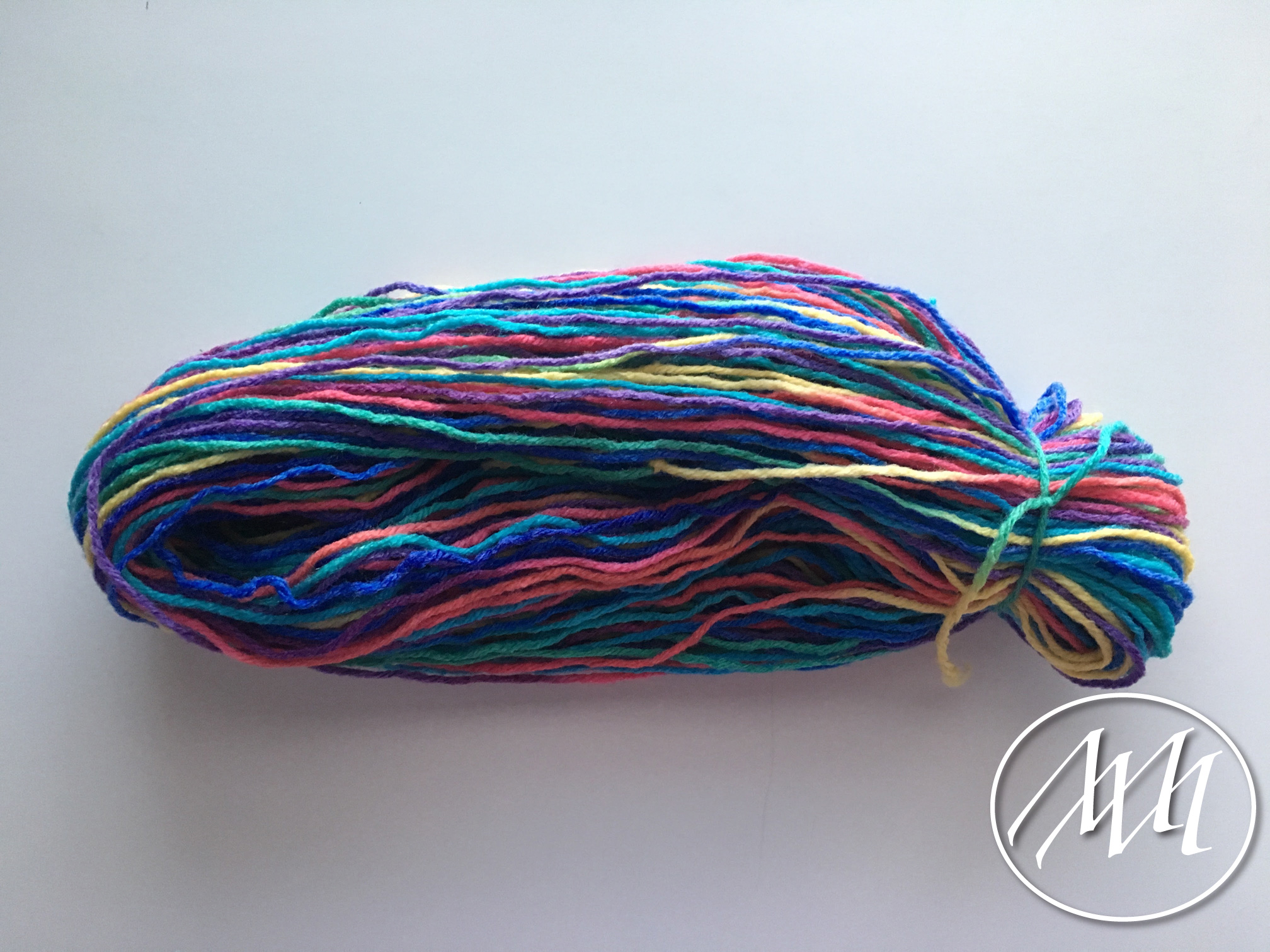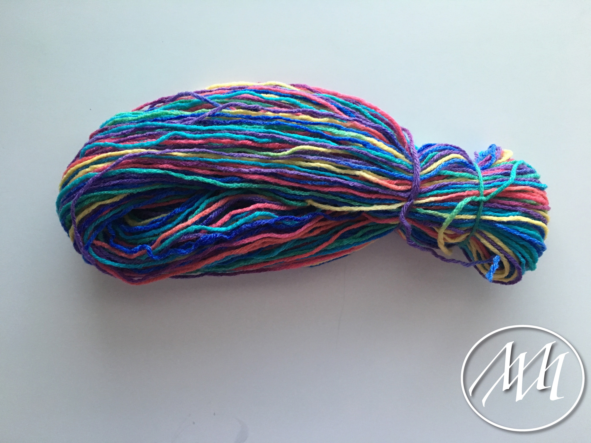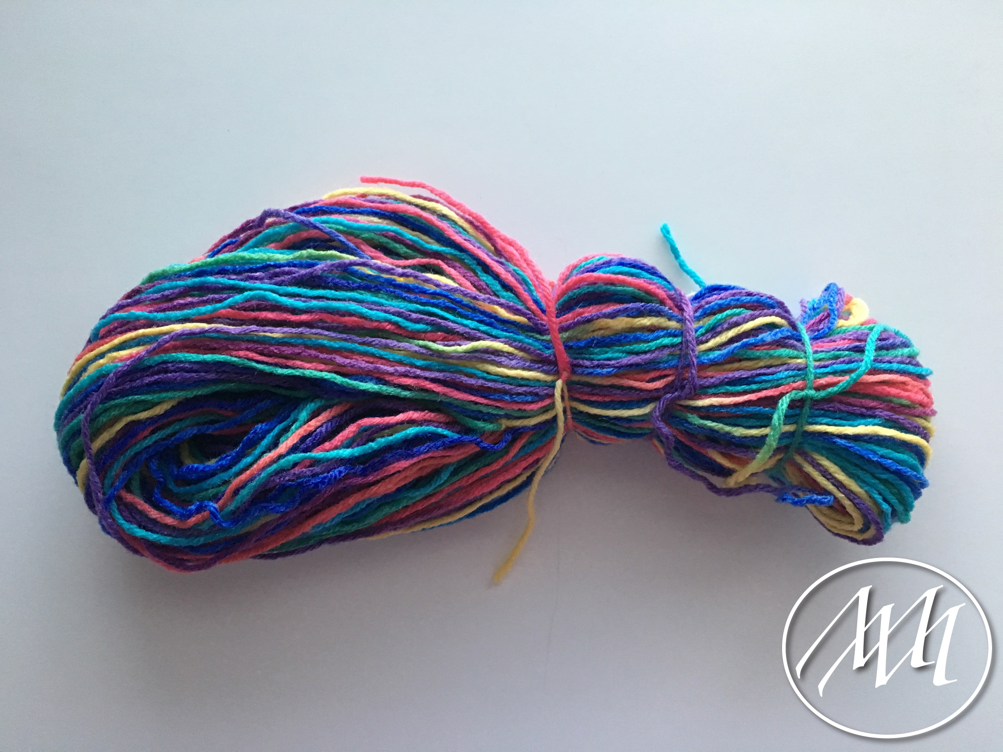 Carefully pull the yarn off the posts and lay on a solid surface. Cut 5-6 strands of yarn approximately 10-12”.