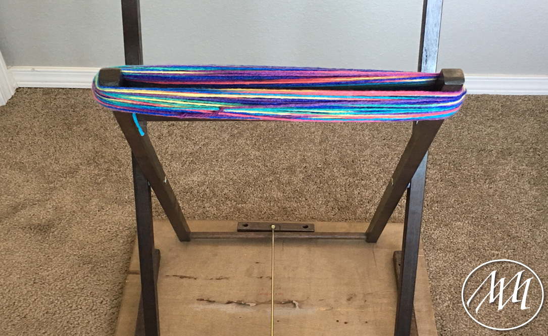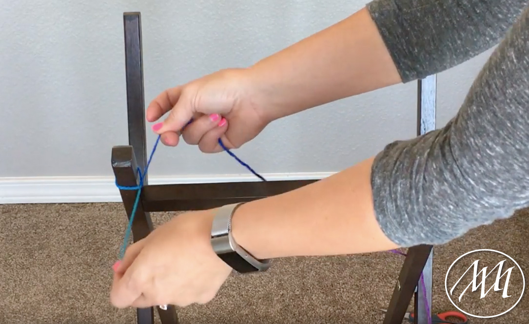 Tie the yarn on one of the posts and begin wrapping the yarn around between the two posts approximately 100 times. Once you get your desired thickness, cut the yarn and tie it off.