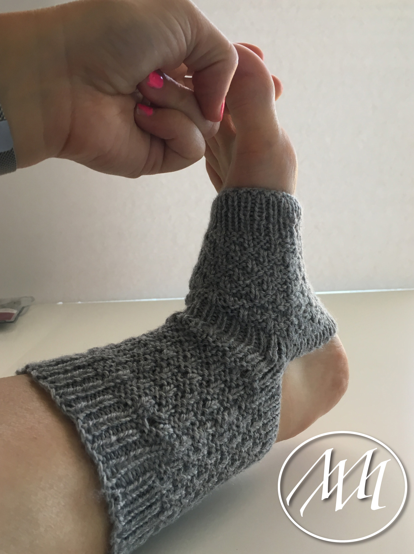 Cast on 64 stitches loosely. Divide into 32 stitches on each needle. Join in round. Place a stitch marker on the first stitch for beginning of round. I like to knit the first row before I begin the pattern so the sock is loose enough to fit comfortably, but this is not required.