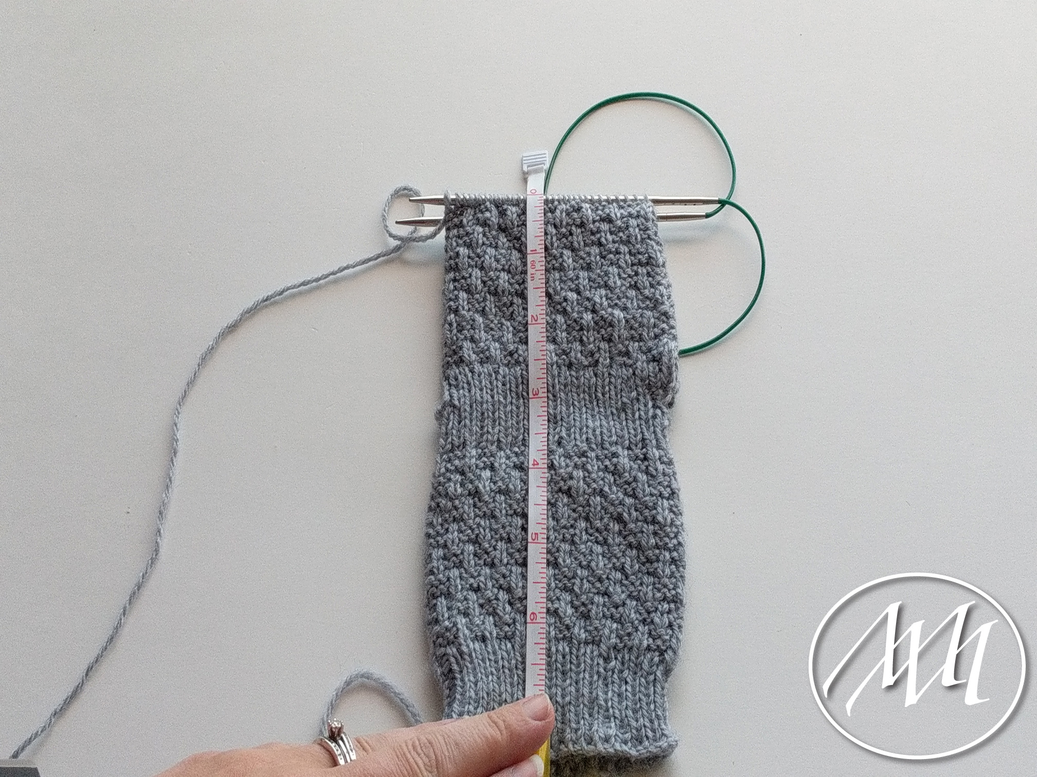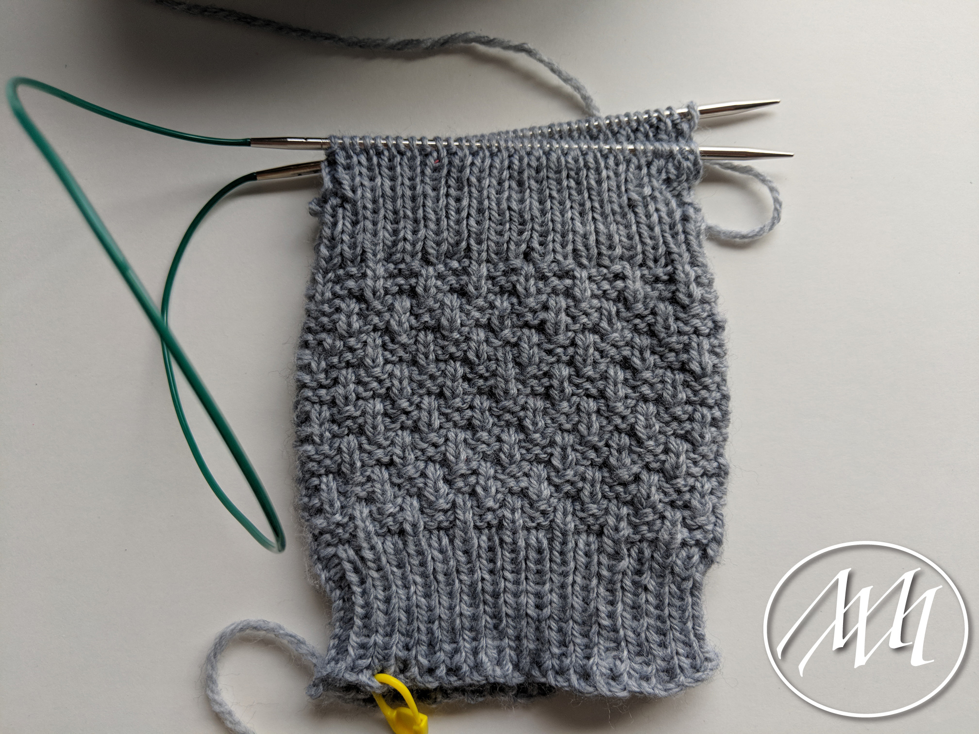 Knit the next round while decreasing 8 stitches evenly around (4 on each side) by knitting two stitches together. You should now have 64 stitches. Beginning on the second round of the texture pattern, work 2 ½” in the texture ending on the 1st or 5th (knit) round of pattern.