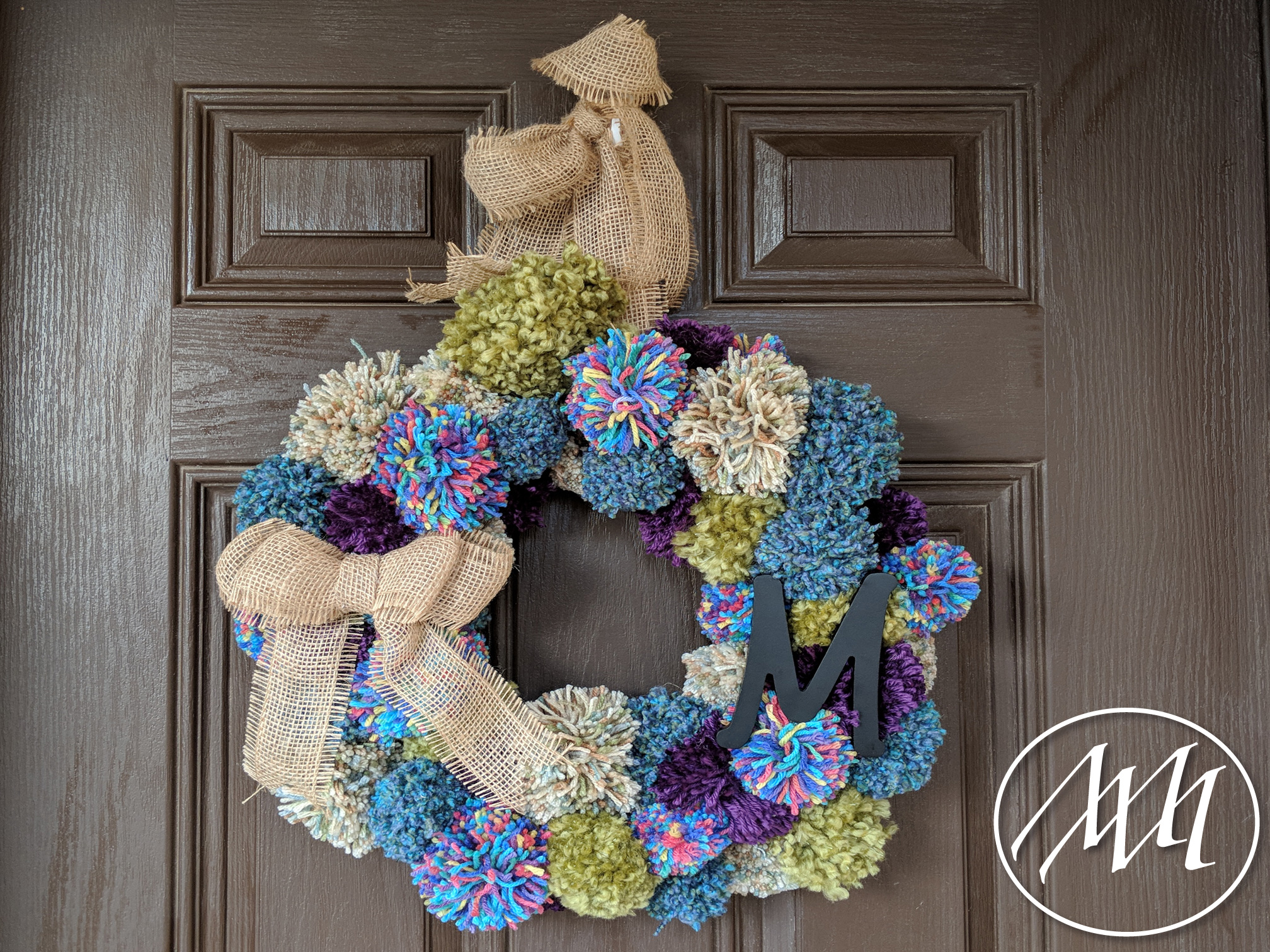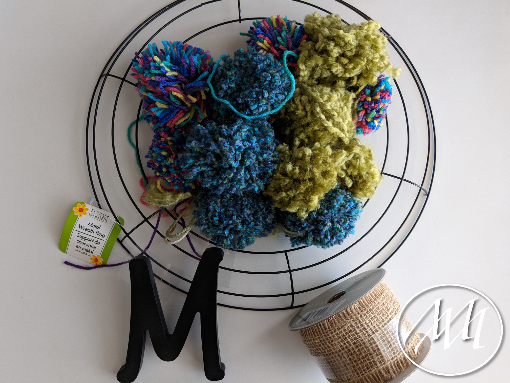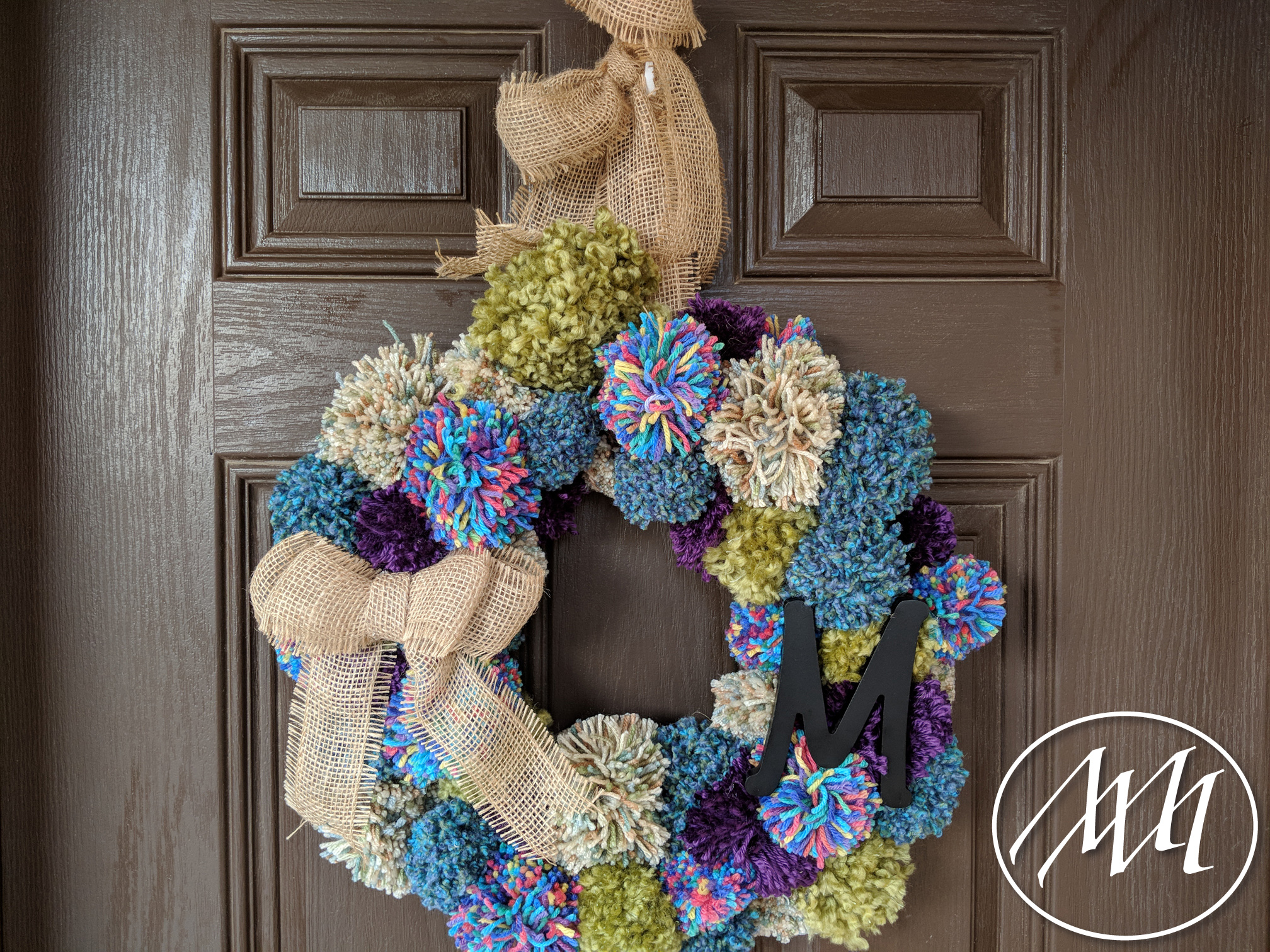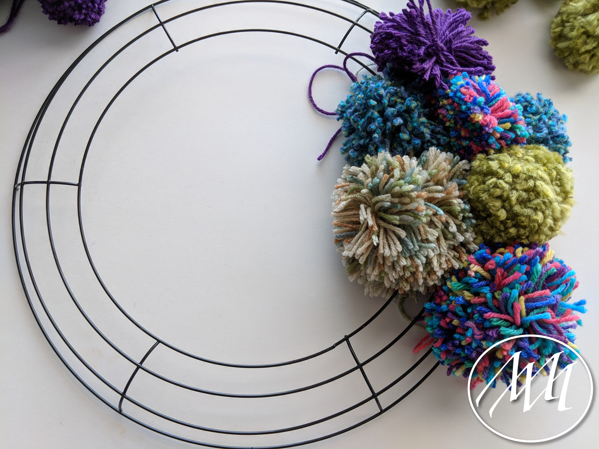 Tie the pom poms on the backside of the wreath in varying positions (Inside, outside, middle) all the way around the wreath form varying the colors. I liked tying a double knot; nothing fancy.