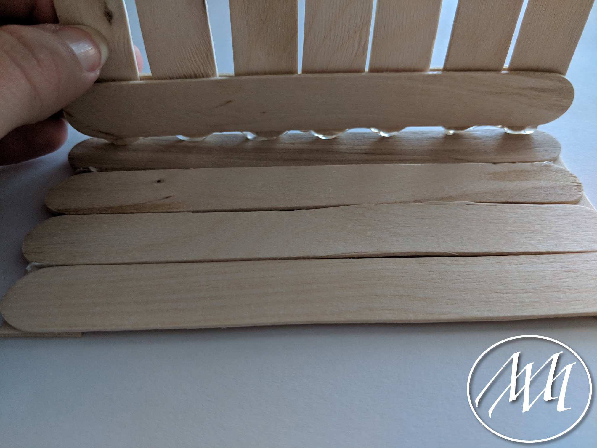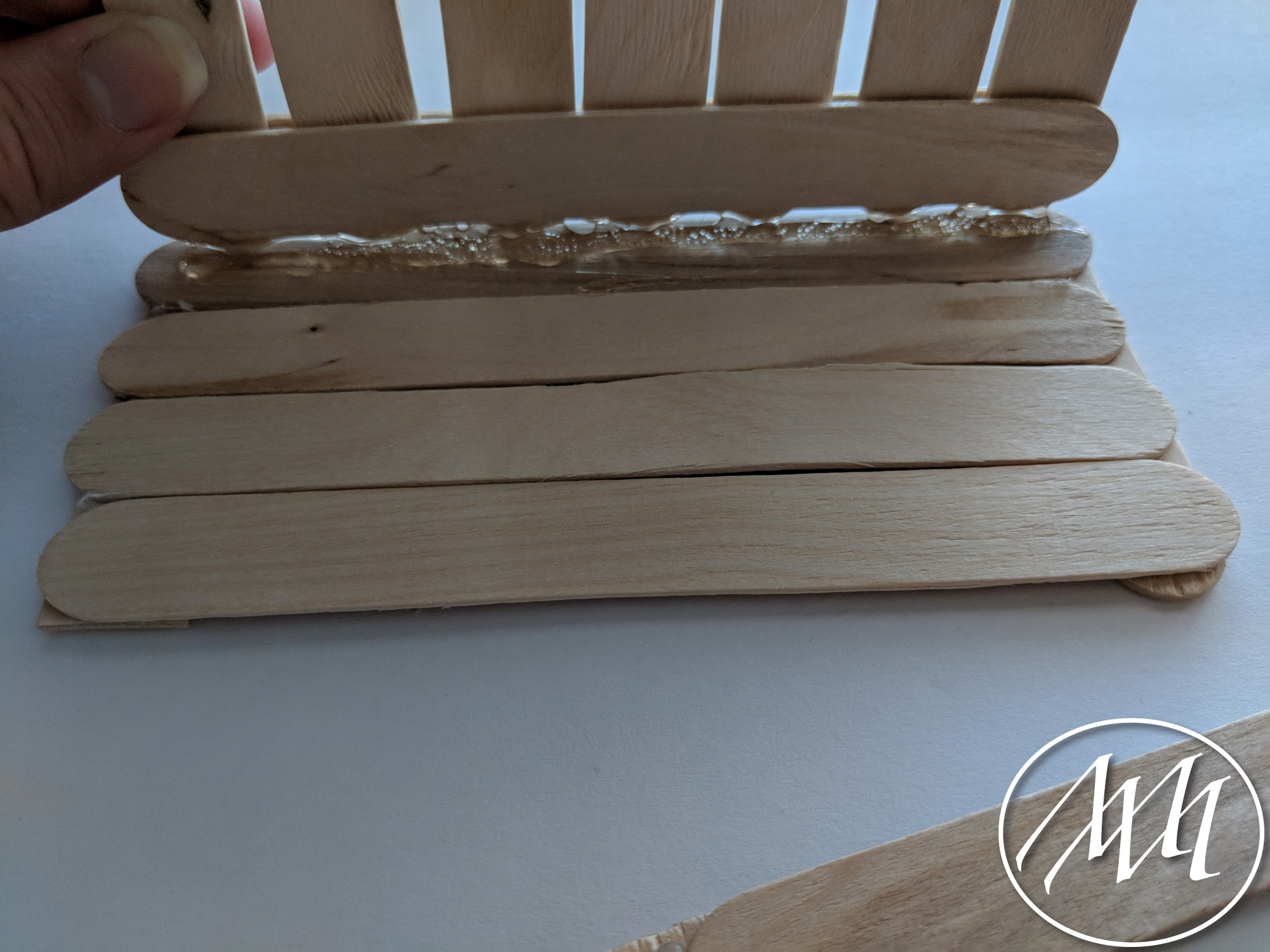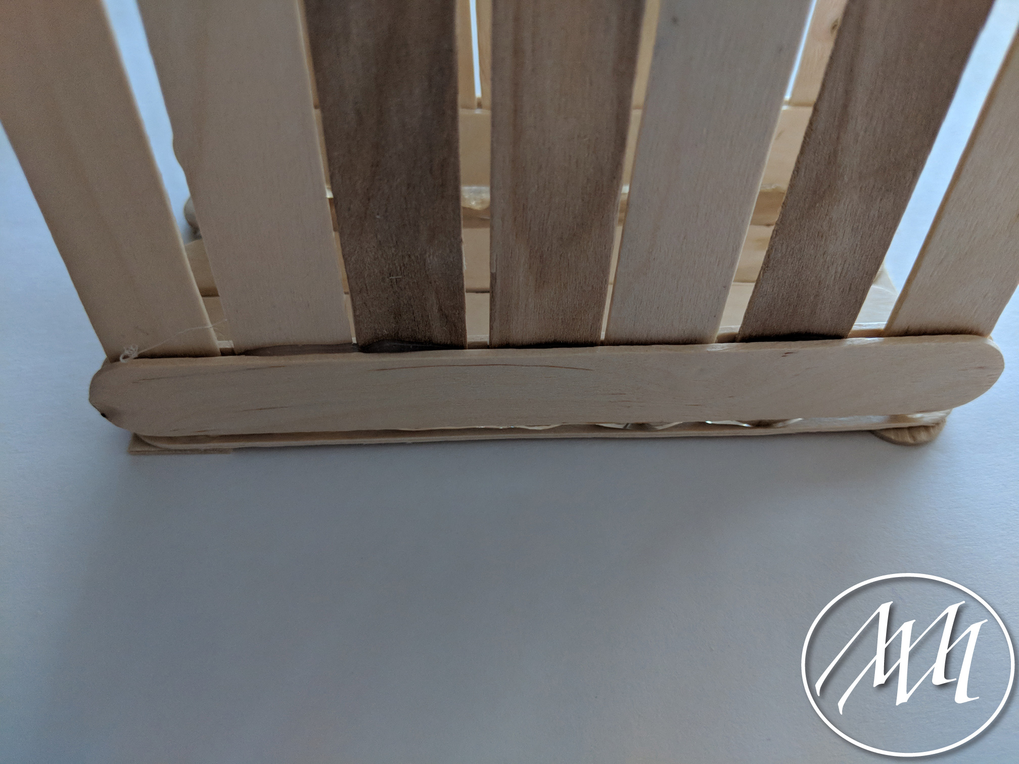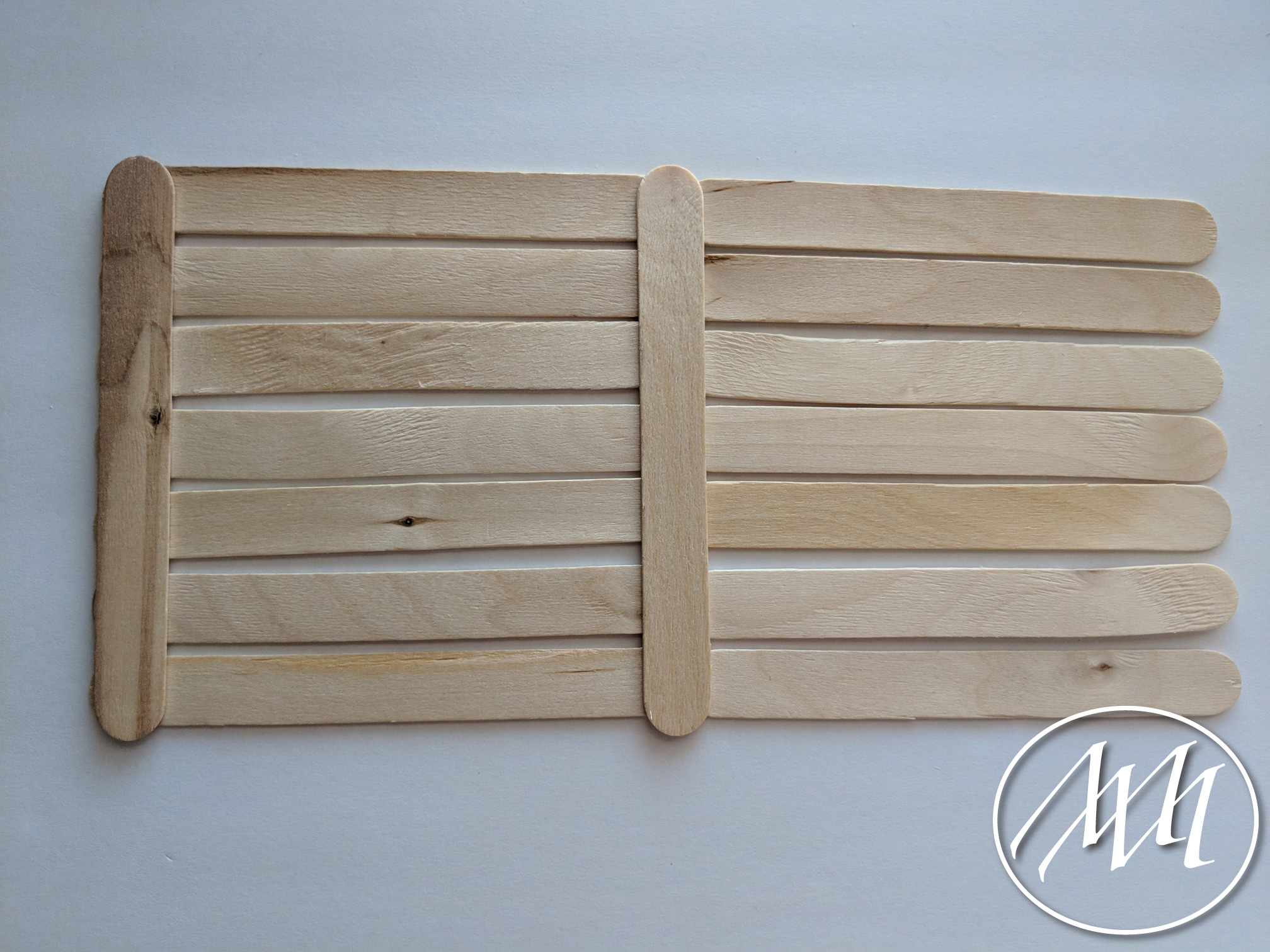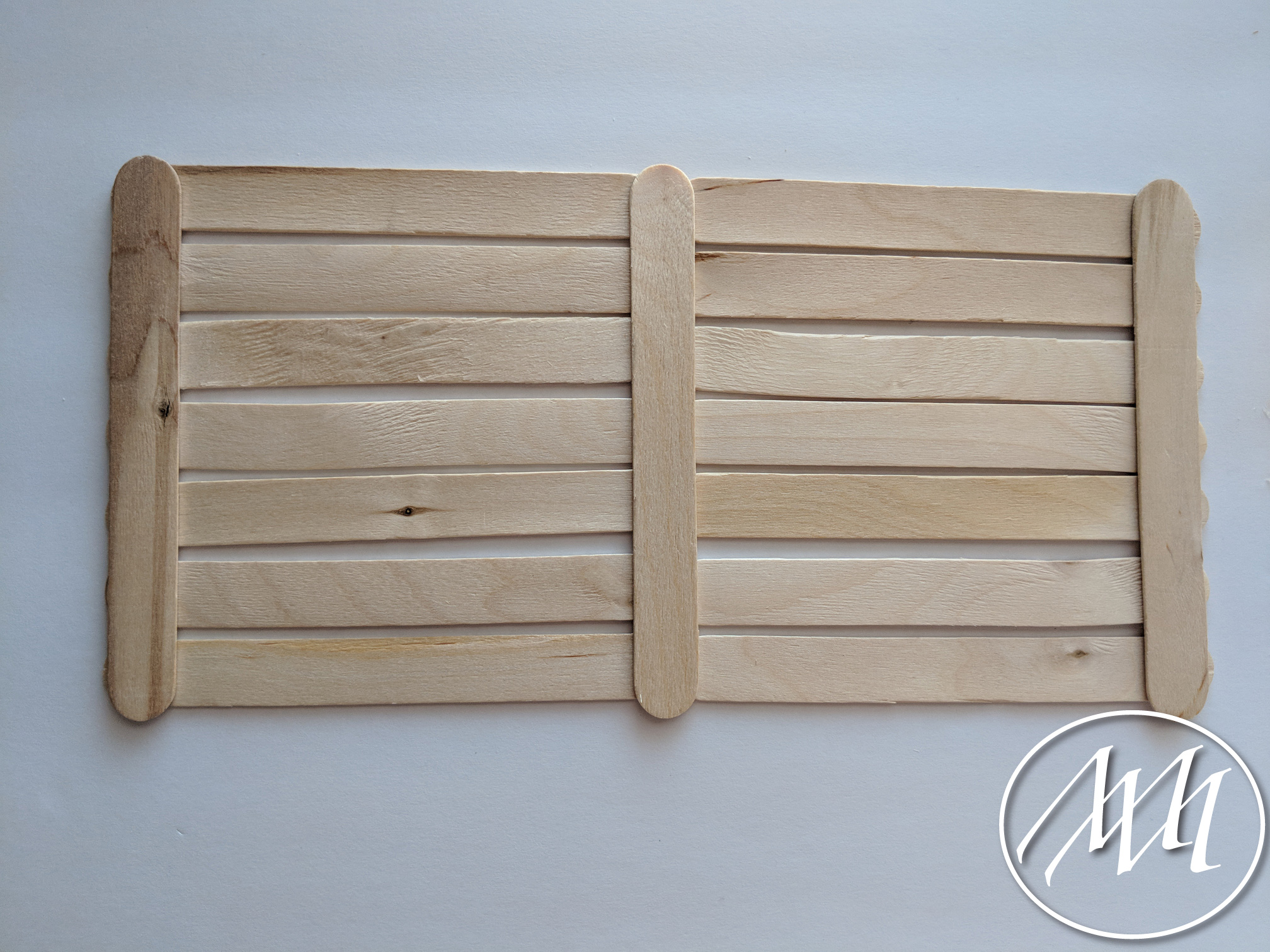 Lay out 3 popsicle sticks with just a little bit of spacing in between each one, as you previously did on the last step with more sticks. Cut a popsicle stick to fit the height of the three sticks. Attach with hot glue on one side. Repeat this process and connect in the middle with another cut popsicle stick.