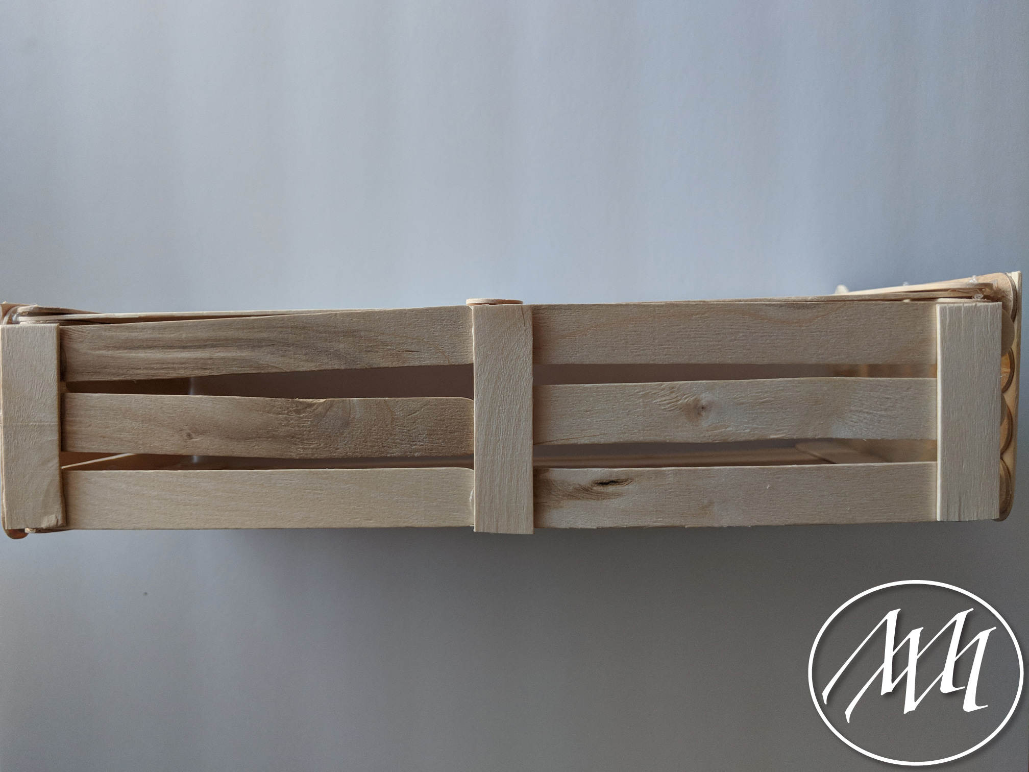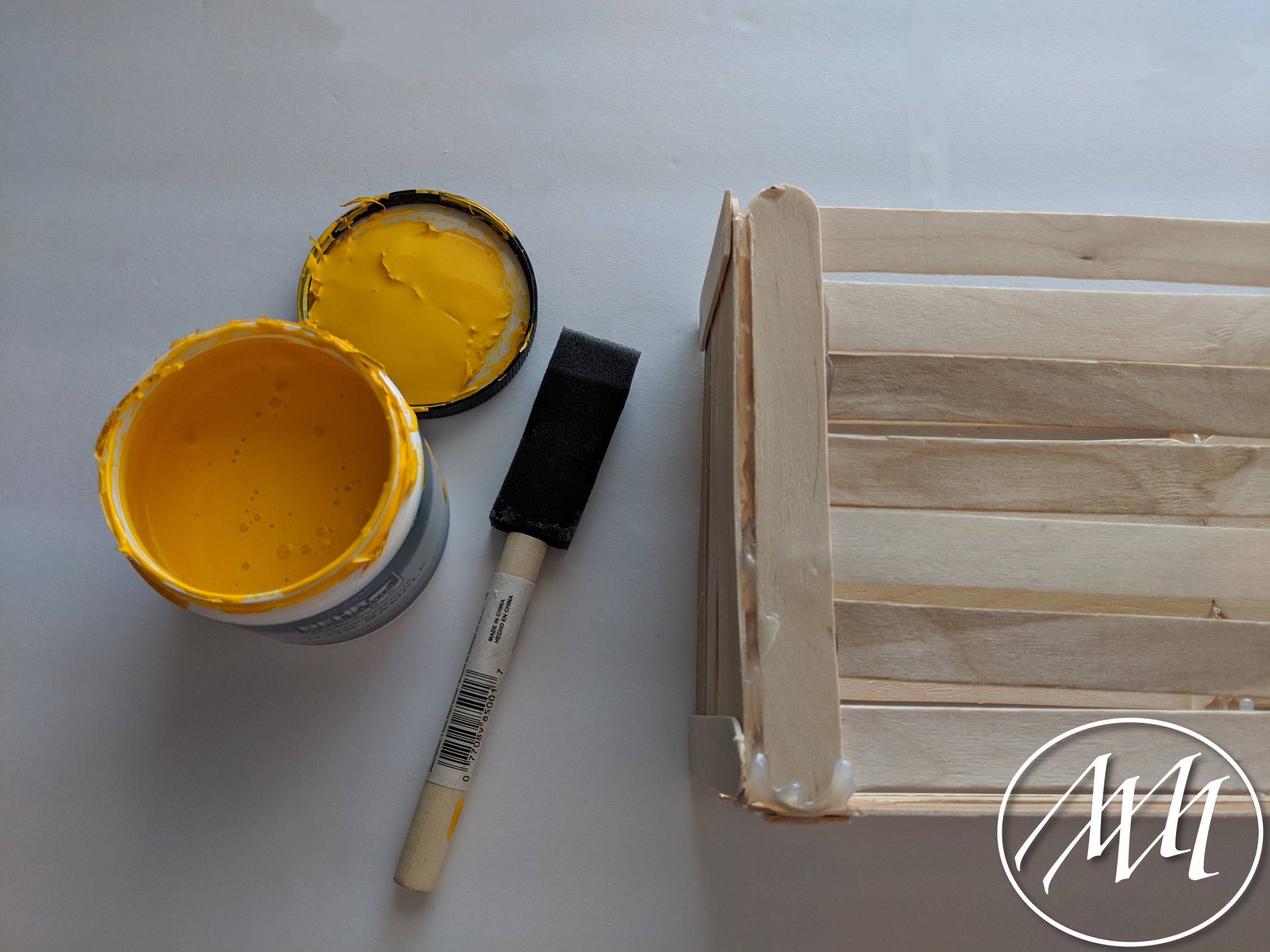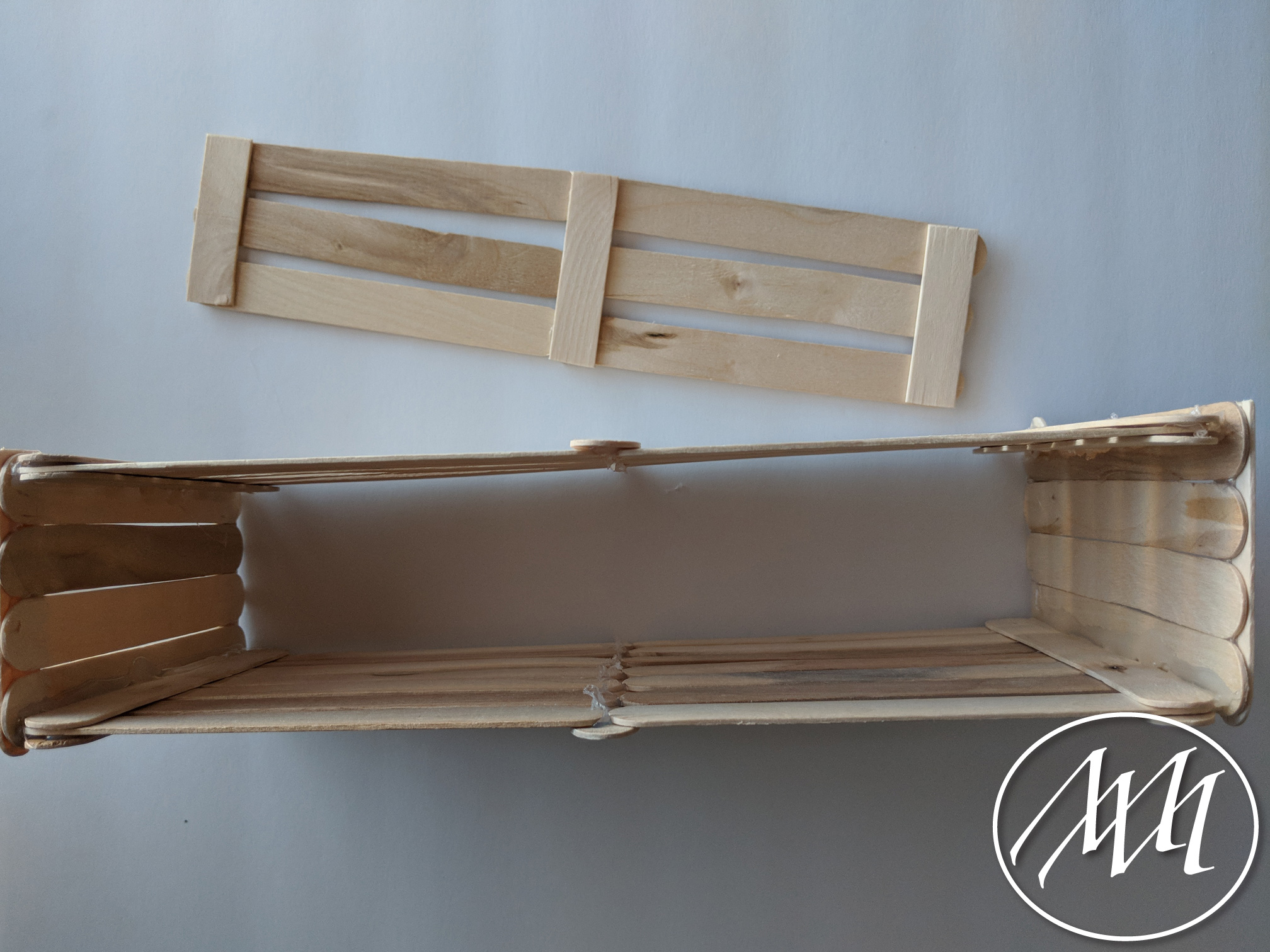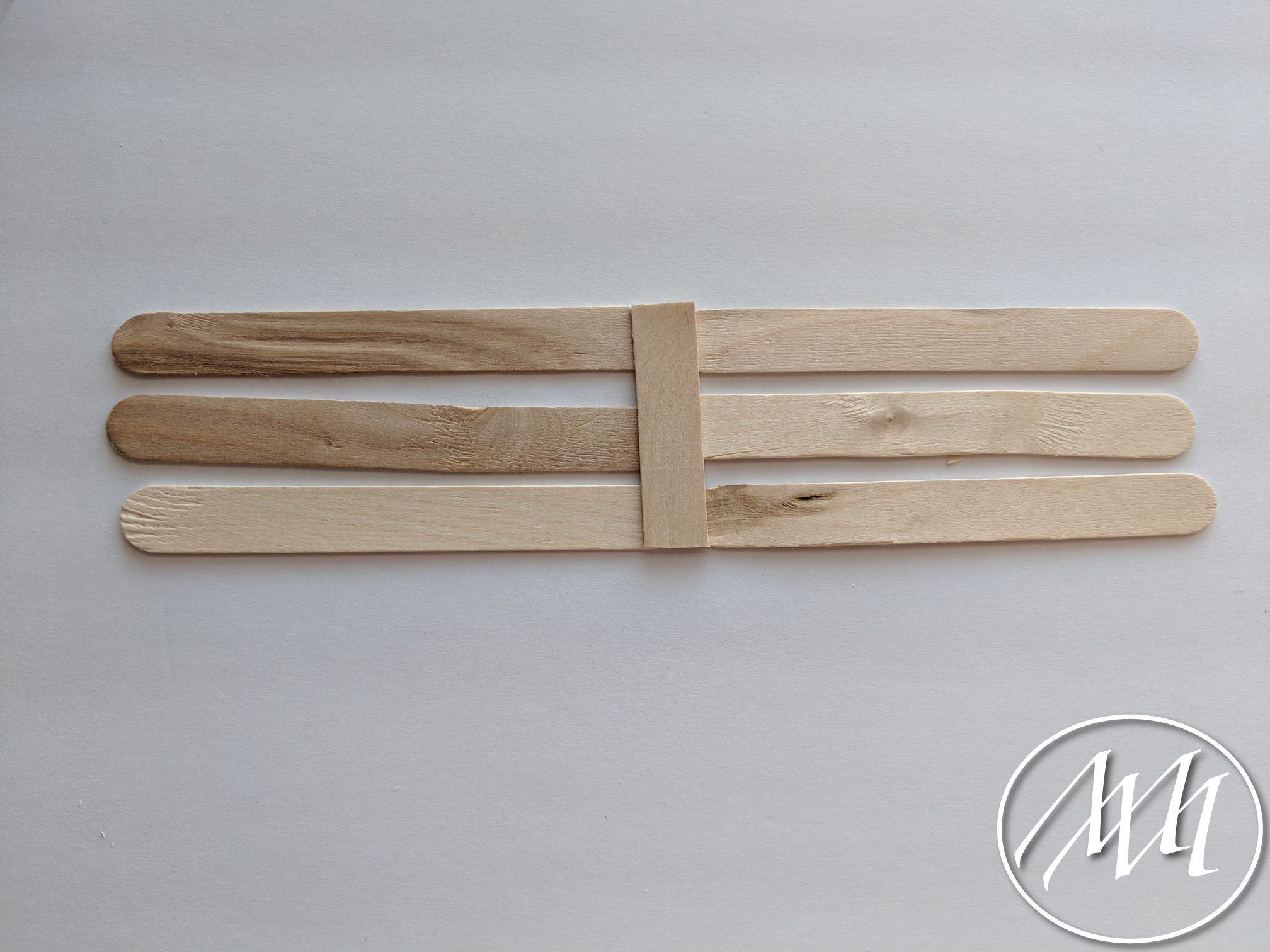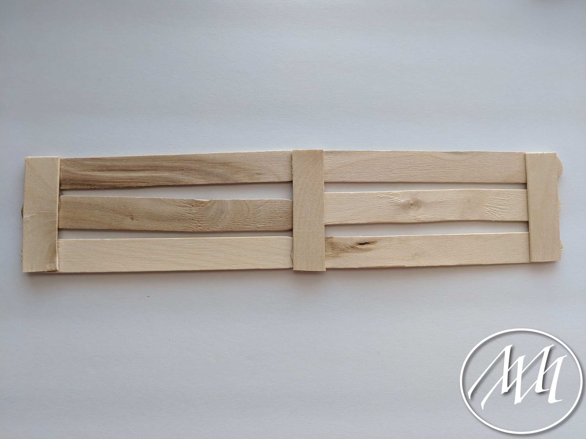 Lay out 3 popsicle sticks with just a little bit of spacing in between each one, as you previously did on the last step with more sticks. Cut a popsicle stick to fit the height of the three sticks. Attach with hot glue on one side. Repeat this process and connect in the middle with another cut popsicle stick.