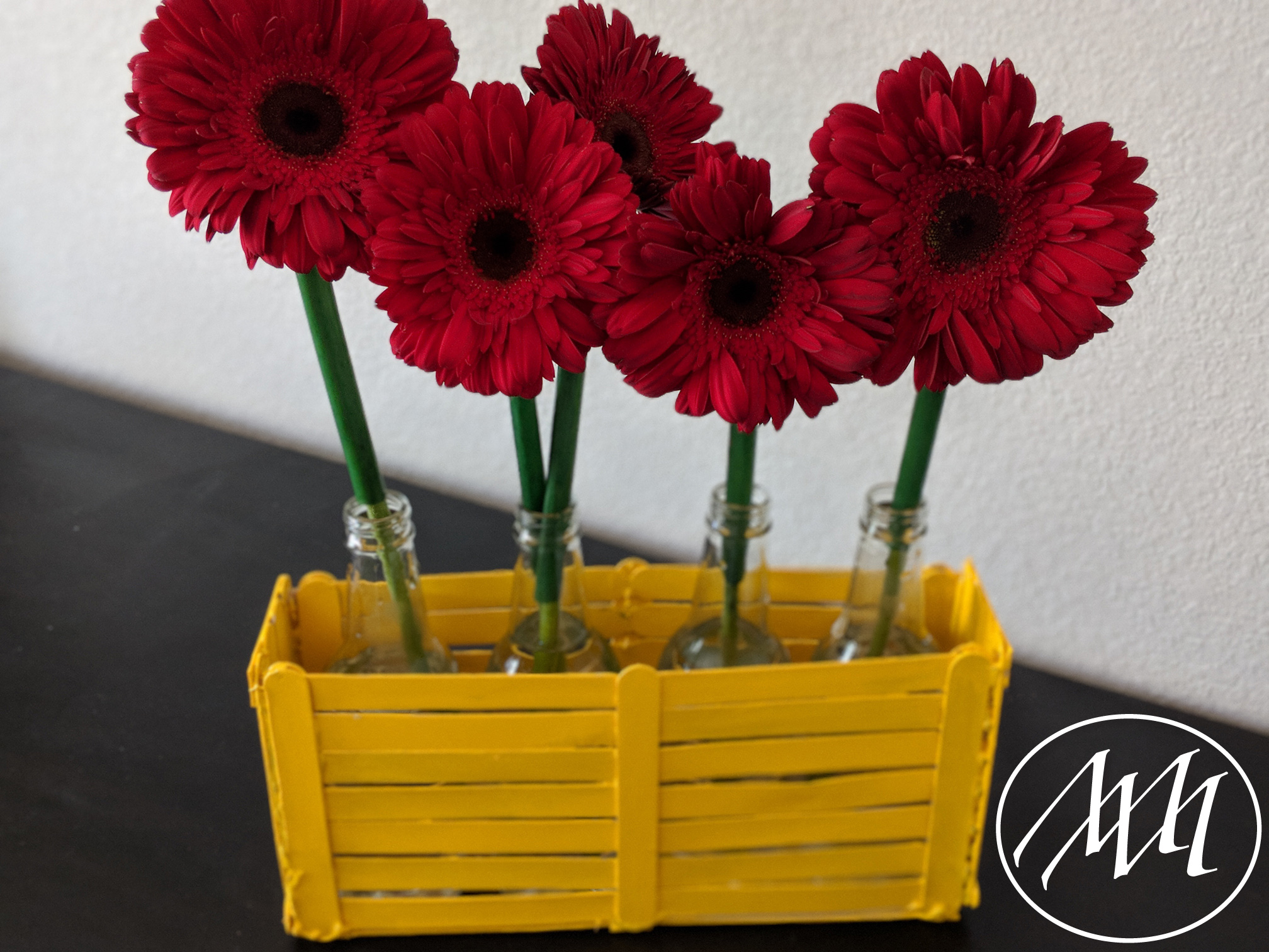 Add some water to the bottles and place them inside your centerpiece. Place your flowers into the bottles and enjoy your beautiful centerpiece!