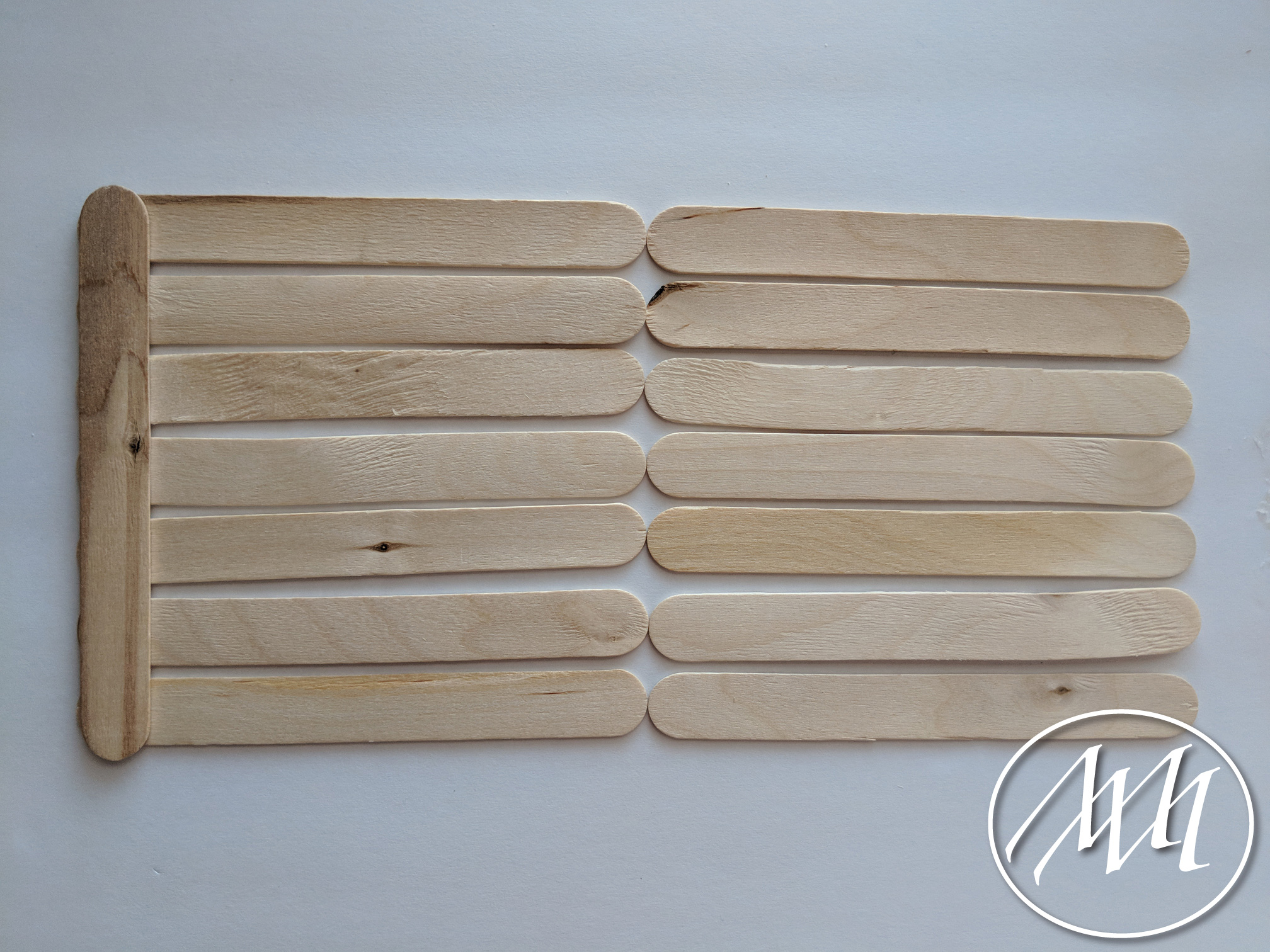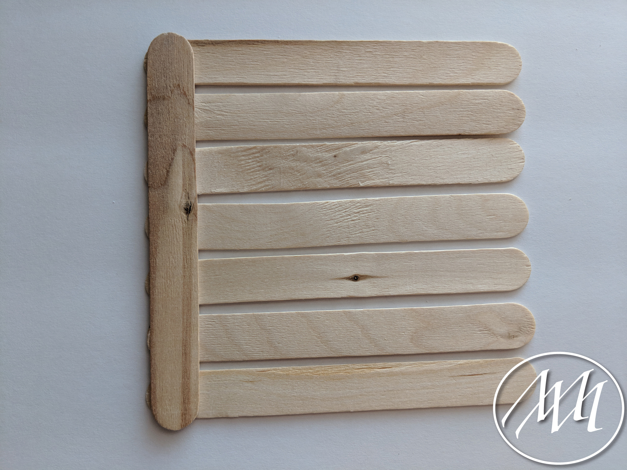 Lay out 7 popsicle sticks with just a little bit of spacing in between each one. Apply some hot glue down the length of a stick and attach it to one side to connect the 7 sticks together. Repeat this process 3 more times, or place 7 more sticks together to match the other side. Attach at the other side to hold those 7 sticks together.