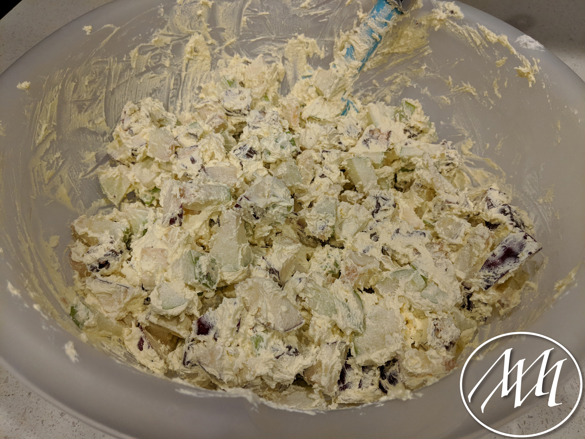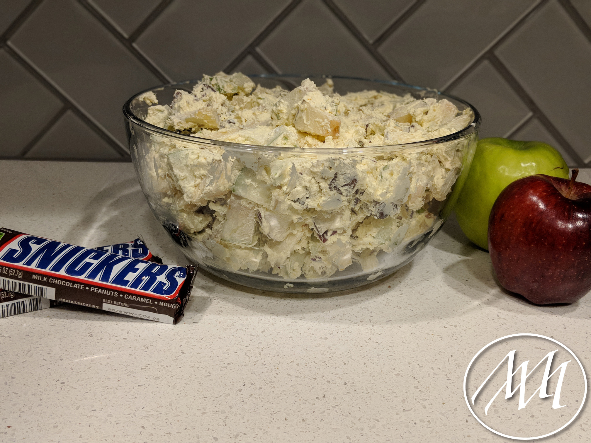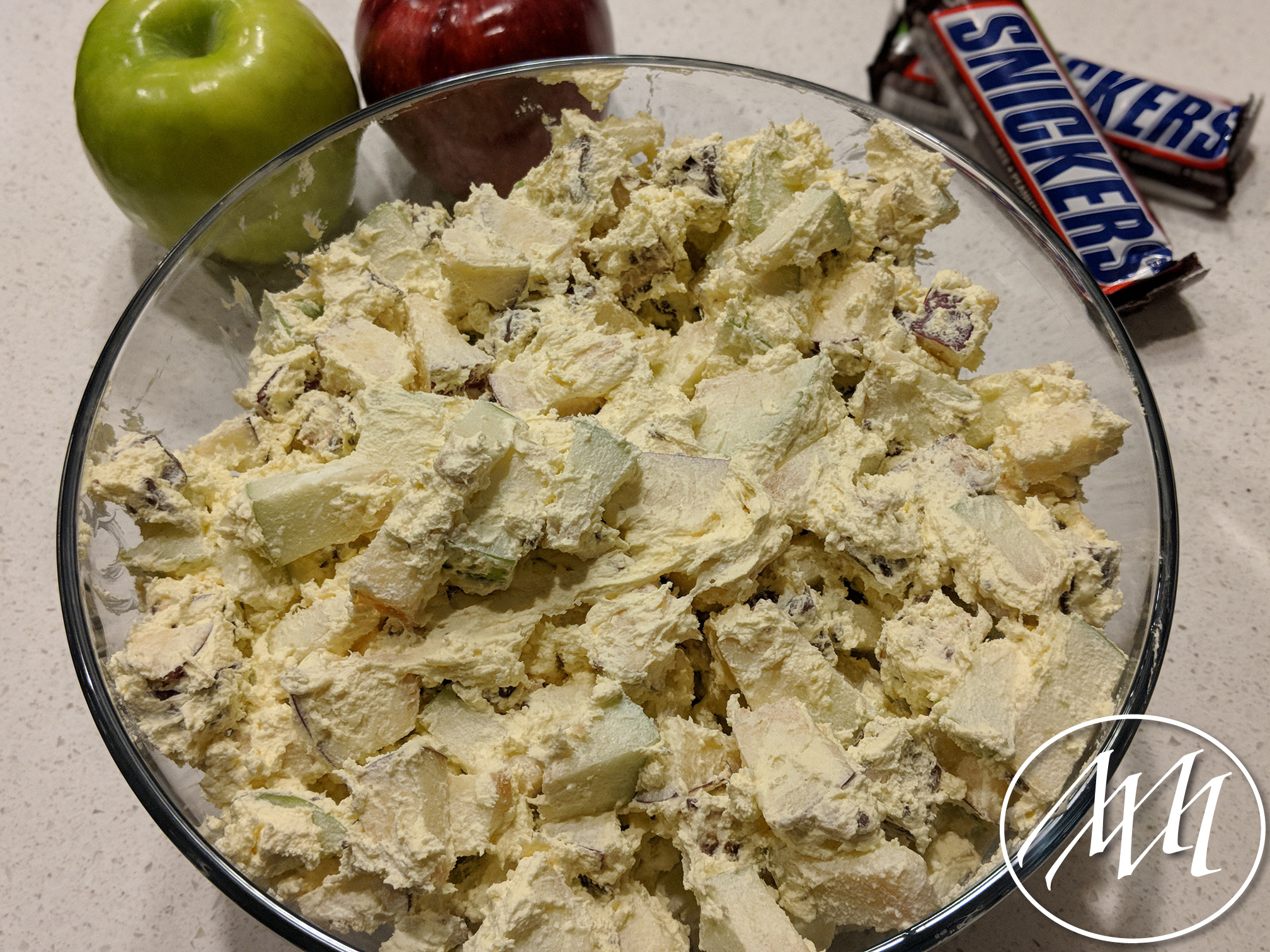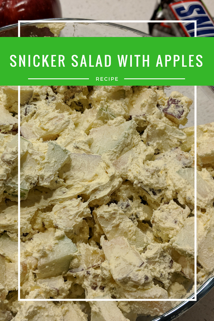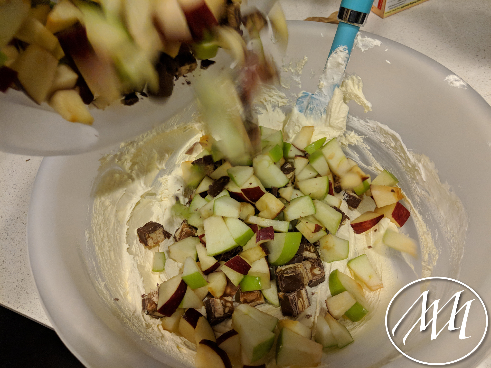 Add the apples and Snickers candy bar into the bowl with the cool whip mixture and stir until well combined.