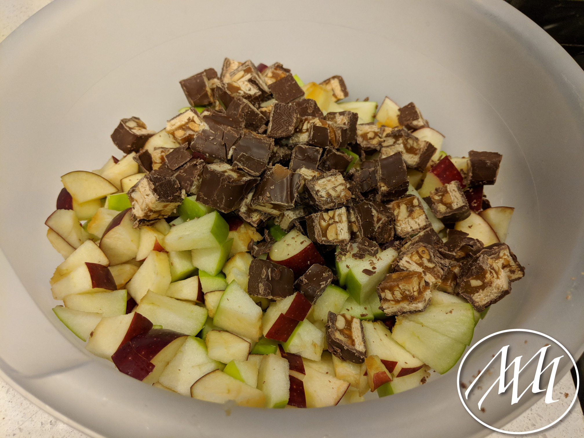 Cut up the Snickers into bite-sized pieces. I usually cut them in half lengthwise and then into smaller pieces from there. Place them in the bowl with your apples.