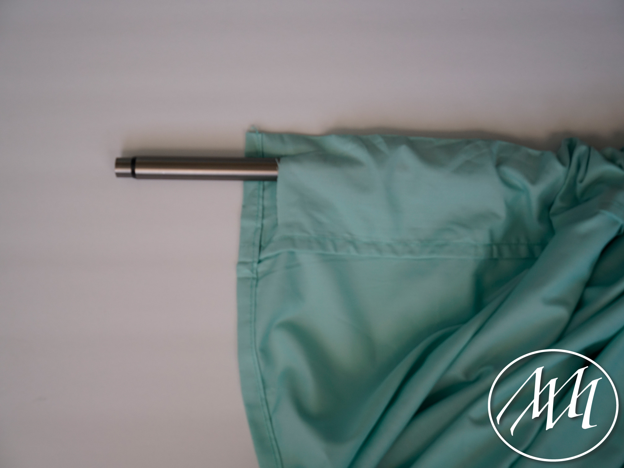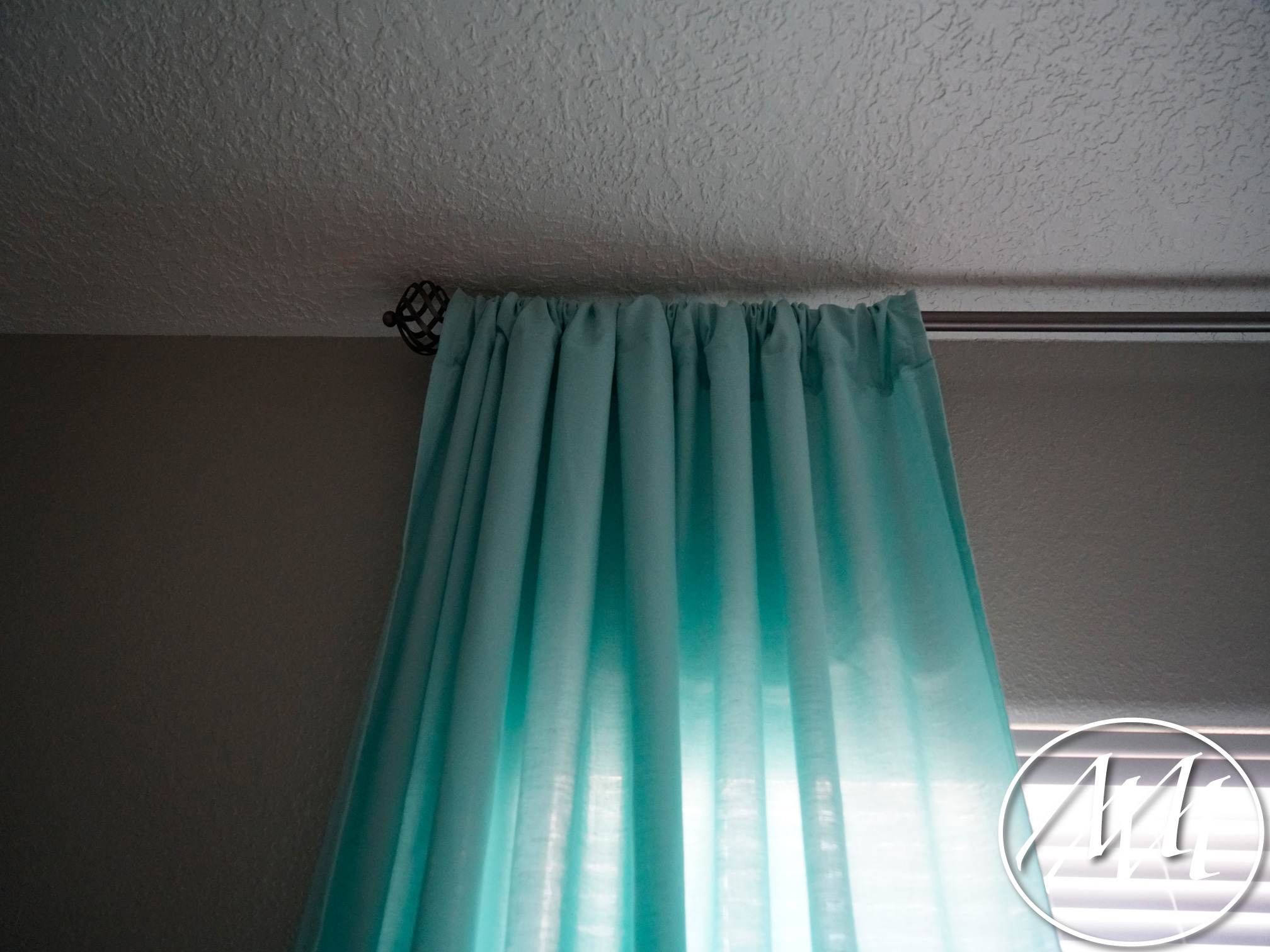 Attached your curtains to your curtain rod by sliding the post through the hole you created on the top of the seam. Attach your finale to help it stay in place. Repeat for the second one on the other side!