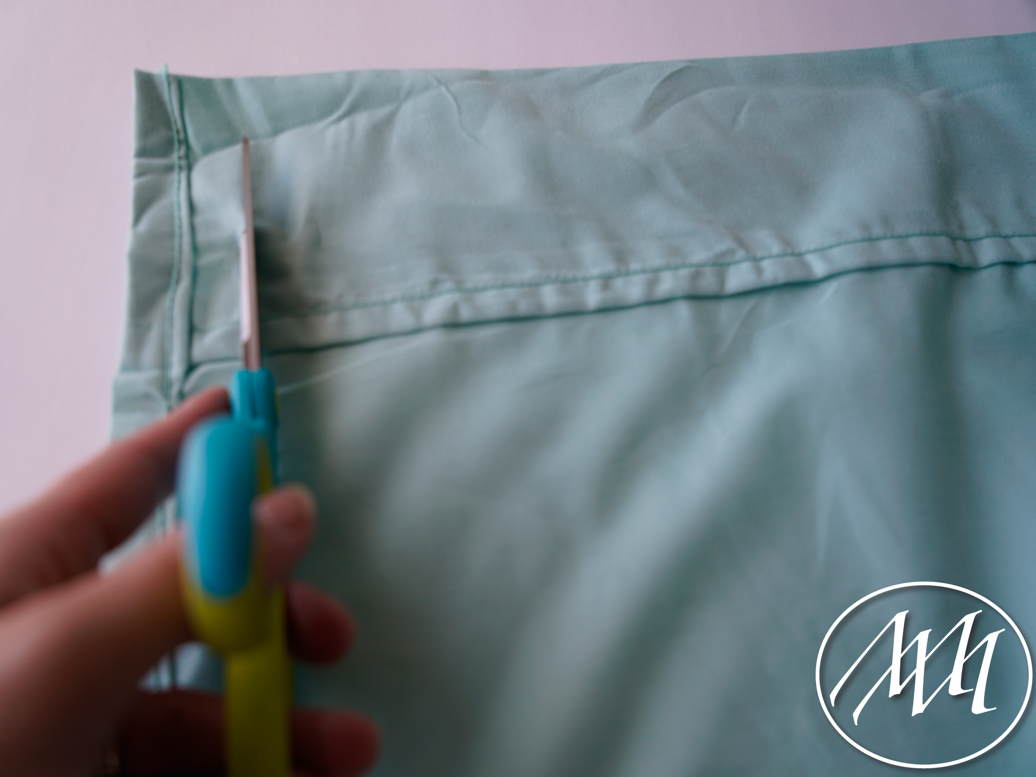 Locate the top of the sheet and on the inside of the sheet, cut a small 1 inch hole just along the corner of the sheet on both ends. NOTE: Pinch the fabric together being careful not to gather the outside or front of the fabric as well to start your hole.