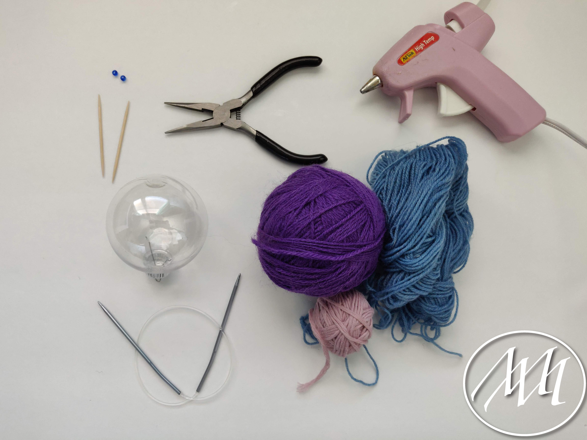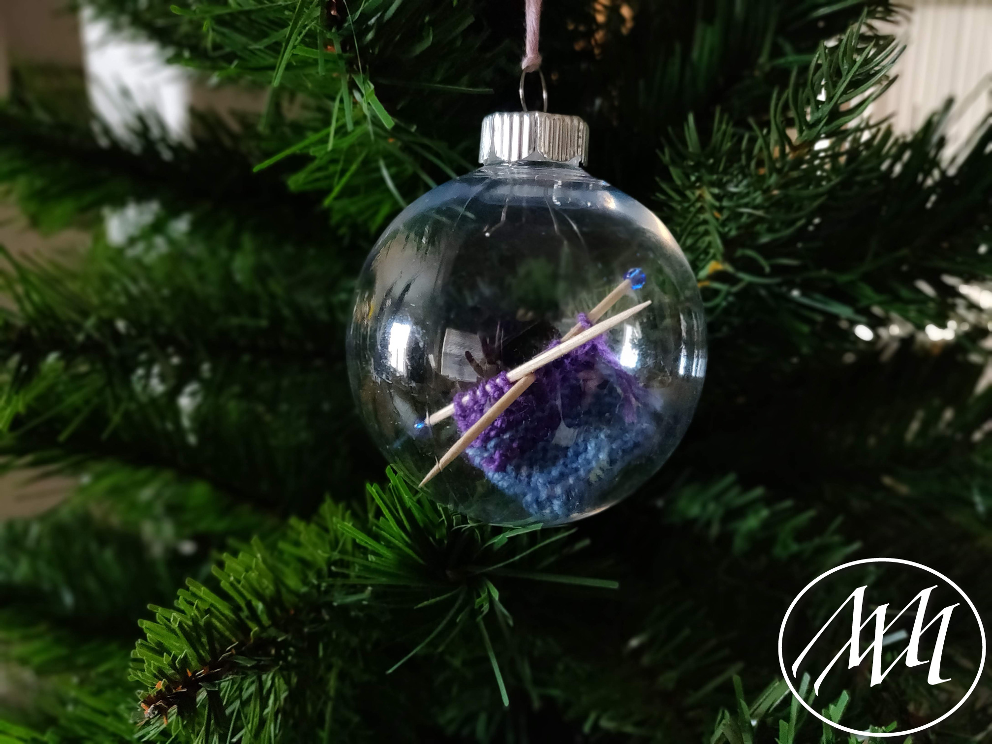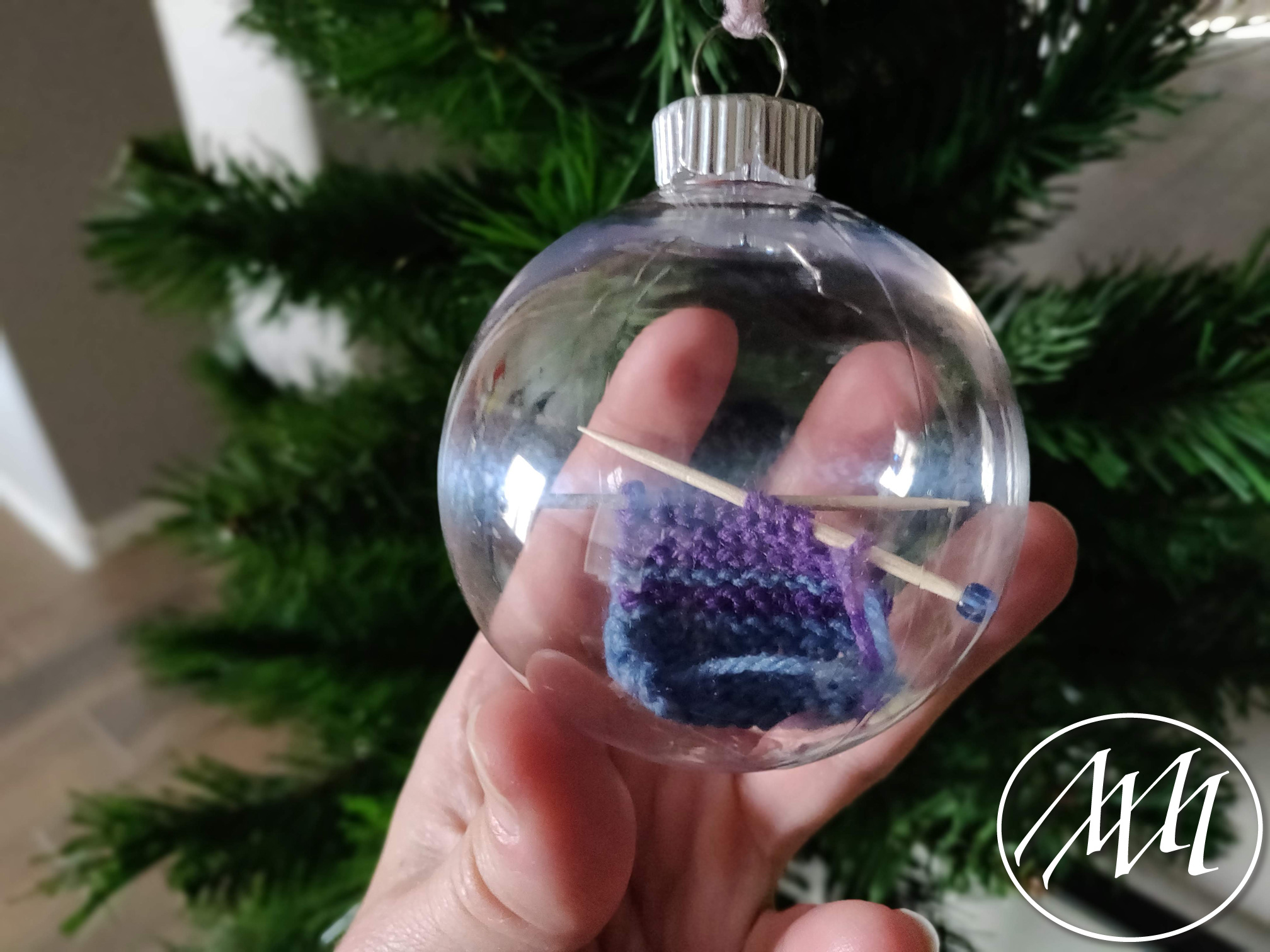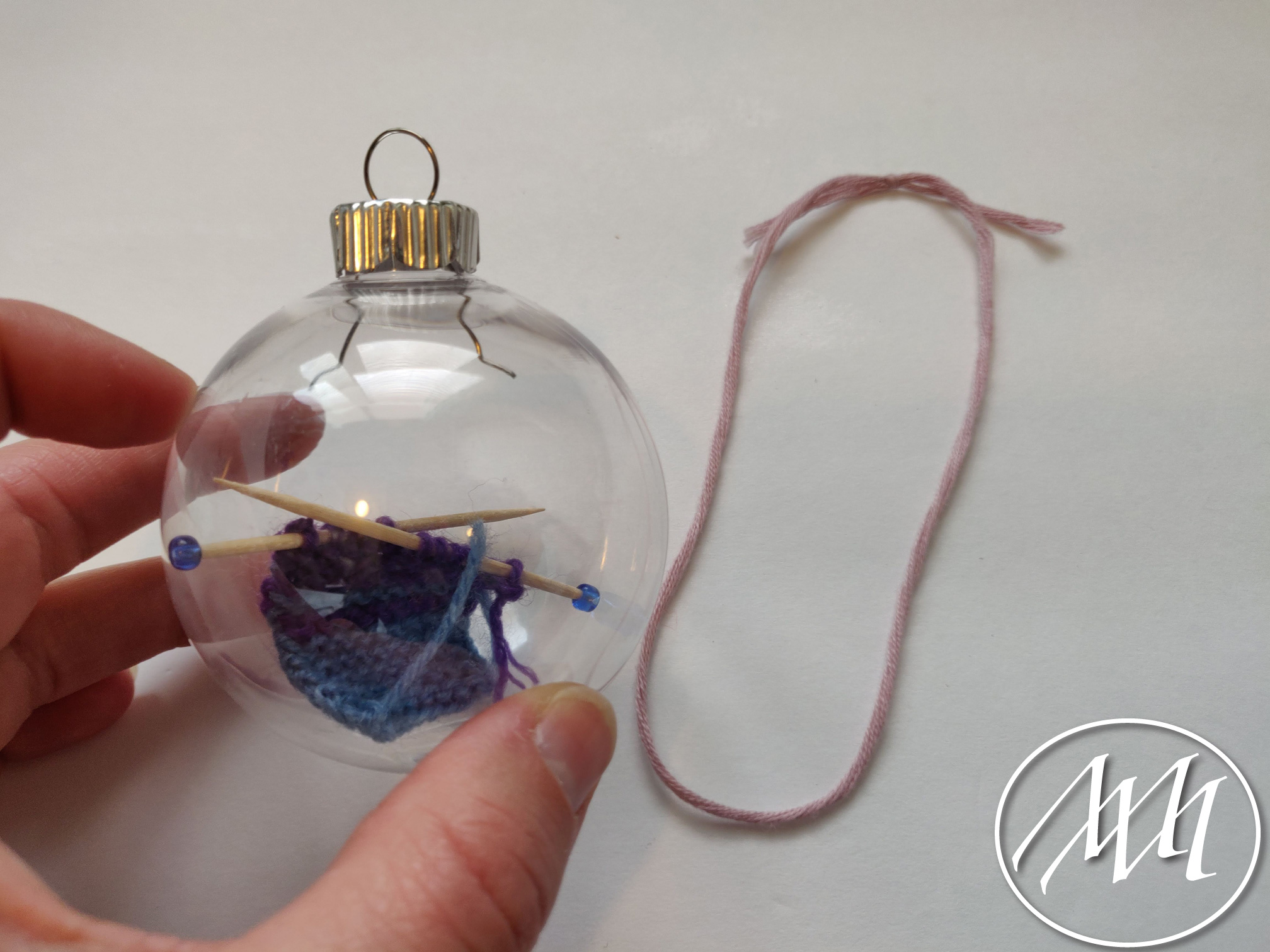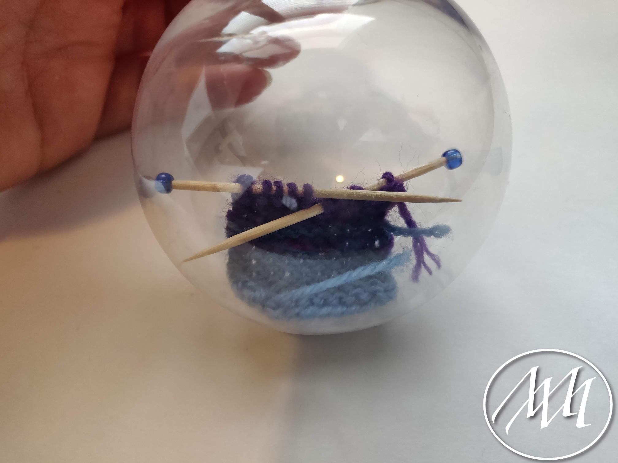 Roll up your knitting piece with the needles and put them inside your clear ornament. You may need to shake your ornament a little bit until it settles where you want it.