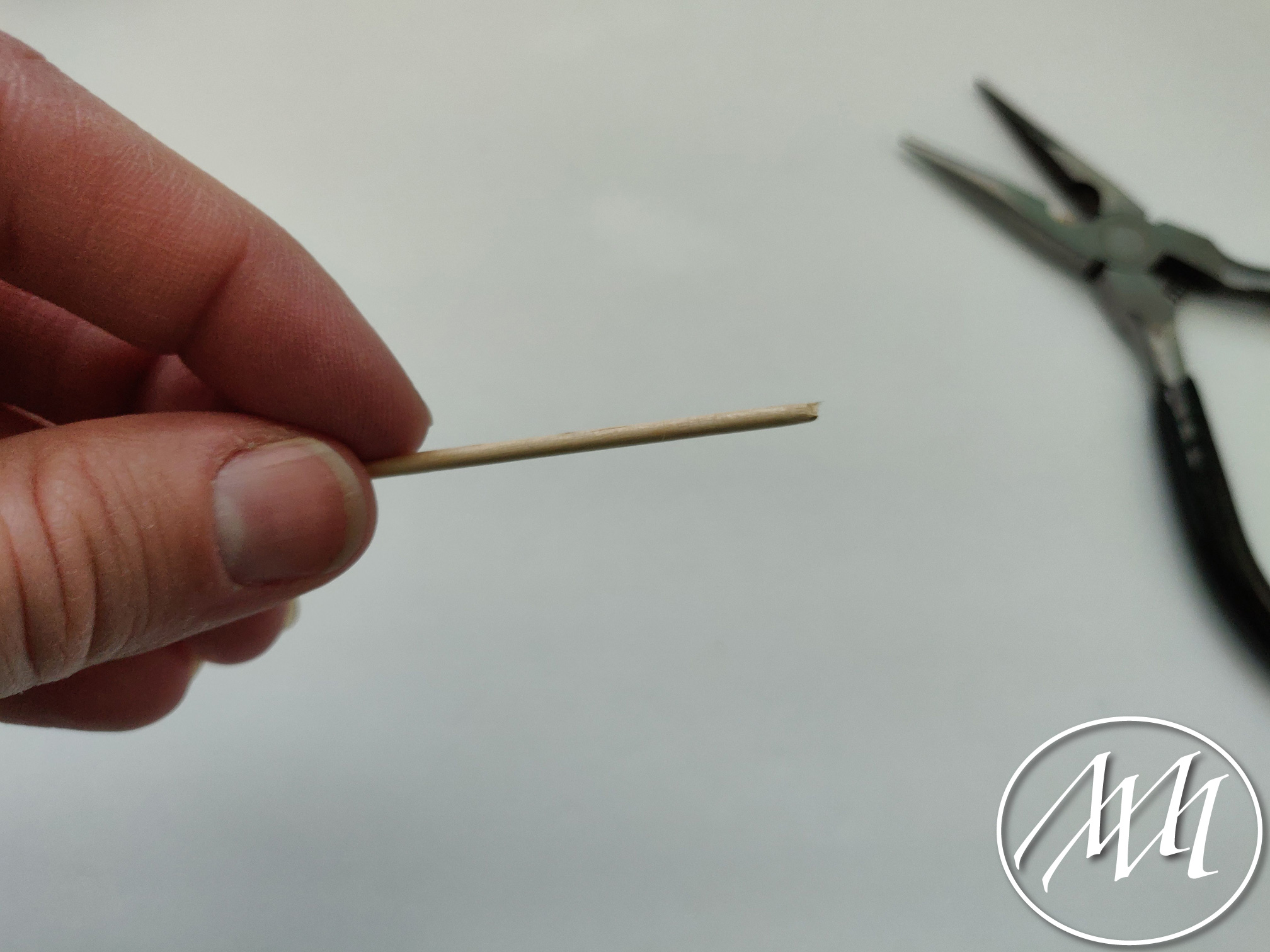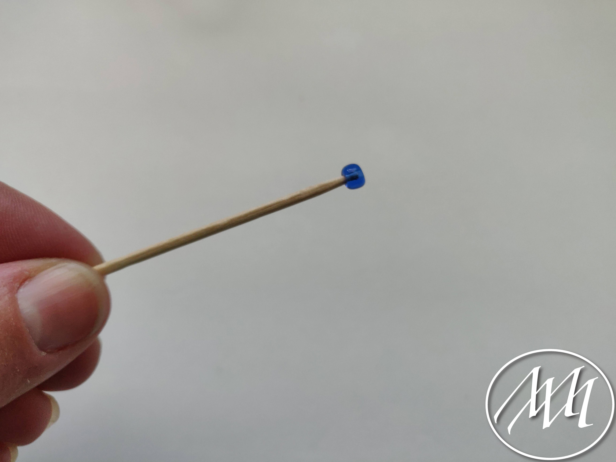 Add a little bit of glue to the end of your toothpick and attach your seed bead. These are your “knitting needles”.